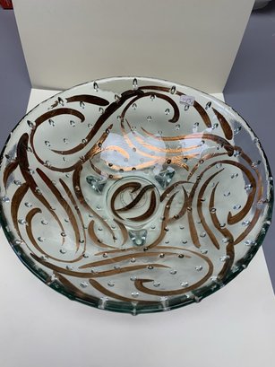 The Tamara Childs 7.5" Beaded Glass Footed Bowl features elegant swirl patterns in copper, adding a touch of luxury to any dining table or display. Handmade with art glass techniques, this bowl is not only functional but also a decorative piece that can enhance the aesthetic of any room. The clear glass with copper accents creates a stylish and sophisticated look, making it a perfect addition to any collection of pottery and glassware.