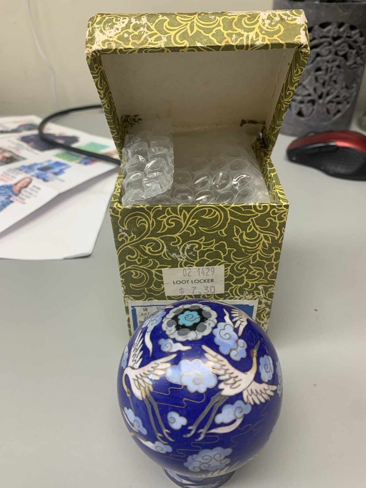 This vintage Chinese cloisonné sphere is a stunning piece of decorative collectible. It comes with a stand and its original box, making it a perfect addition to any collection. The sphere is multicolored and showcases an elegant Chinese style, making it a unique and eye-catching piece.