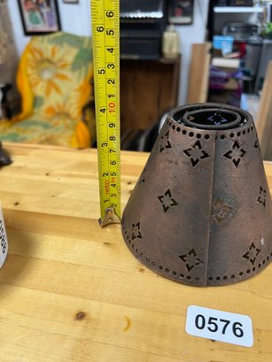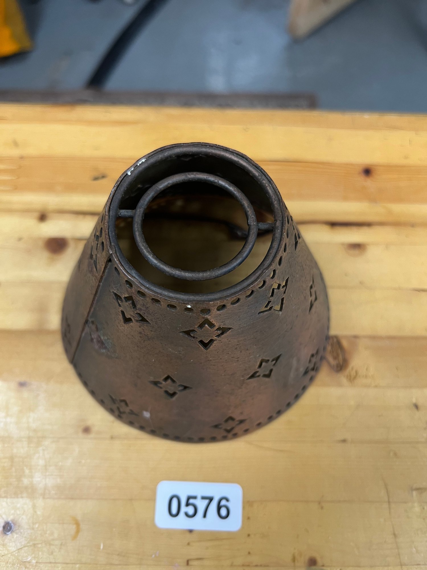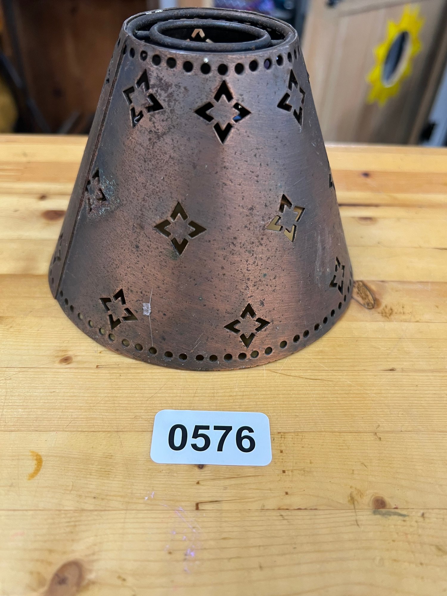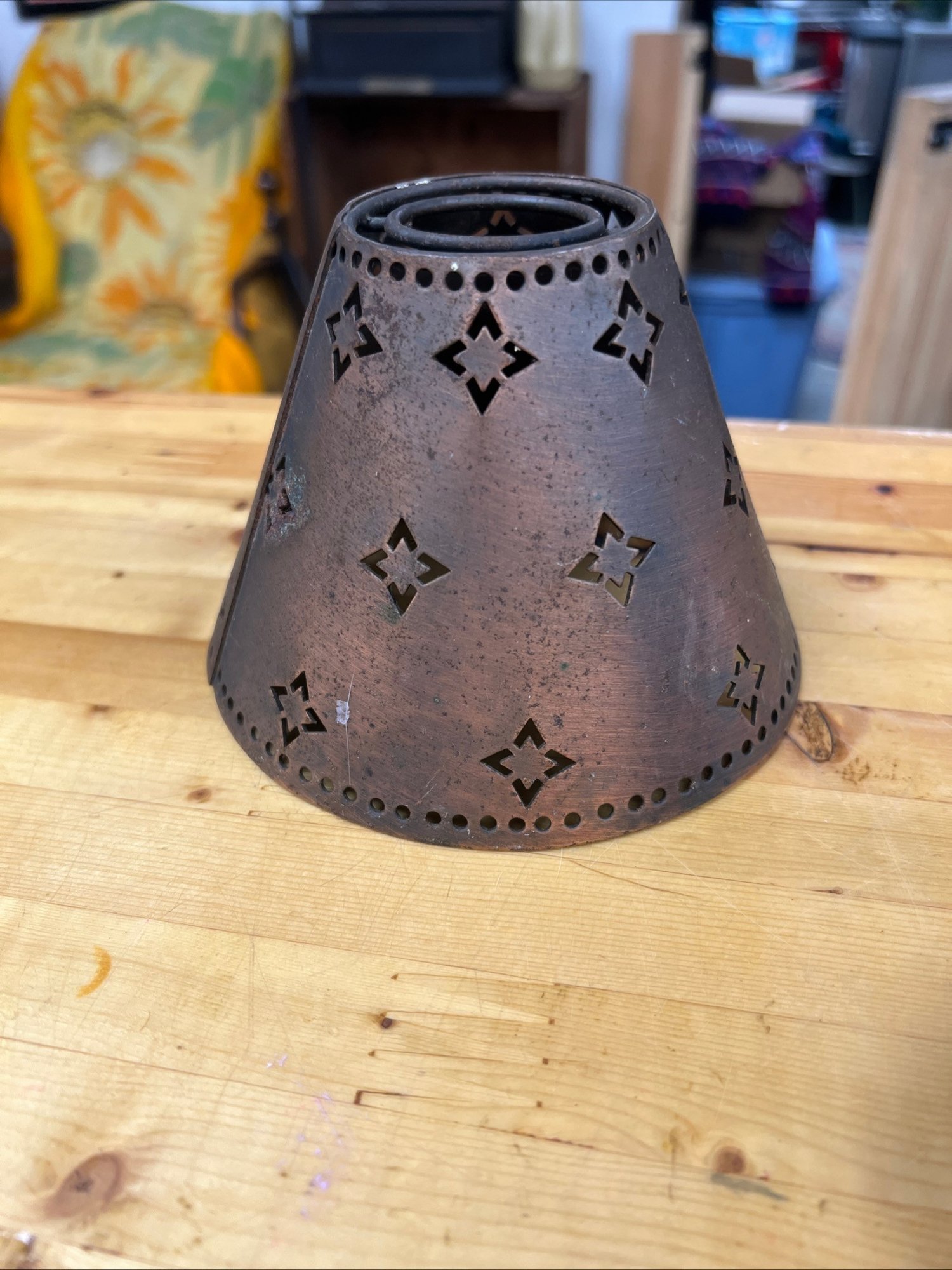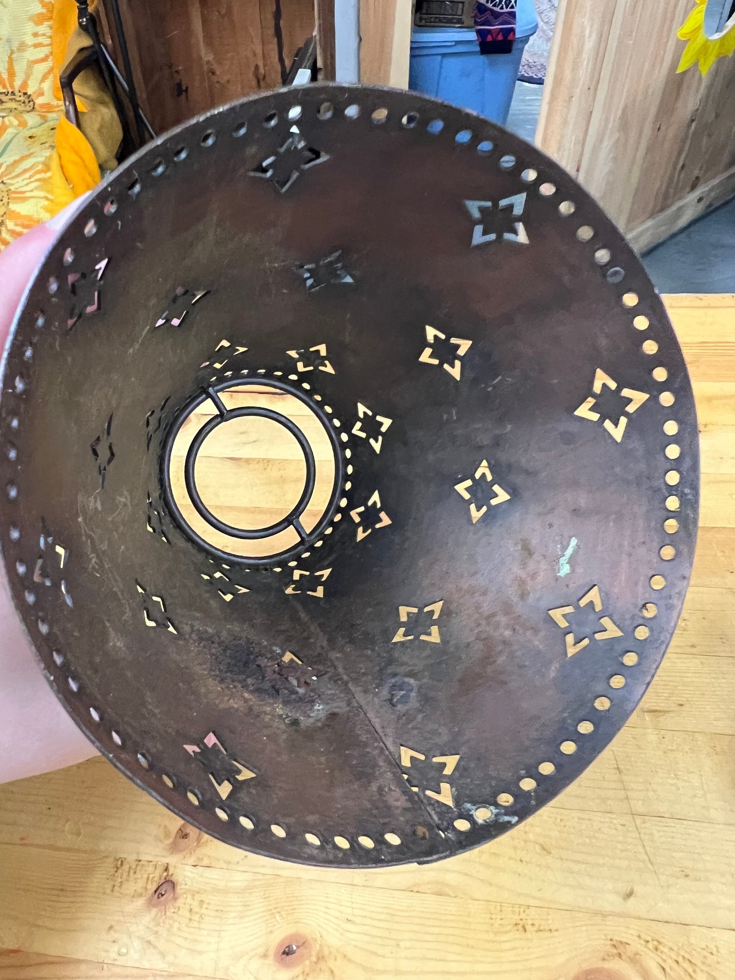 Rustic metal lamp shade with aged patina — perfect for farmhouse or restoration décor.