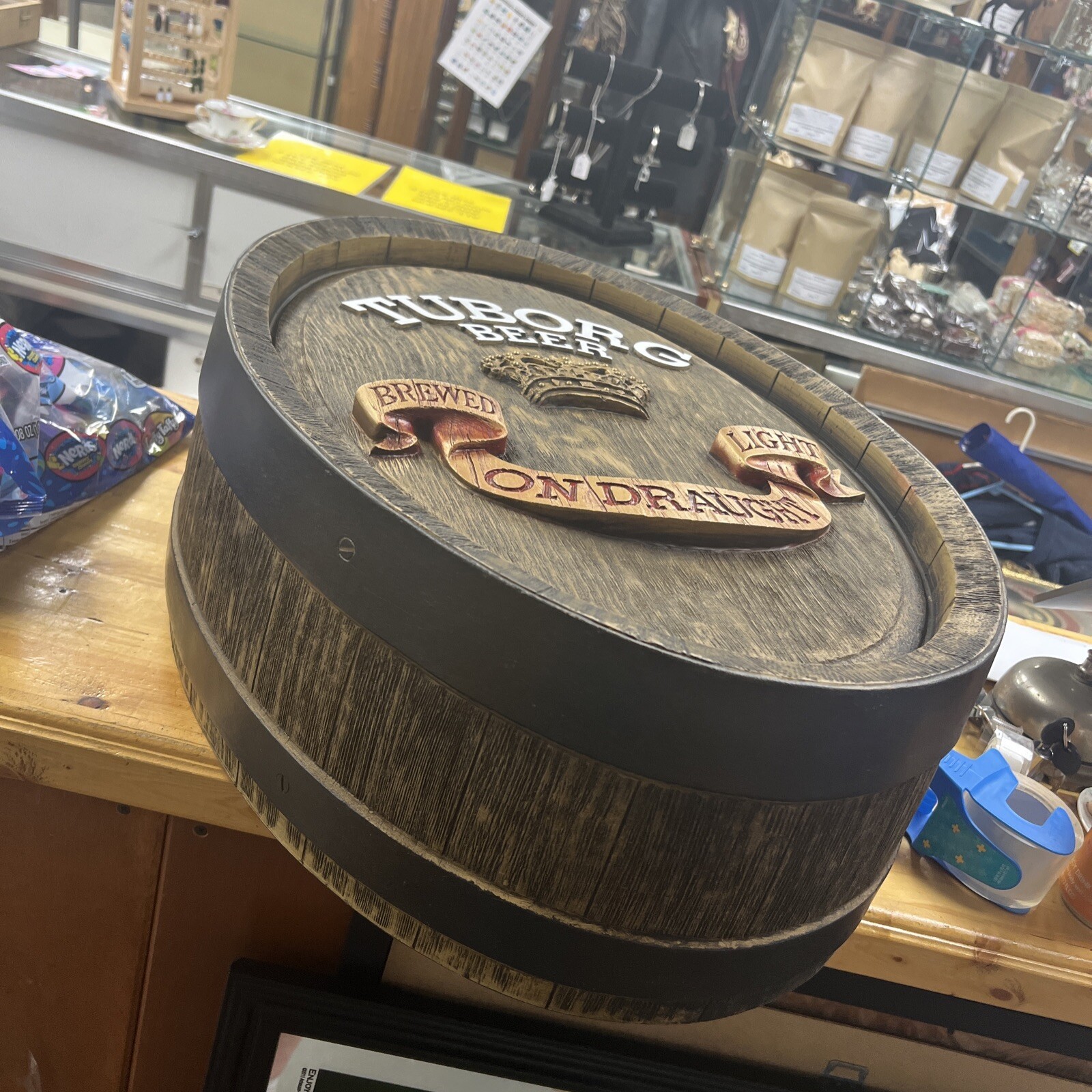 The barrel is designed in an oval shape and features the Tuborg logo in bold letters. It is perfect for display on a wall or in a collection of breweriana. This unique piece is sure to be a conversation starter and is a great way to show off your love for vintage beer memorabilia.