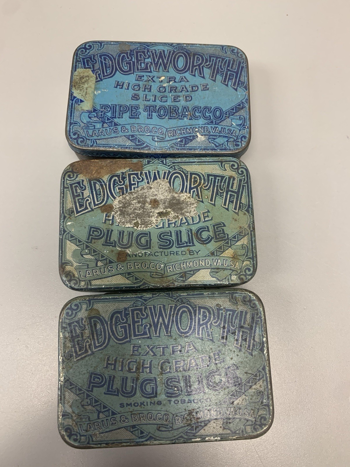 This vintage Edgeworth 3 Extra High Grade Tobacco Stamp Tin features a beautiful turquoise design with the Larus & Bro. brand name. The tin has a hinged lid and was made in the United States. It is a great addition to any collectibles or tobacciana collection. The tin is in excellent condition and would make a great display piece.