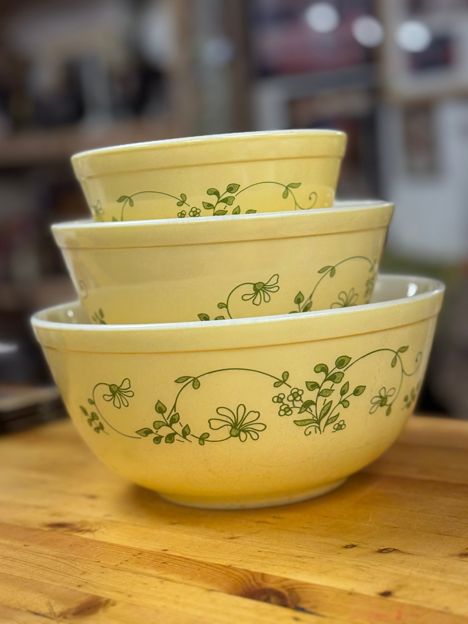Iconic Pyrex Shenandoah nesting bowl set — all three sizes included.