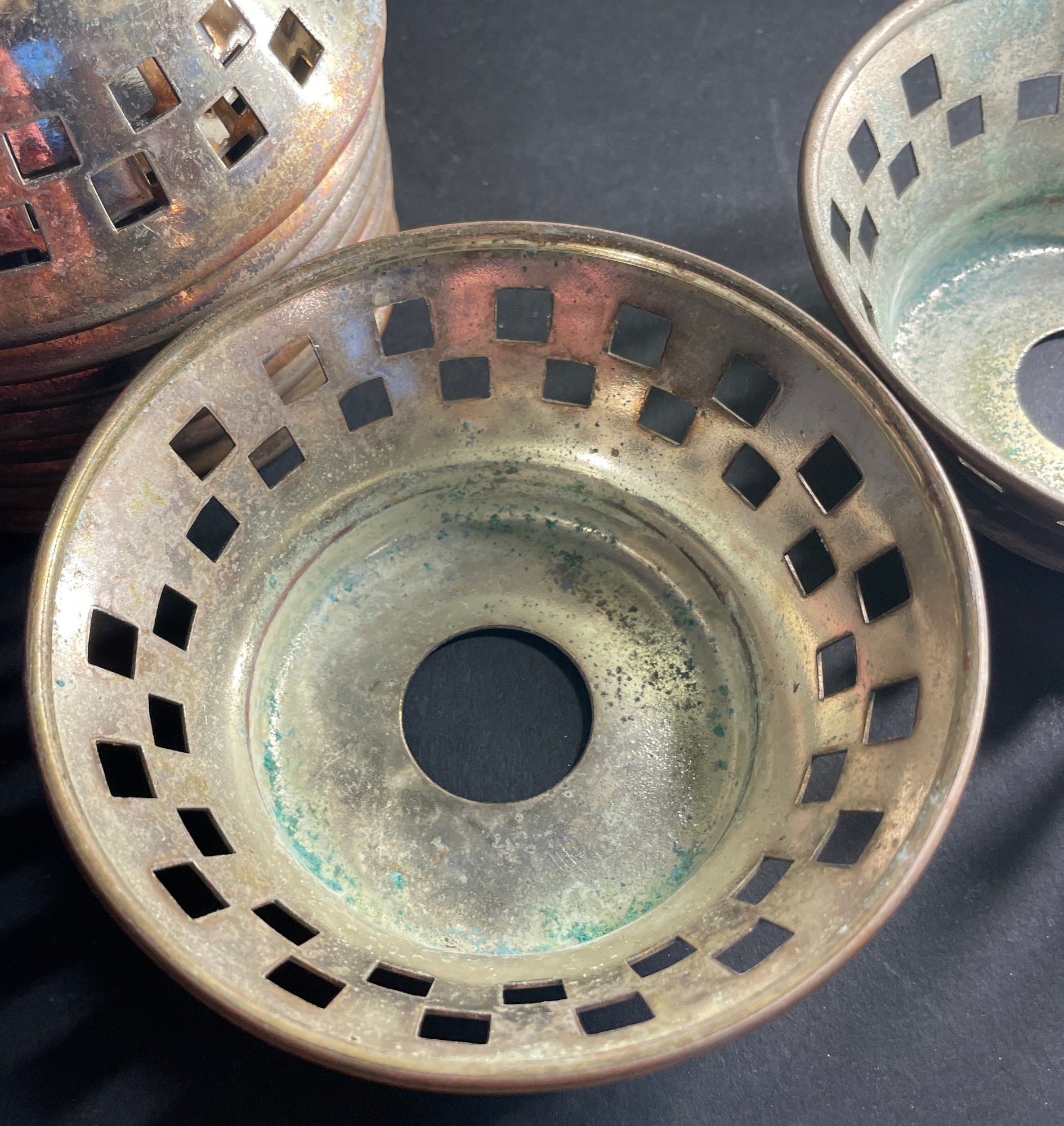 Scarcely seen or found: 11 Early Mid-Century Pick-Barth & Co. Nickel Silver Restaurant Ware 4 1/2" dia. Reticulated Bowls. Likely classic butter ice dish/chillers or similar table side service bowls. Unique barn find on North Fork of Long Island from private club or high-end caterer. Stamped 18% Nickel. See pictures for our best description and identification.