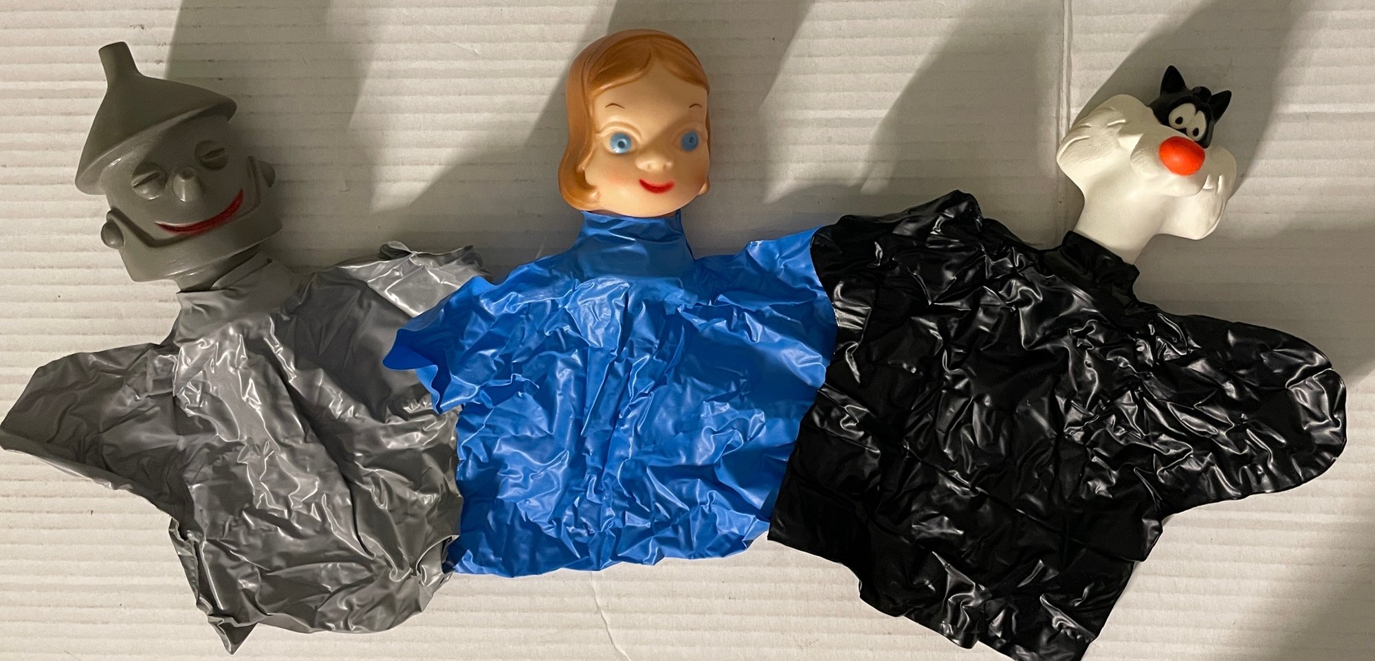 3 1960s Rubber Headed Hand Puppets - Wizard of Oz Dorothy, Tin Man & Sylvester The Cat. The Wizard of Oz puppets are Proctor & Gamble premium items from the day, and Sylvester is signed Warner Brothers and Seven Arts. Good condition. Enjoy!