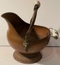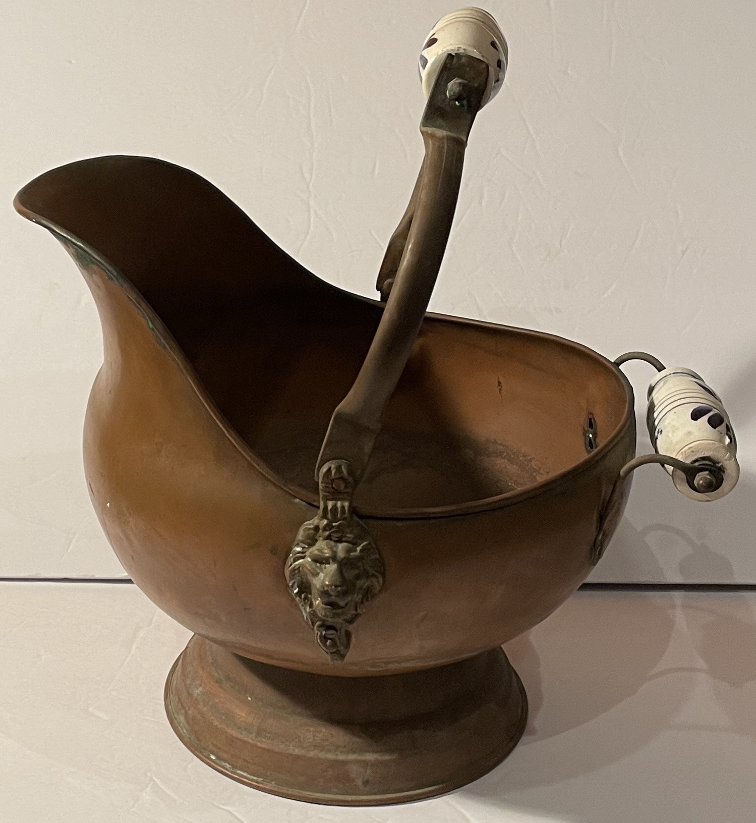 Vintage Holland Scuttle Bucket LION On Side Copper Fireplace Decor W/ Porcelain Handles Approx. 14x11" excluding handle.