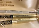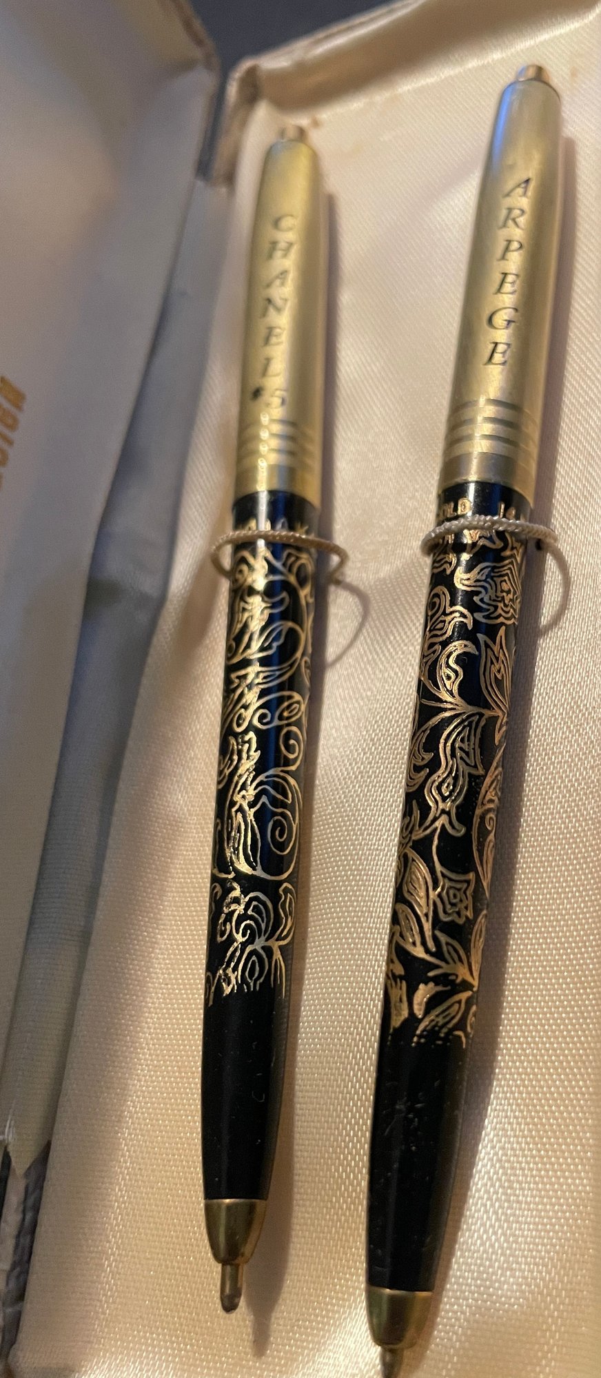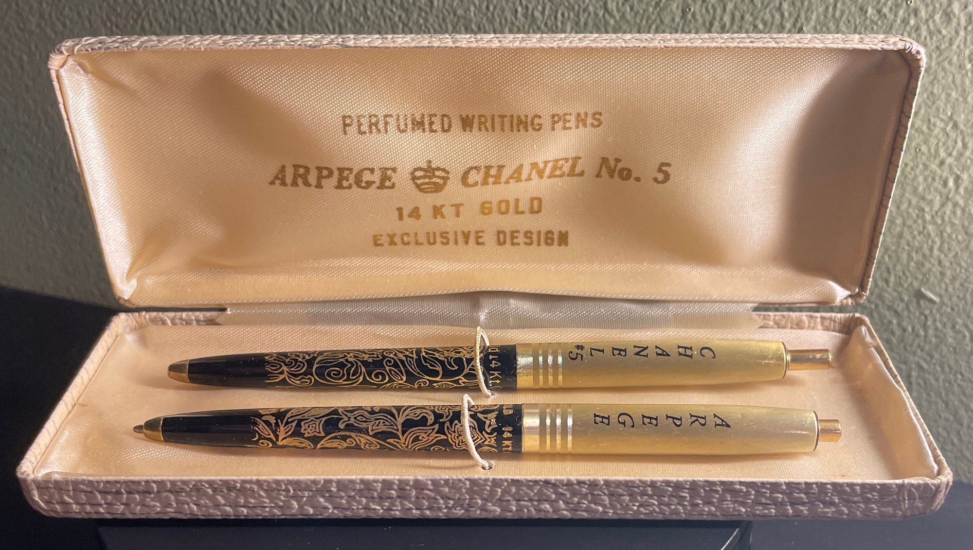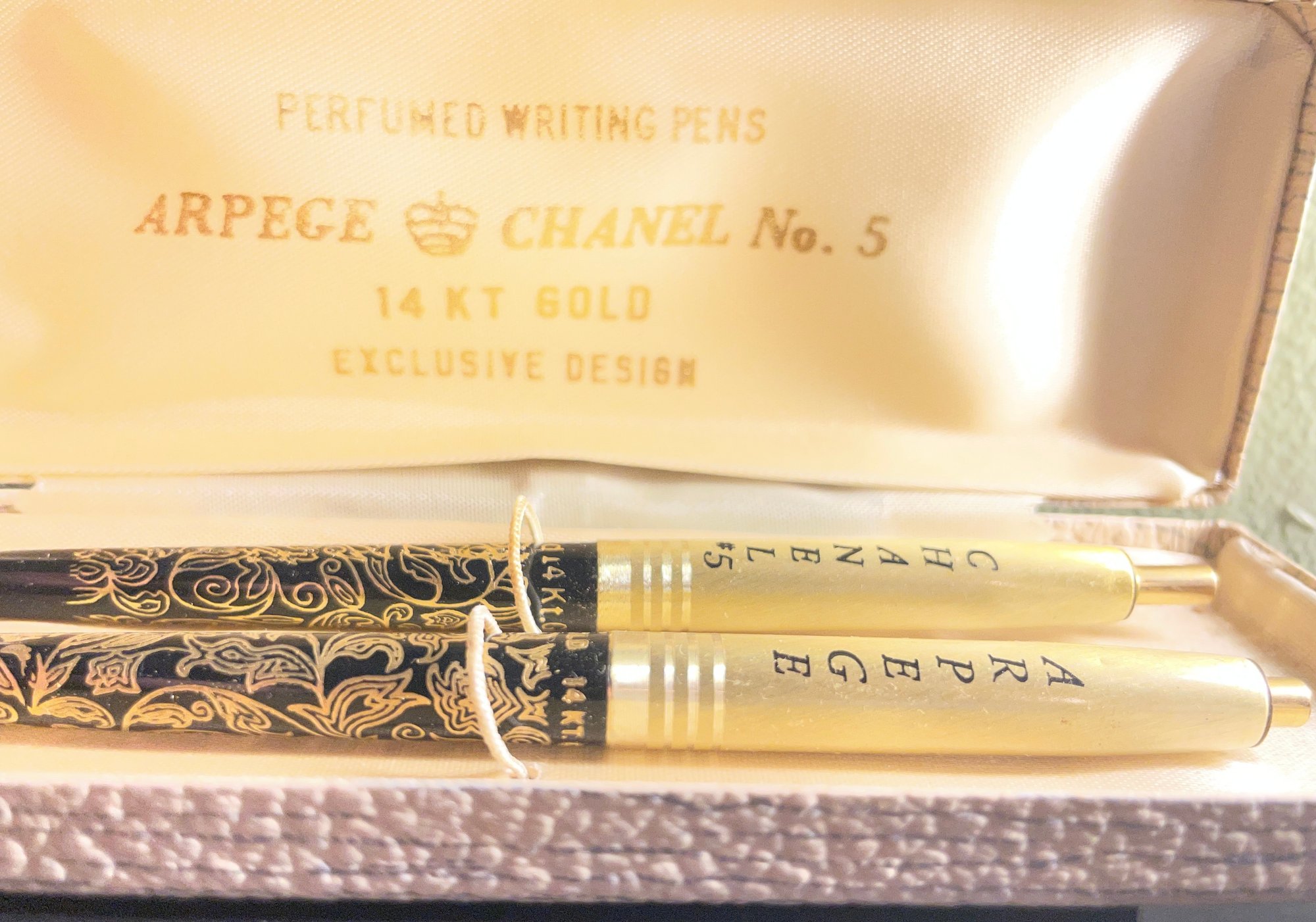 Arpege Chanel No. 5 - 14k Gold Perfume Writing Pens. These vintage pens are in good condition - please pictures as our best description. Used condition with wear. They do not write as-is, and do not have a noticeable scent.