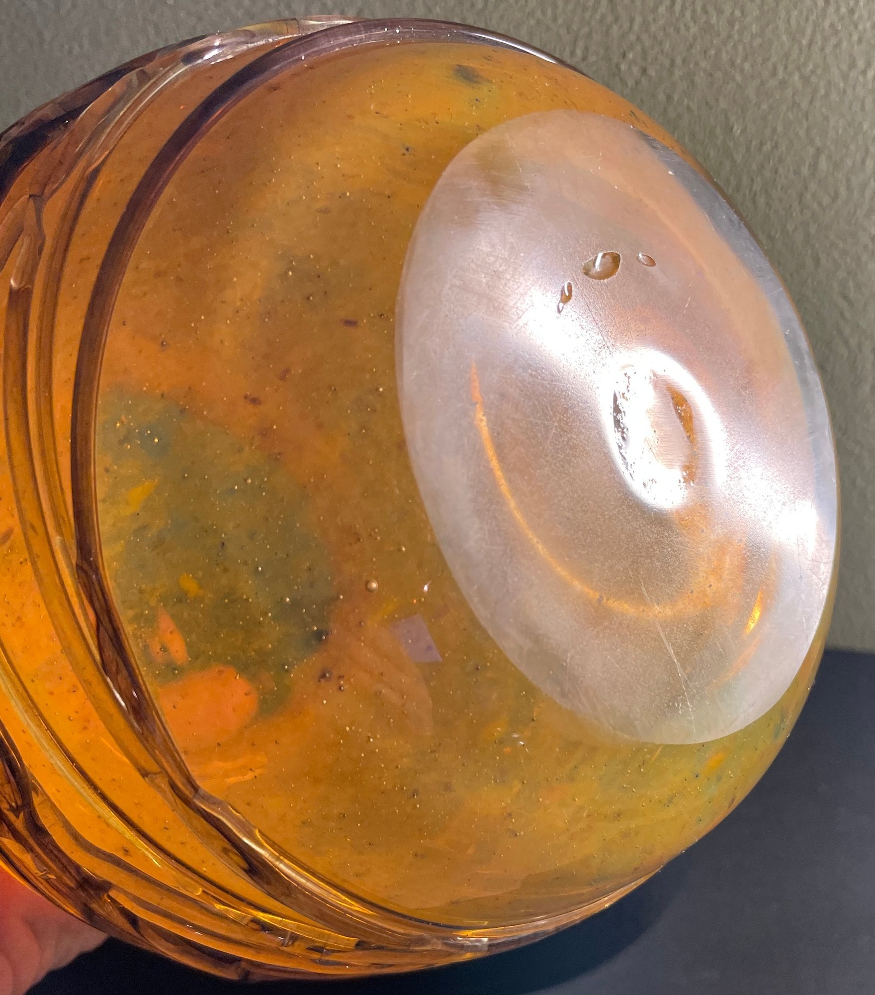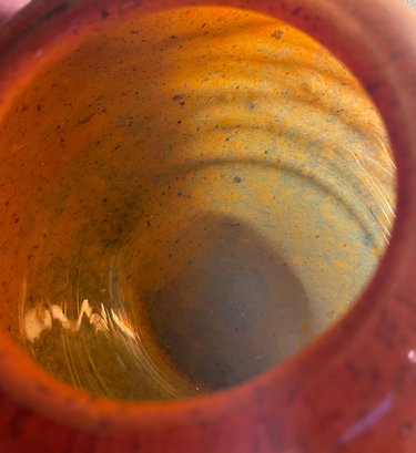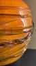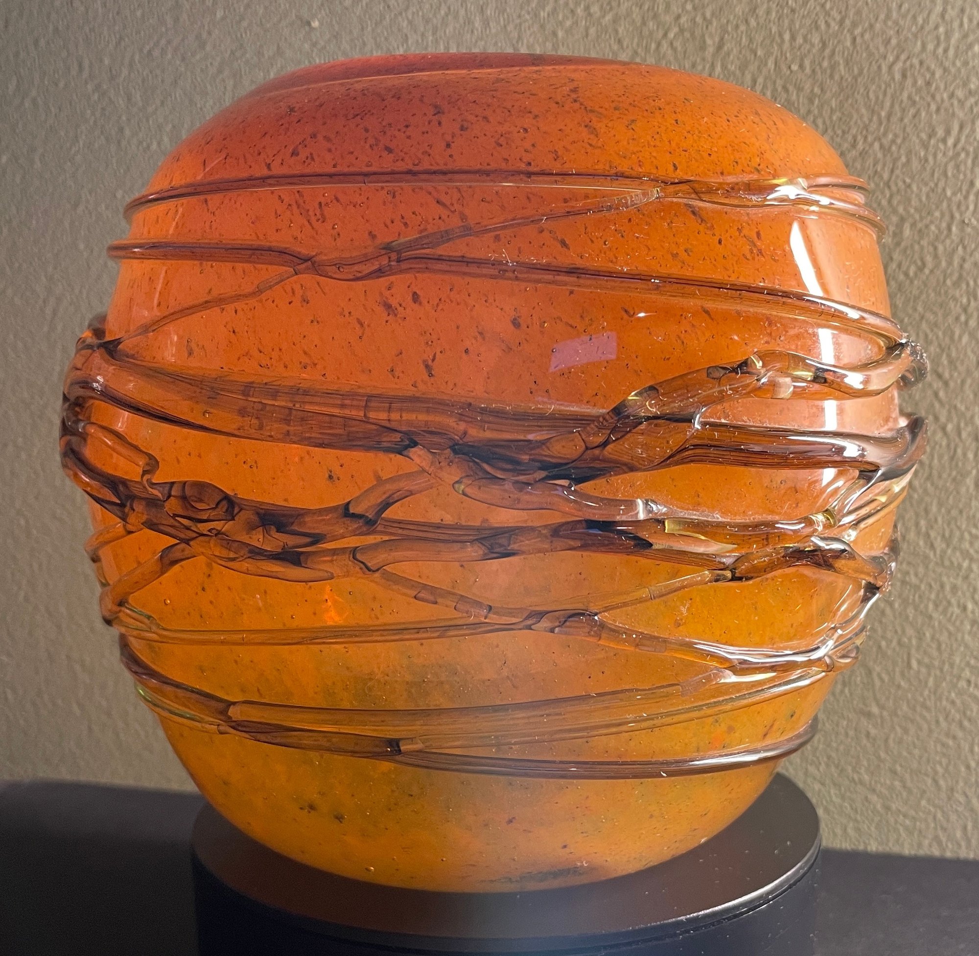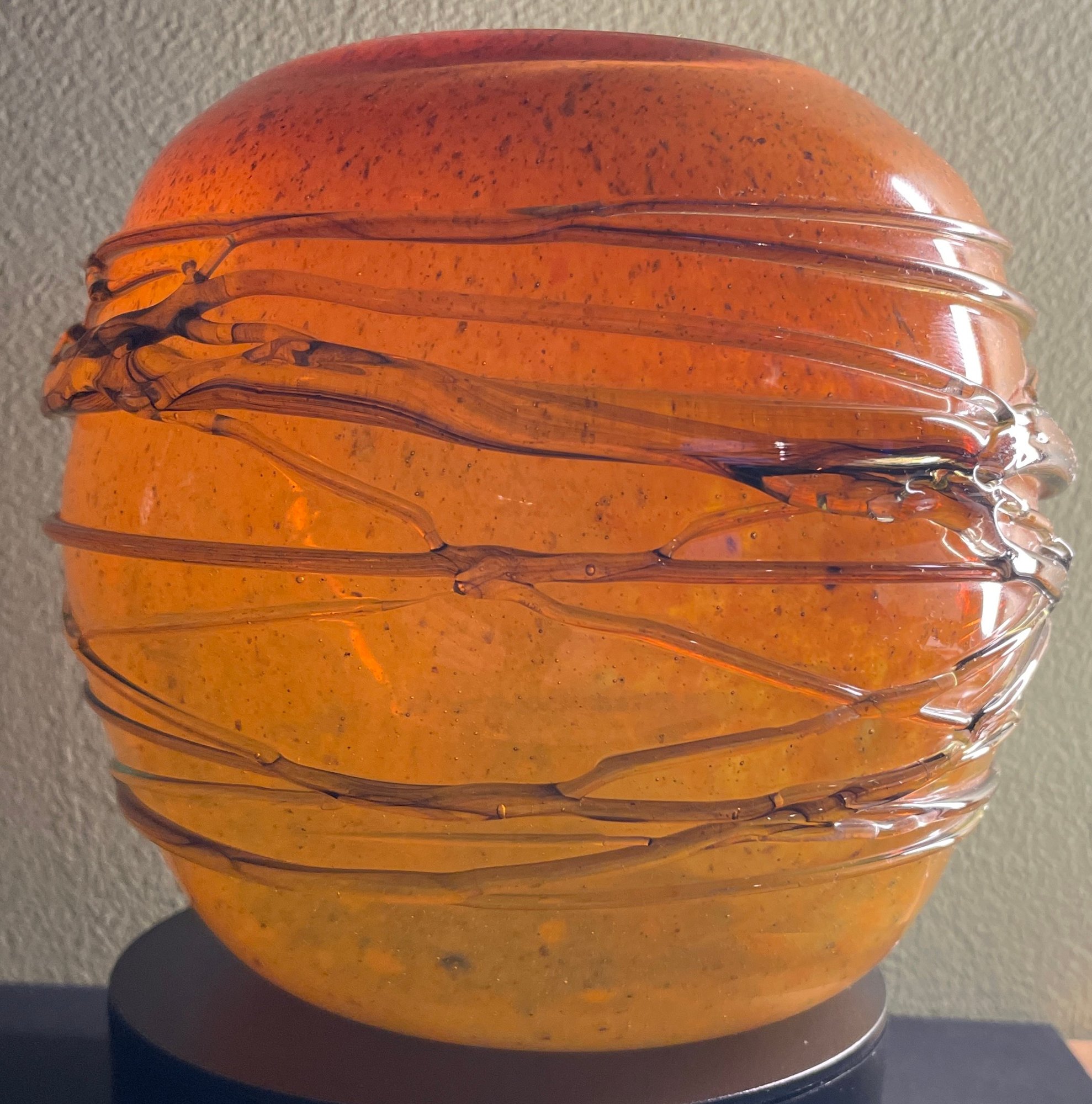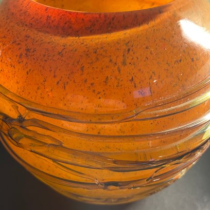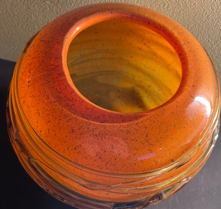 Hand Blown Art Glass Orange Round Vase Bowl With Applied Amber Threads - Approx. 5 1/2" x 6 1/2".