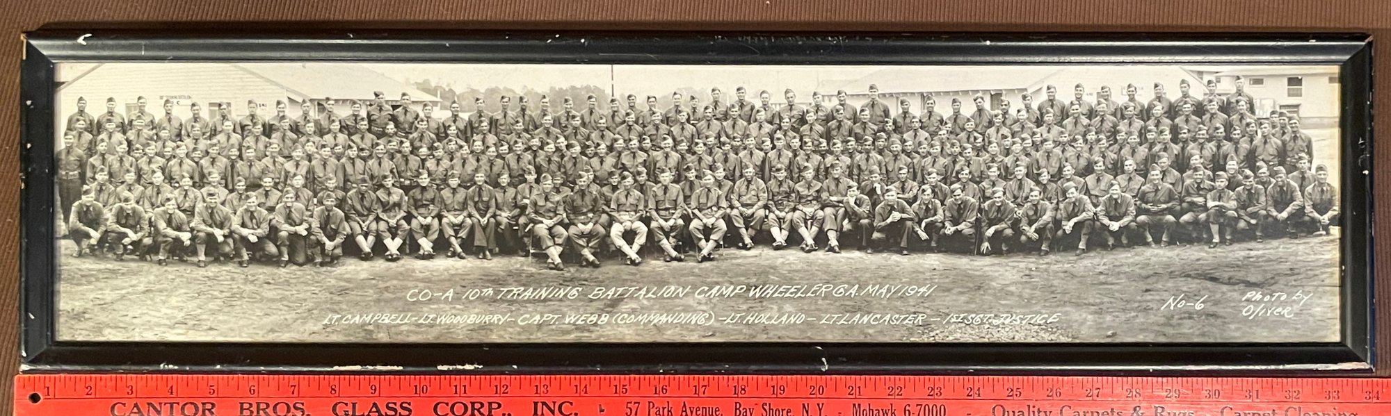 As found as framed, period correct original framing. The US military used Camp Wheeler as an infantry replacement center from 1940 to 1945. The base was re-established on October 8, 1940, with construction beginning on December 21, 1940. Rather than being used to train entire units, the camp was an Infantry Replacement Training Center where new recruits received basic and advanced individual training to replace combat casualties. During the First World War, approximately, 83,000 troops passed through the camp. 34" x 9" overall measurements.
