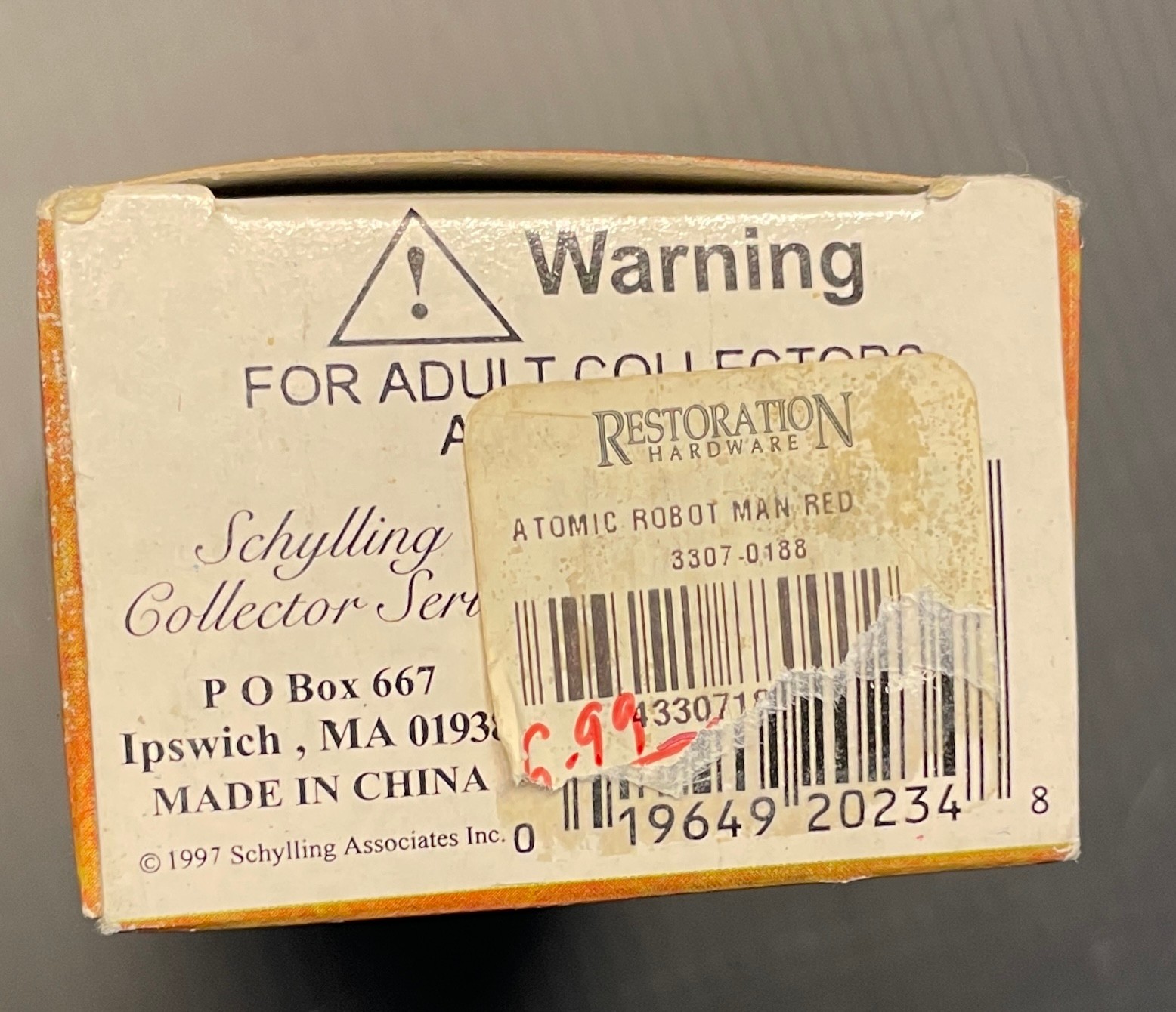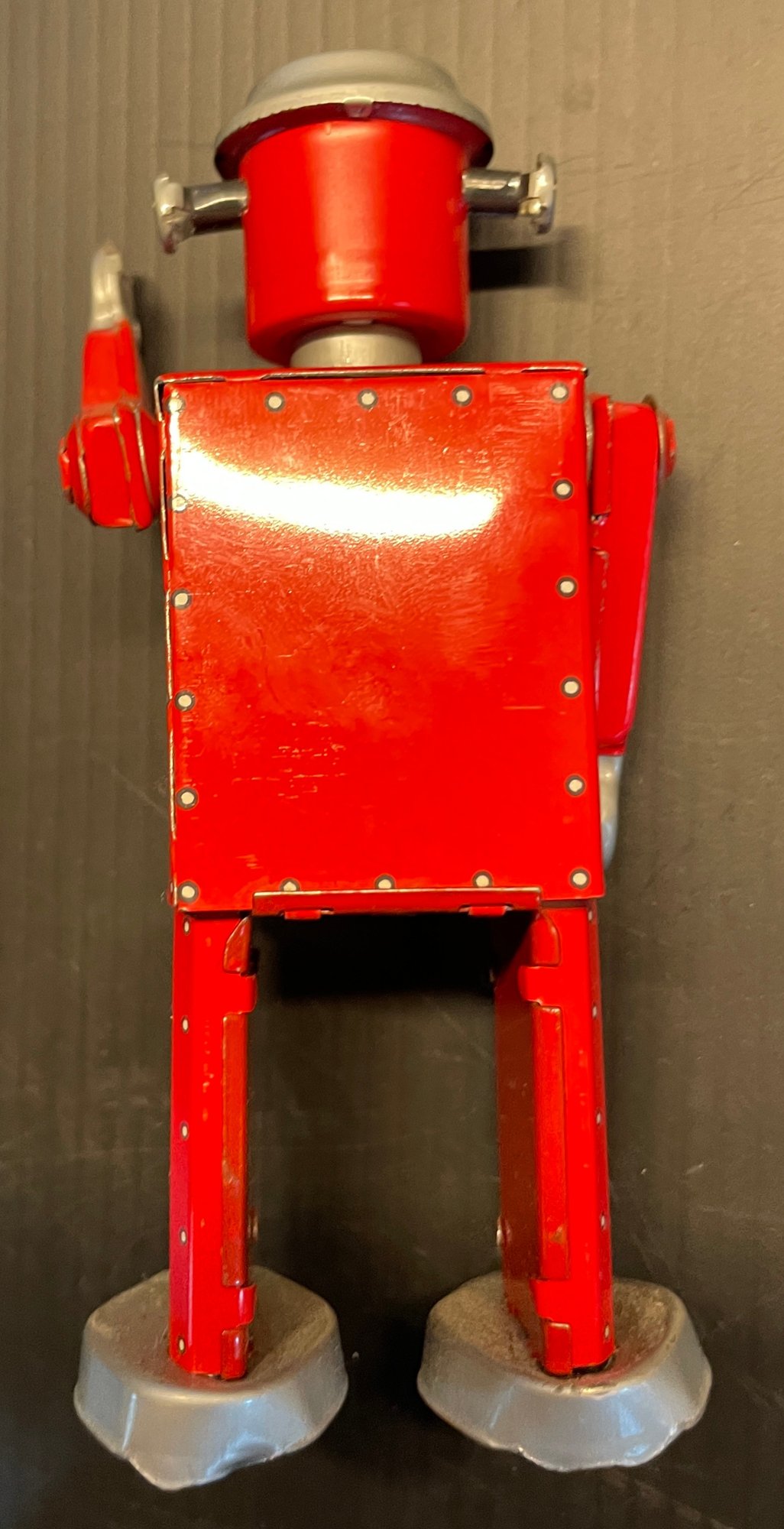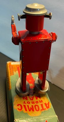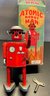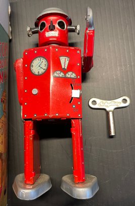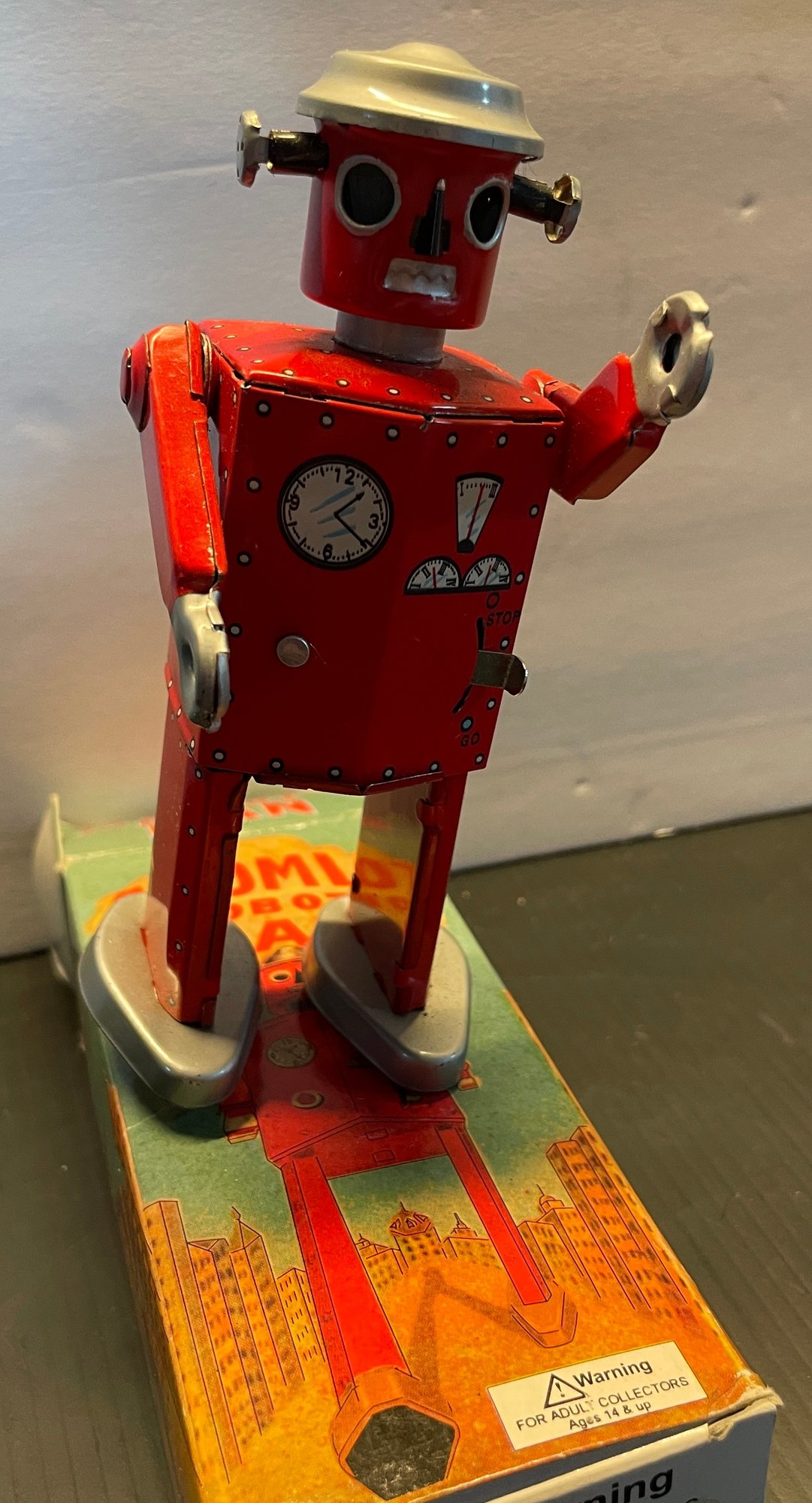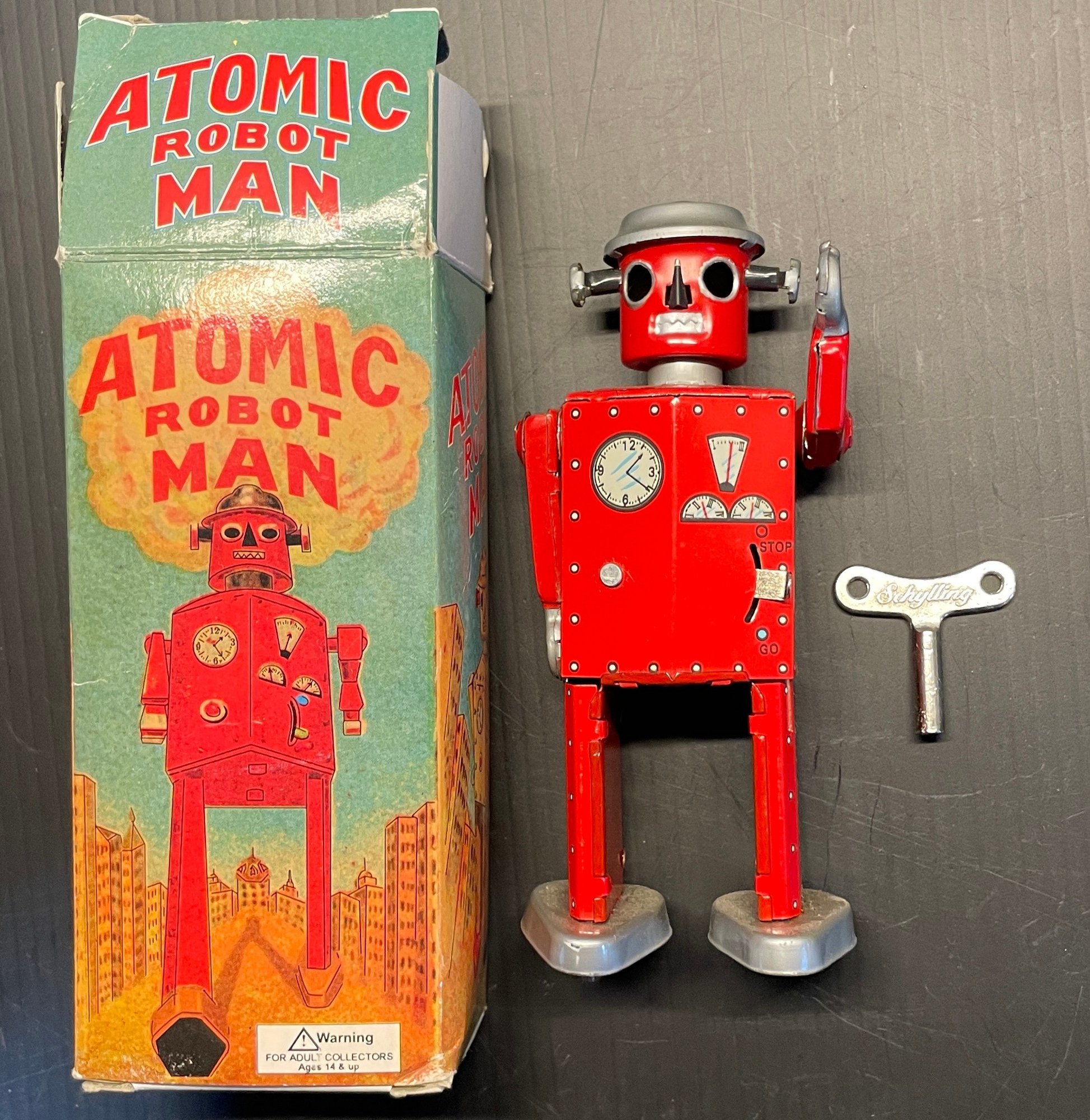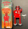 Schylling Atomic Robot Man Vintage Tin Toy Red Litho Wind-up Toy 5” Working. With key, in original box.