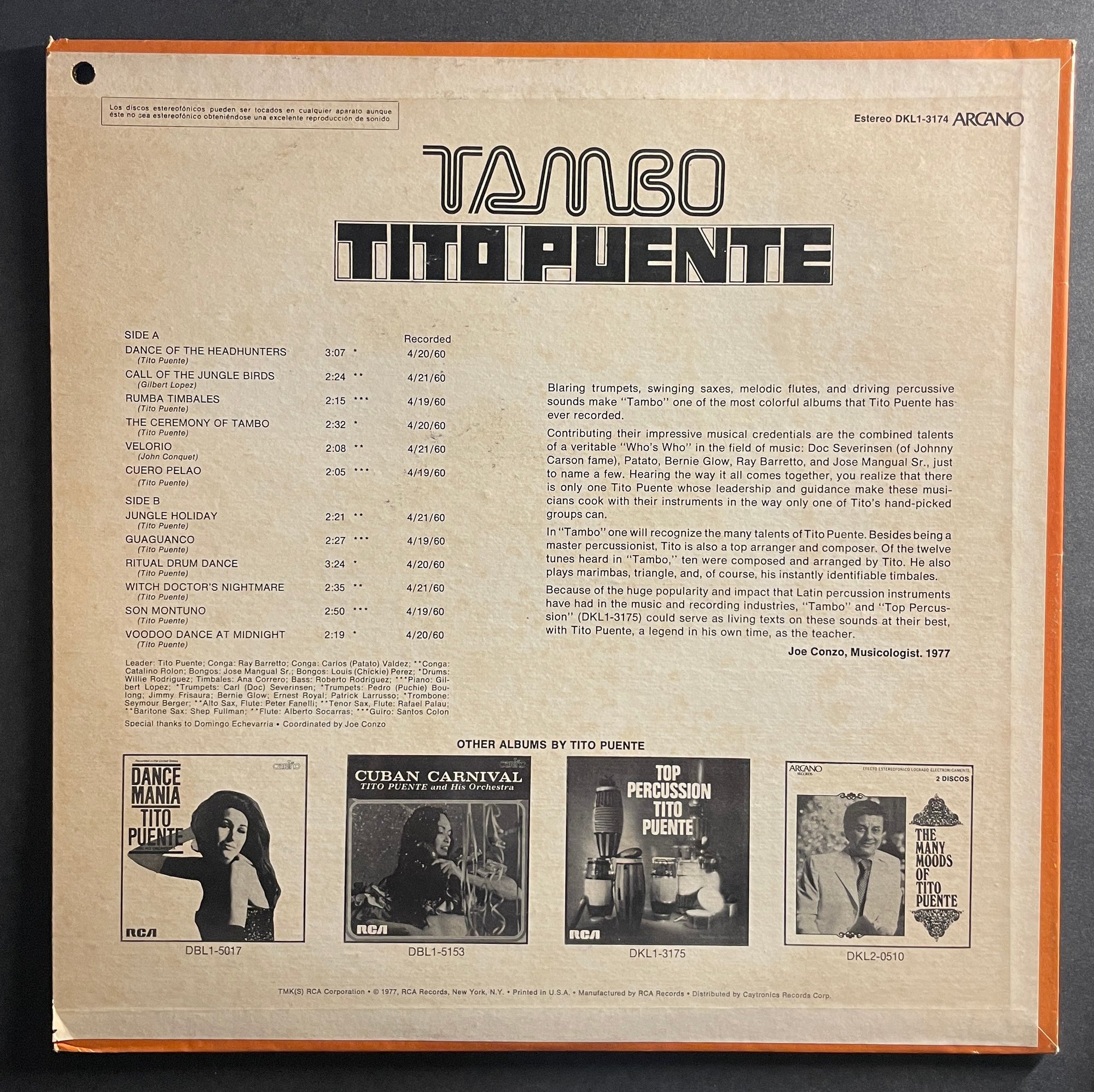Tito Puente "Tambo" Latin Afro-Cuban Jazz Guaguanco LP Arcano DKL1-3174. Media appears glossy, lightly played and no detectable scratches. Would fall in the NM-VG+ range. The pictures are always our best description. Cover is presentable with some wear and punchout hole as pictured.