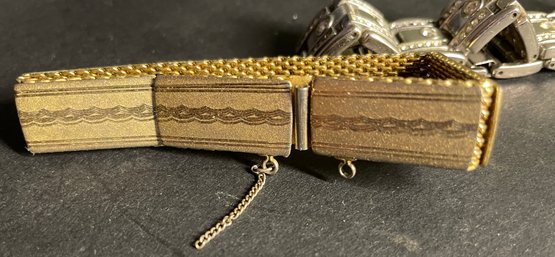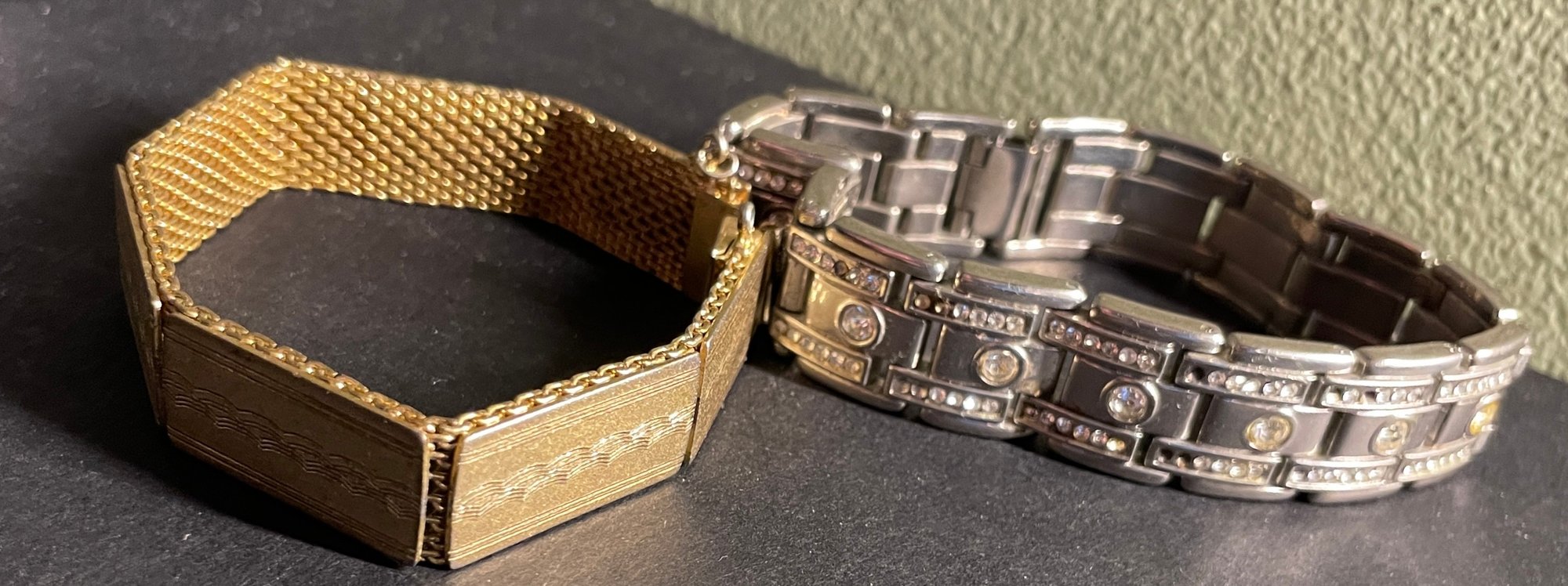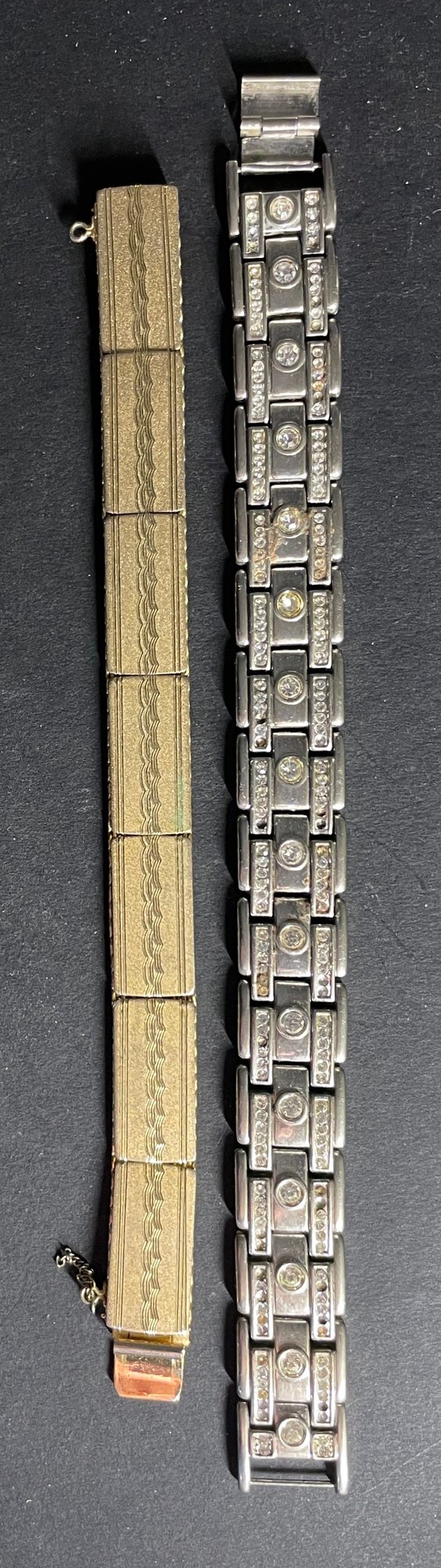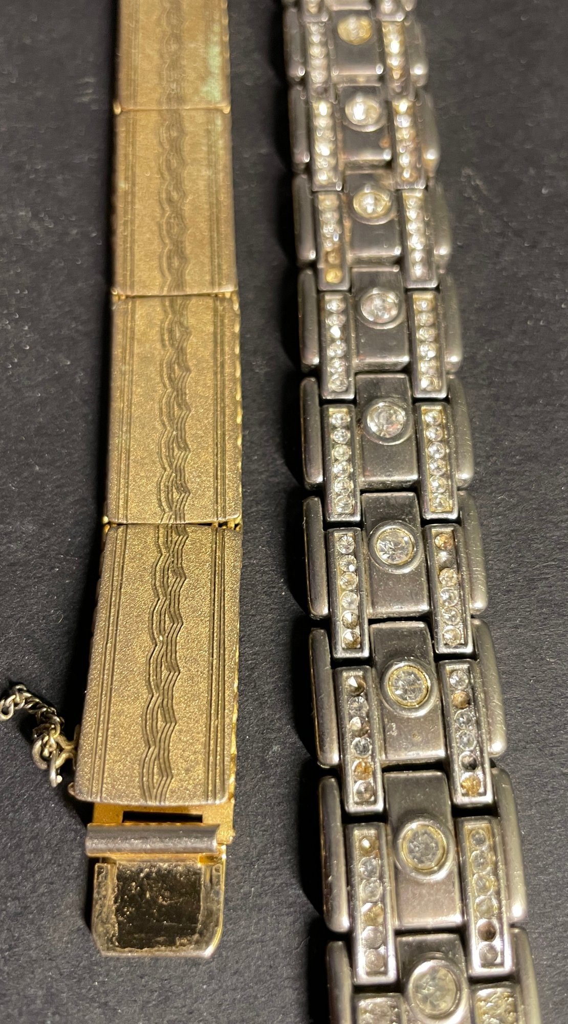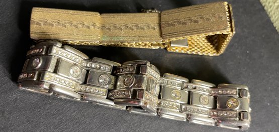 Two Vintage Bracelets Gold & Silver Tone - Wearable 8", 7". Silver is approx. 8" and gold 7". Needs some cleaning and a few small rhinestone replacements. See pictures as our best description. Sold as-is.