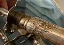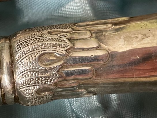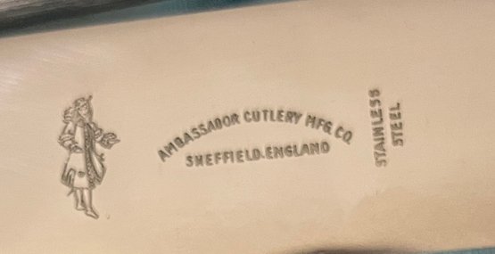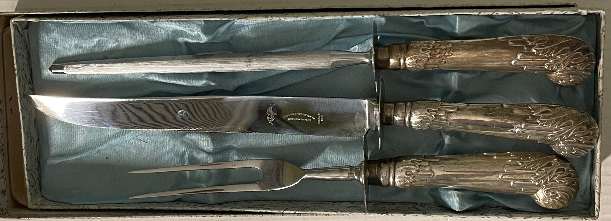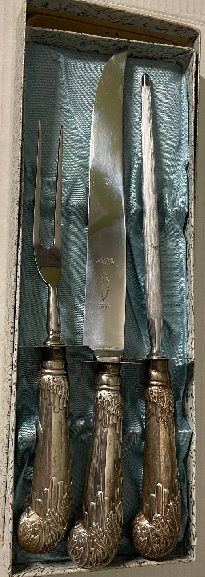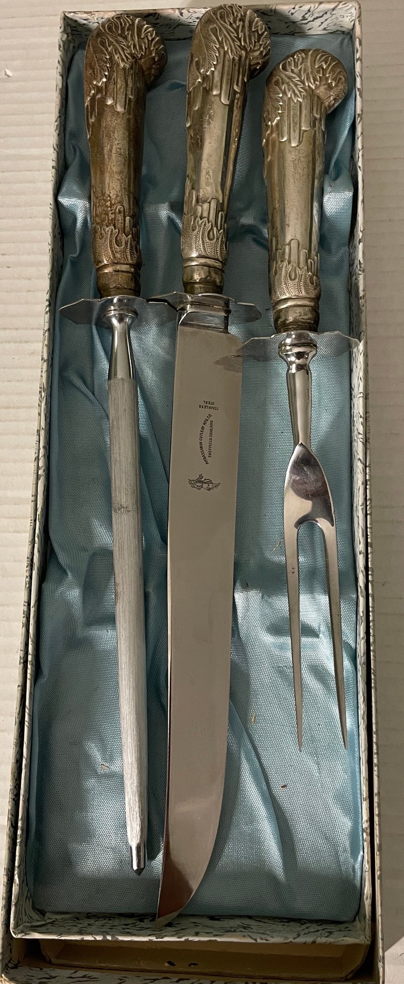 Vintage Ambassador Cutlery, Sheffield England, Sterling Silver Handles & Stainless Steel 3 pc. Carving Set. Knife, Fork, Sharpener. Knife measures approx. 14" Needs cleaning. Sold as-is, as-found.