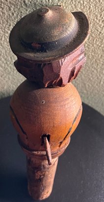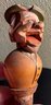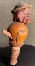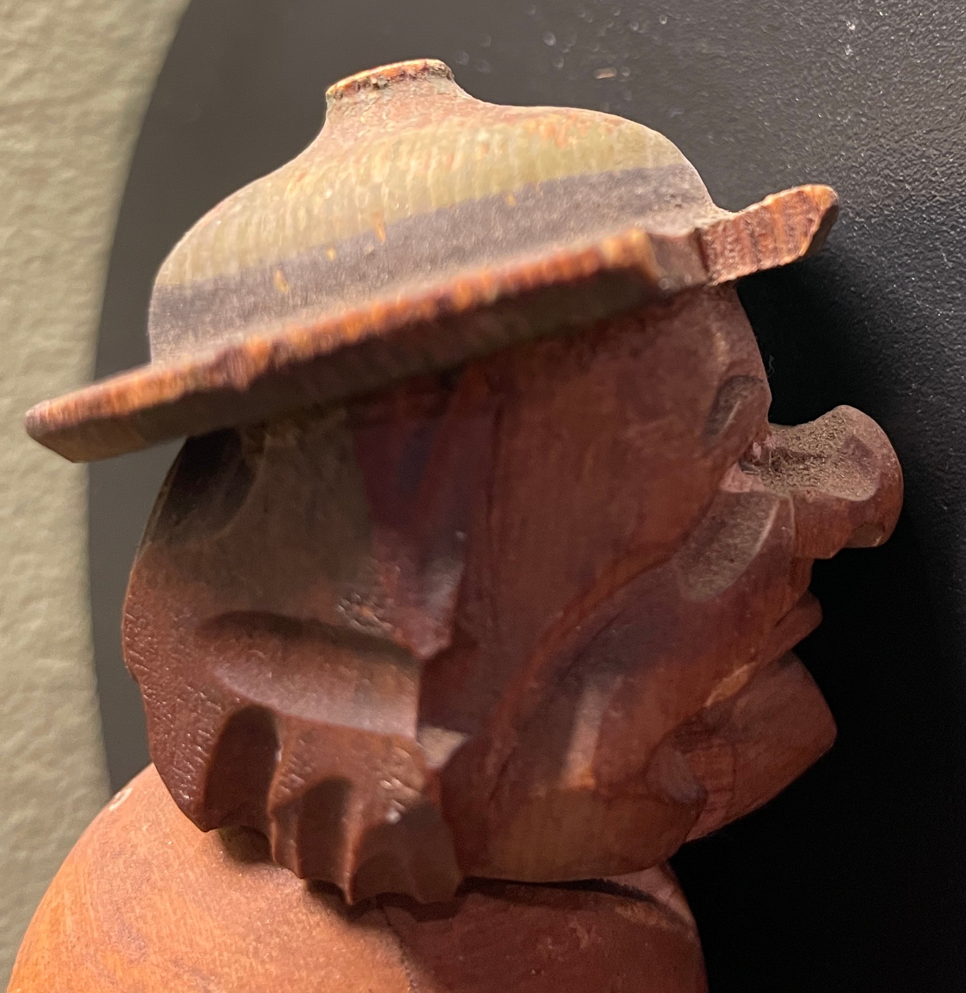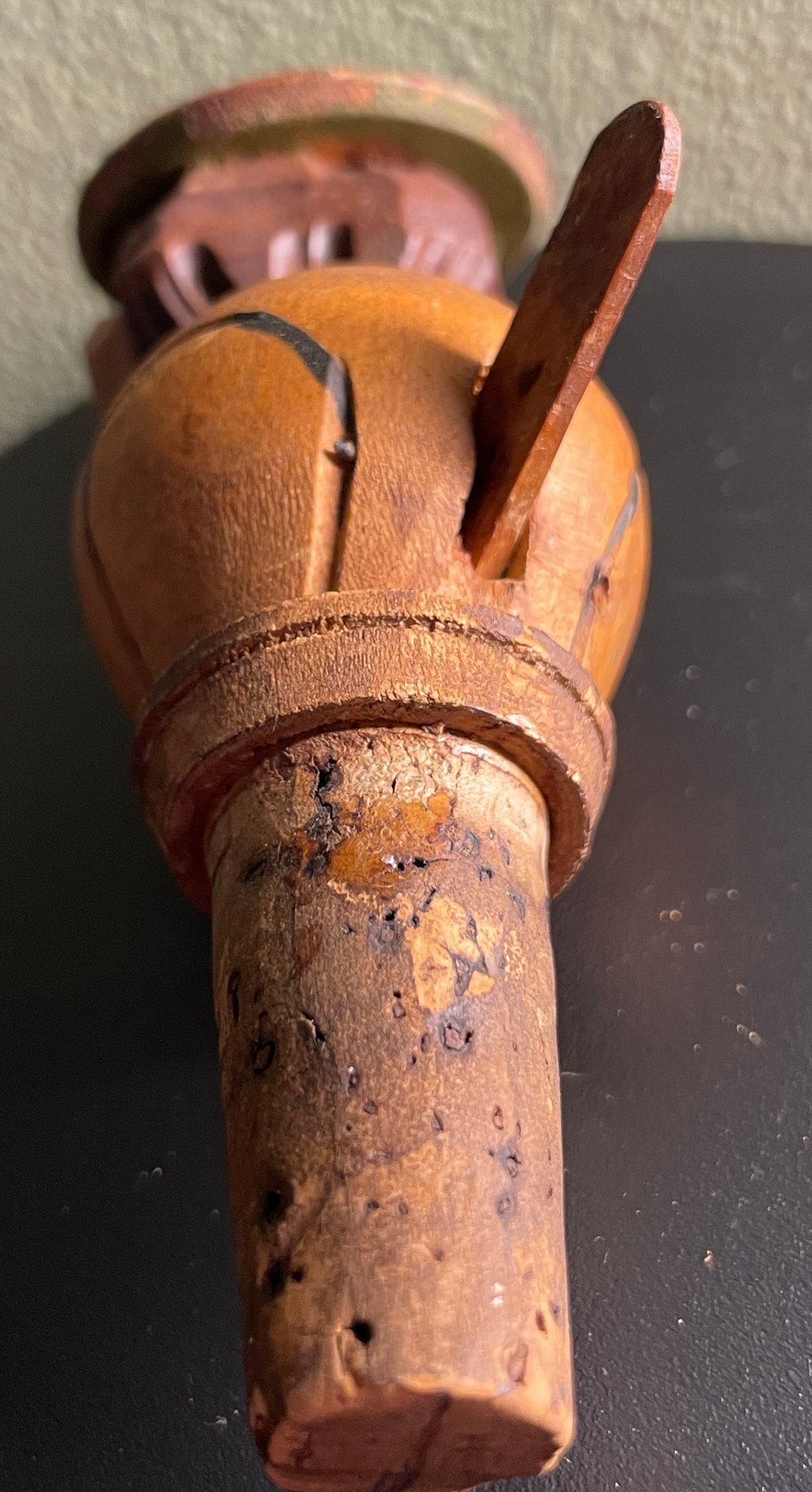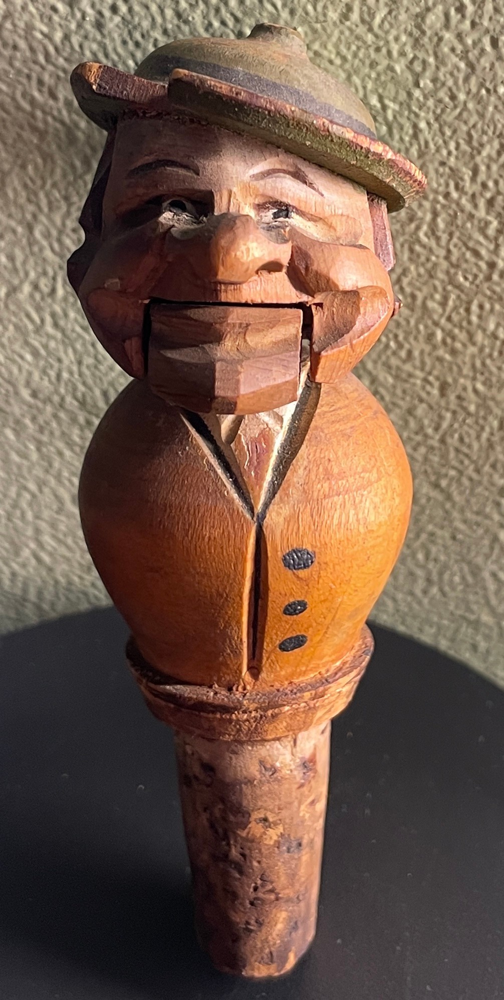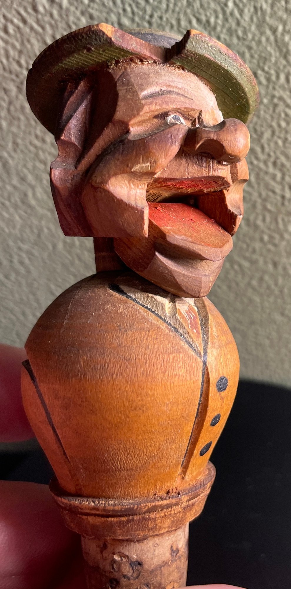 Vintage ANRI Carved Wooden Wine Bottle Stopper Man, 4.5". Mouth opens with back lever as shown. Hat either has a chip as shown or was intentional.