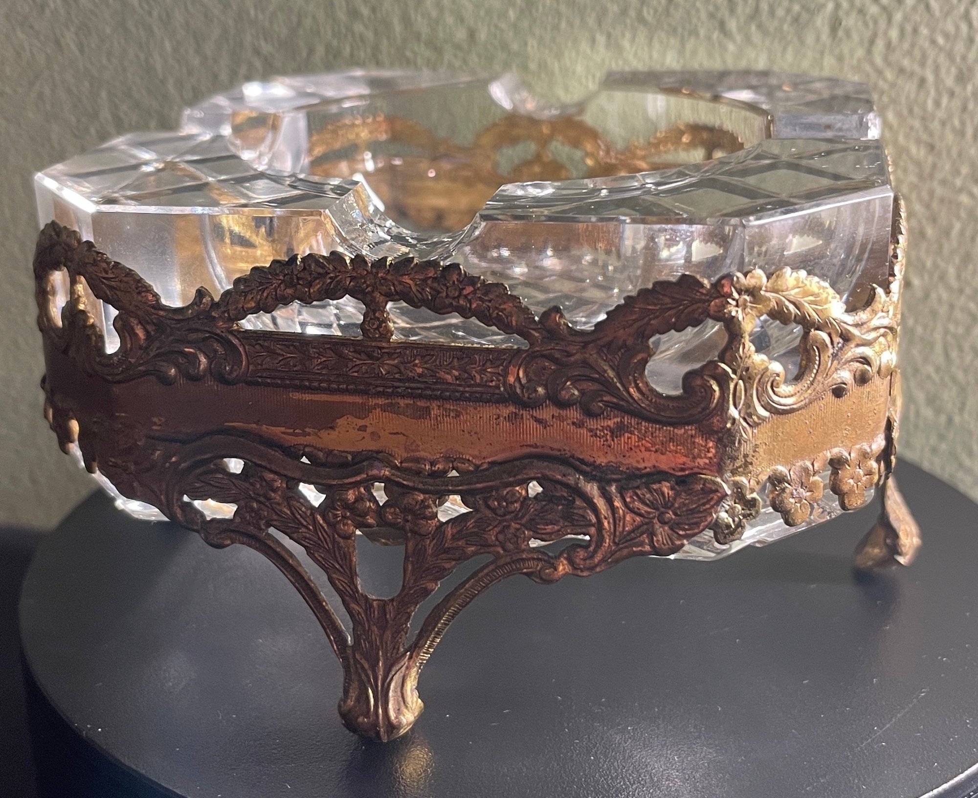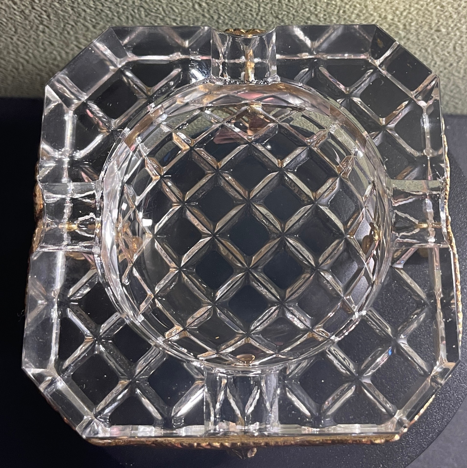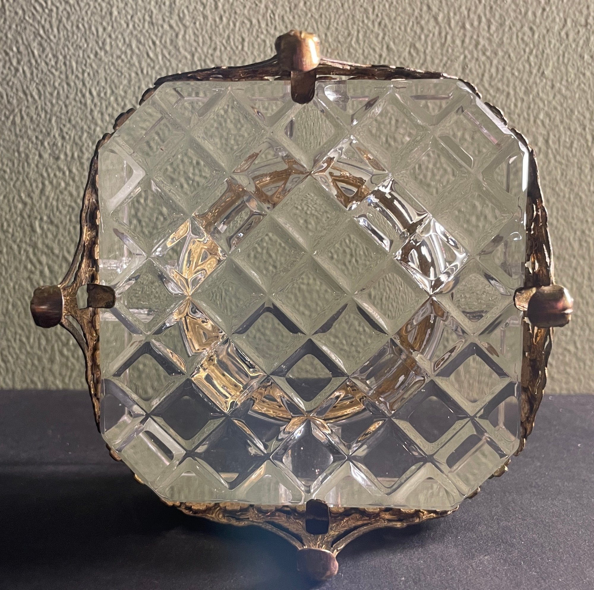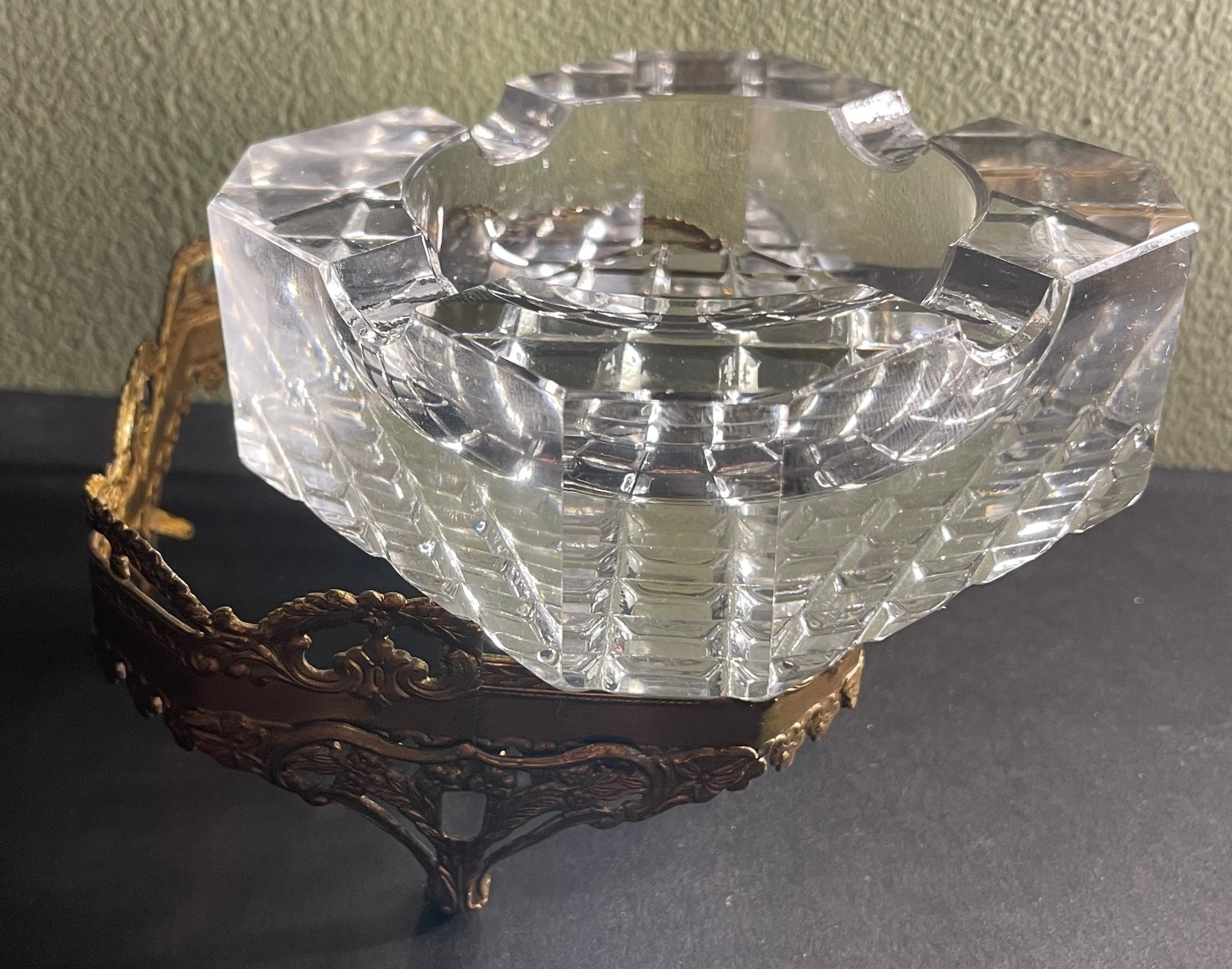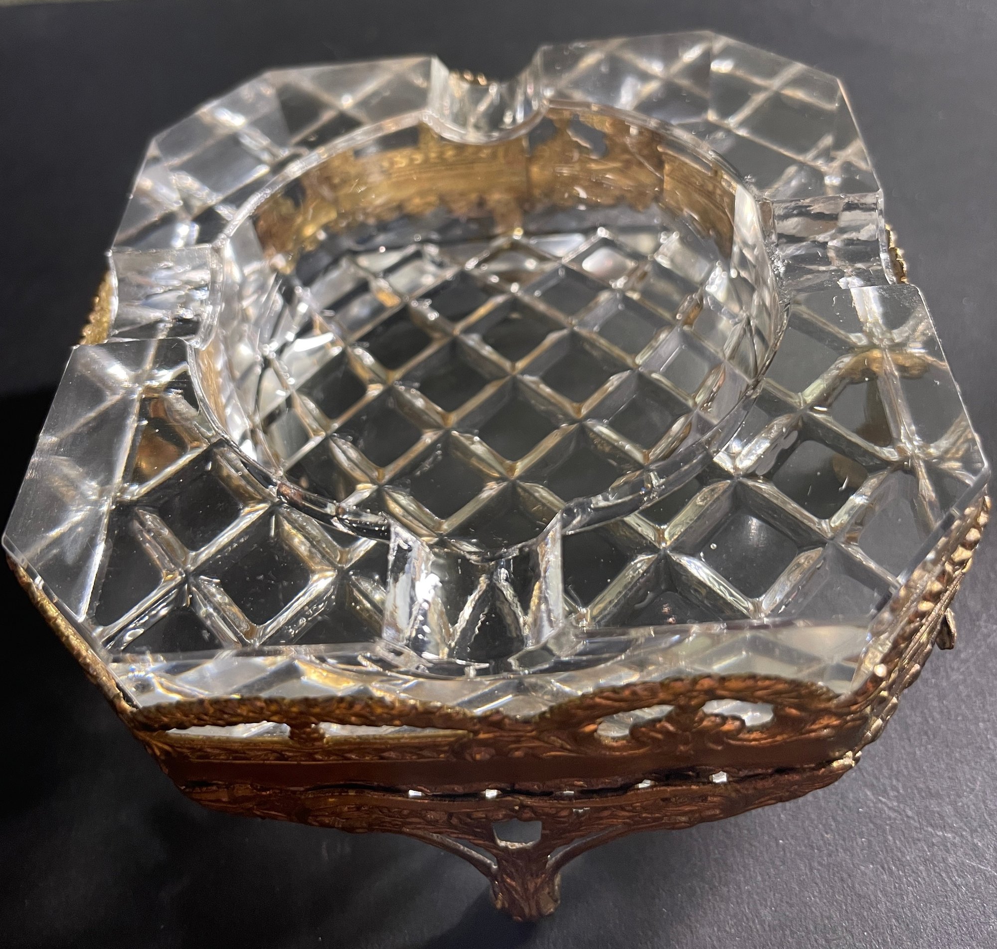 Vintage Hollywood Regency Filigree Footed Crystal 2-Piece Ashtray. Approx. 3 3/4" x 3 3/4" x 2"T