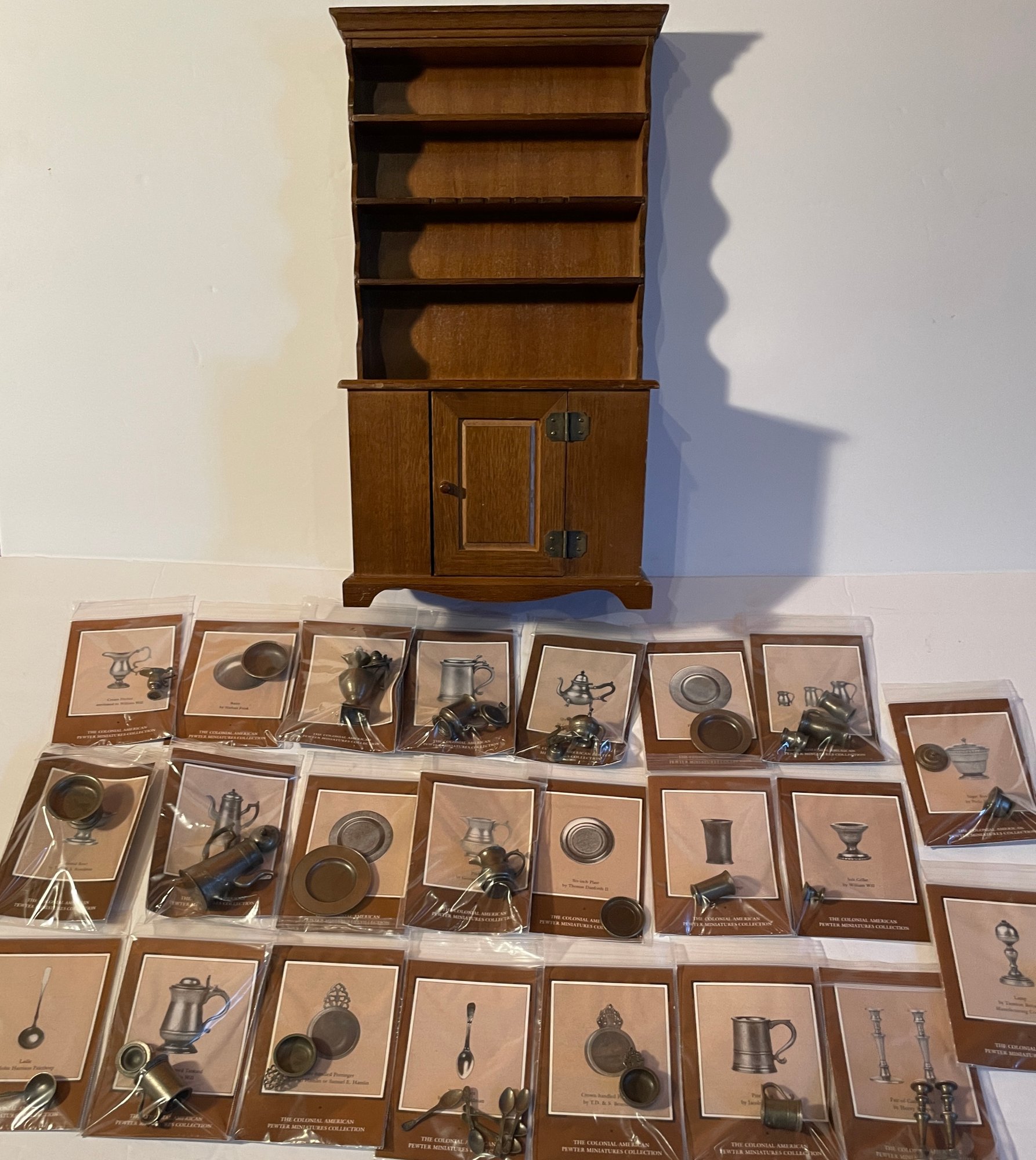 Williamsburg Colonial Hutch And Pewter Utensils Pieces with informational card By Franklin Mint - 23 Carded Utensils And COA