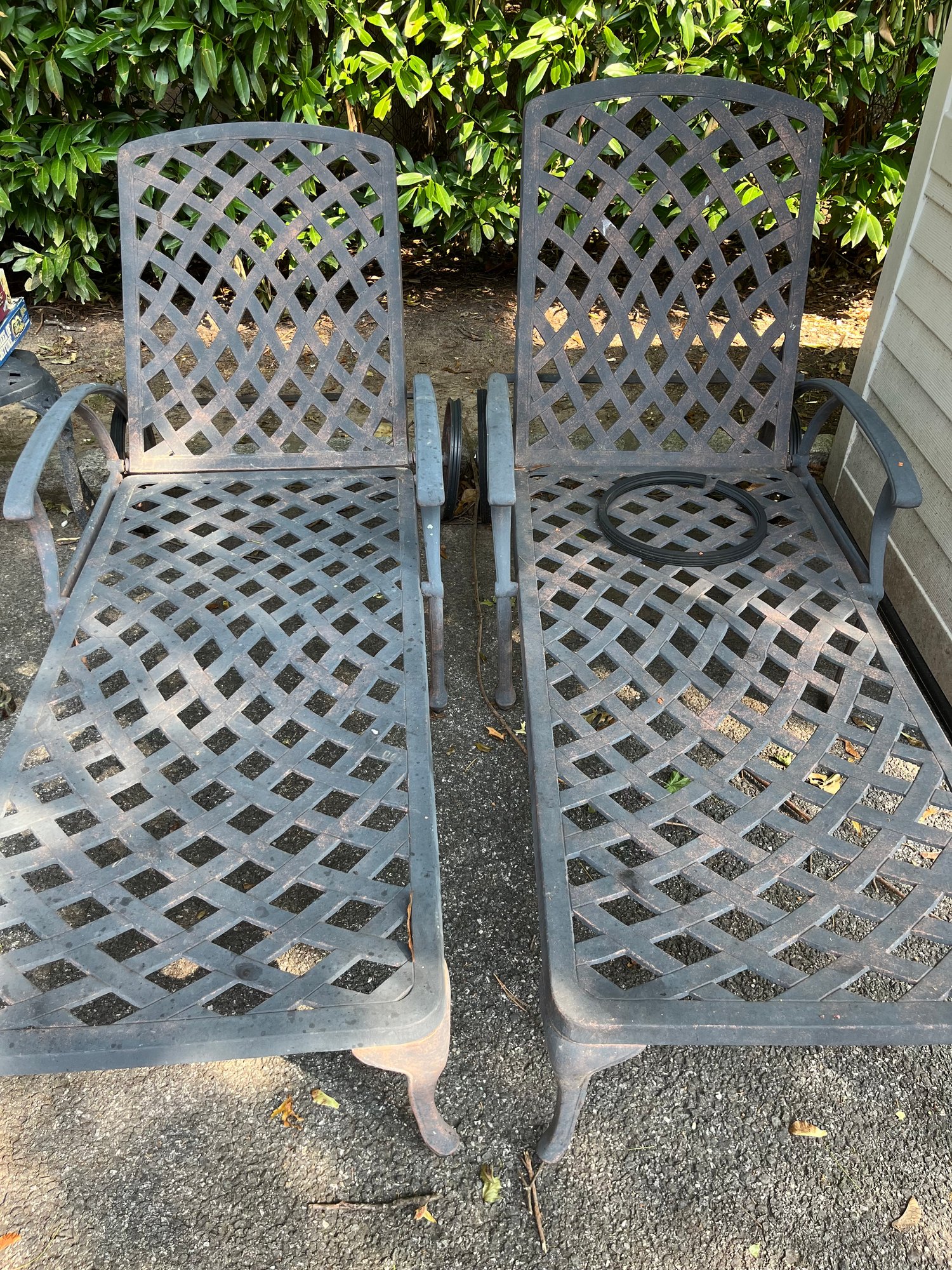 Please see pictures for condition. Chaise lounge chairs are in good condition. Wheels need new rubber/vinyl tires. Easy Fix.