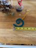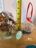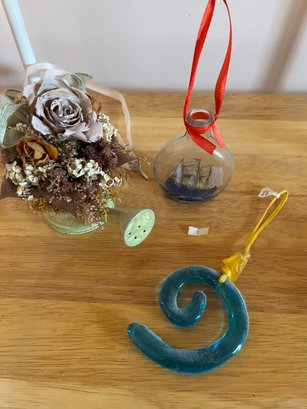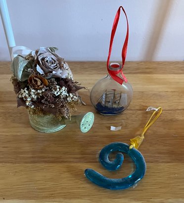 3 Ornaments Watering Can With Flowers, Ship In A Bottle And Teal Glass Curl