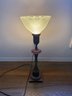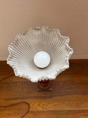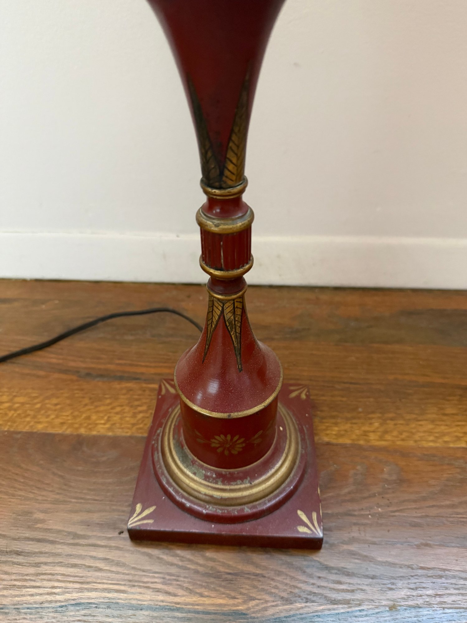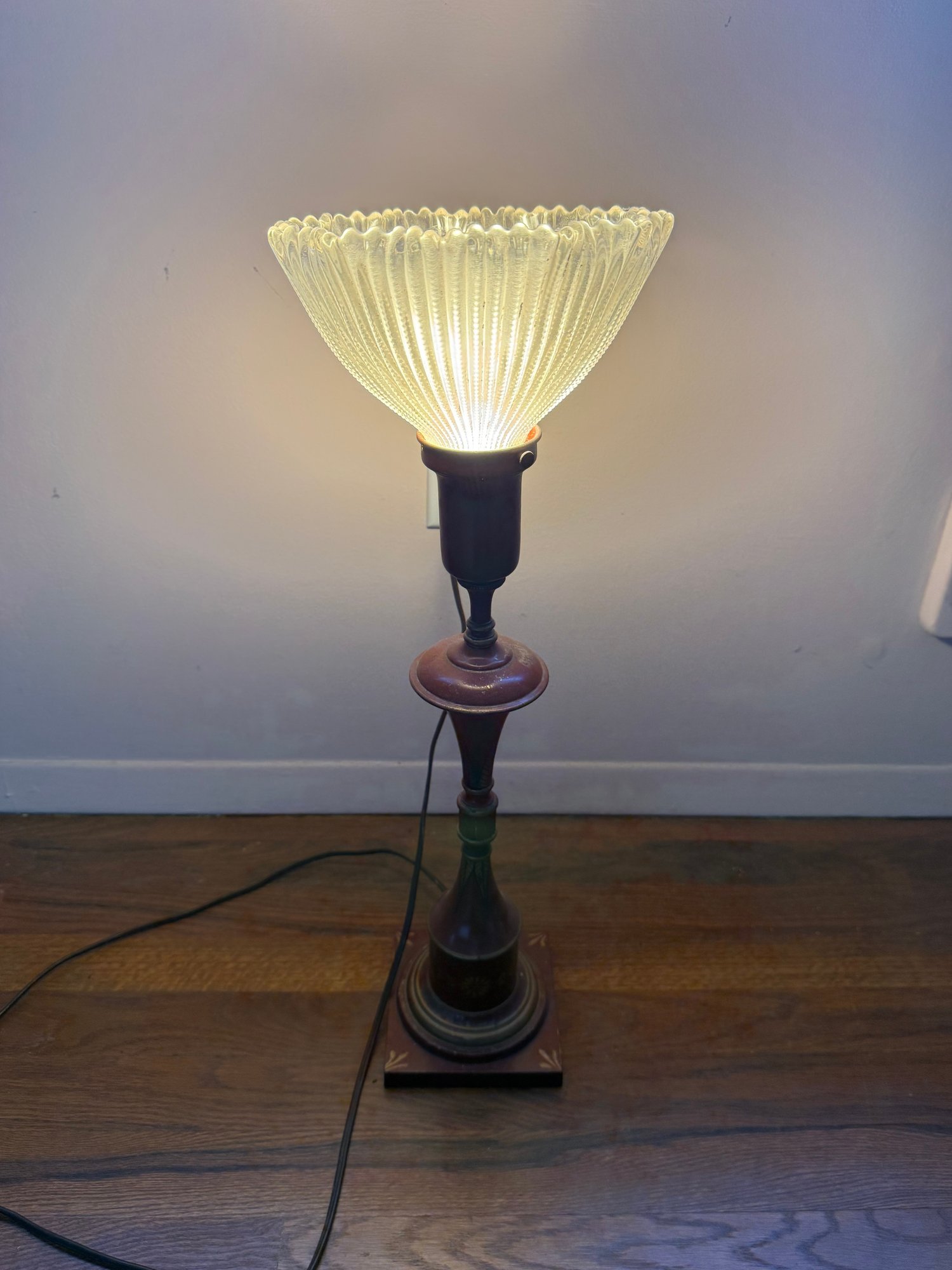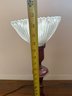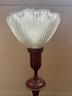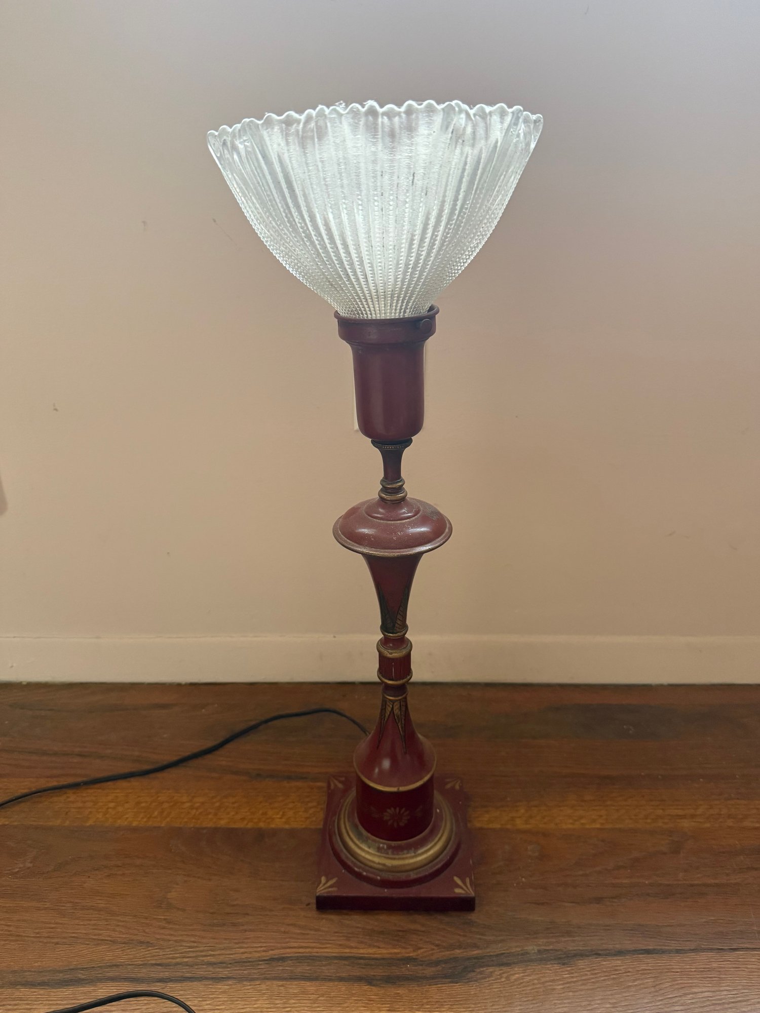 A Decorative Table Lamp With A Ribbed Glass Shade And Red Metal Base