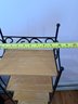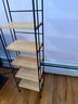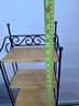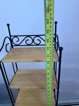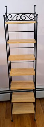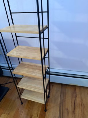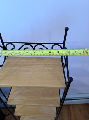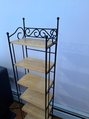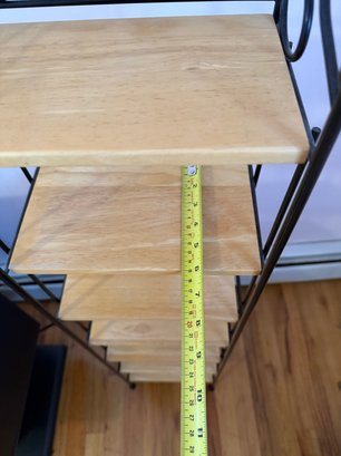 A Decorative Wrought Iron Shelving Unit With Five Blonde Wood Shelves