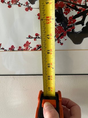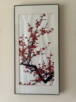 A Framed Ink Wash Painting Of Red Plum Blossoms On A White Background