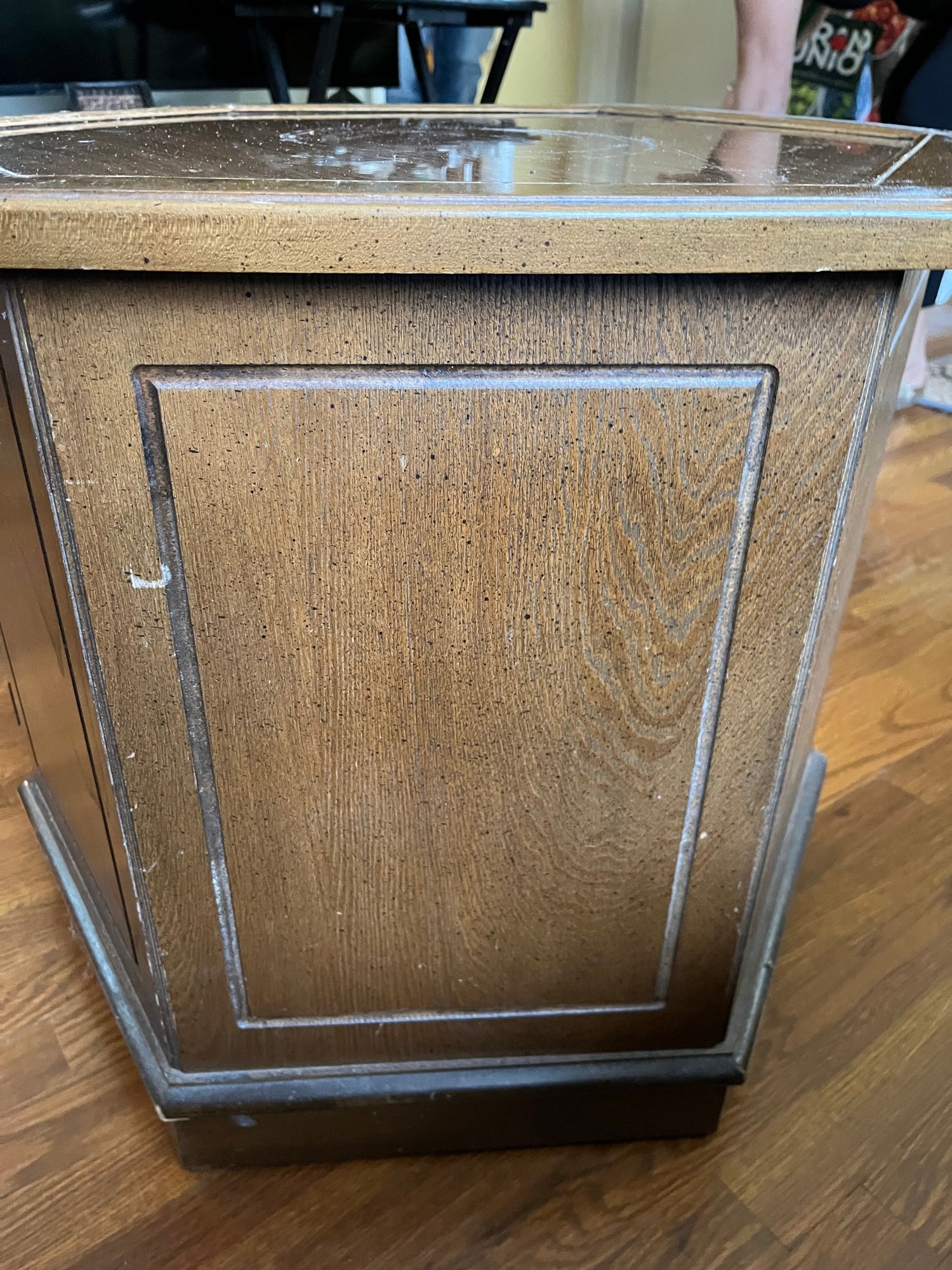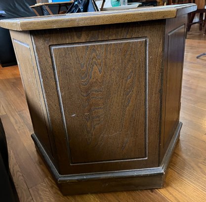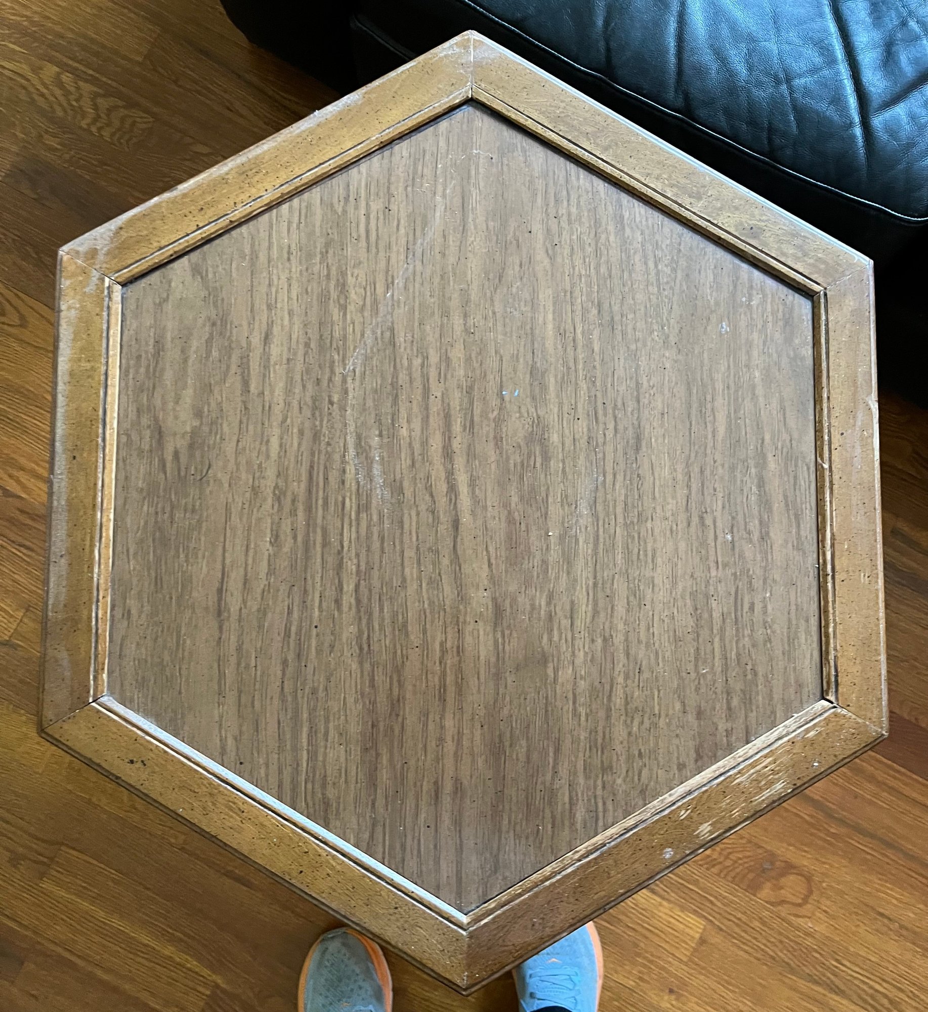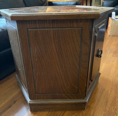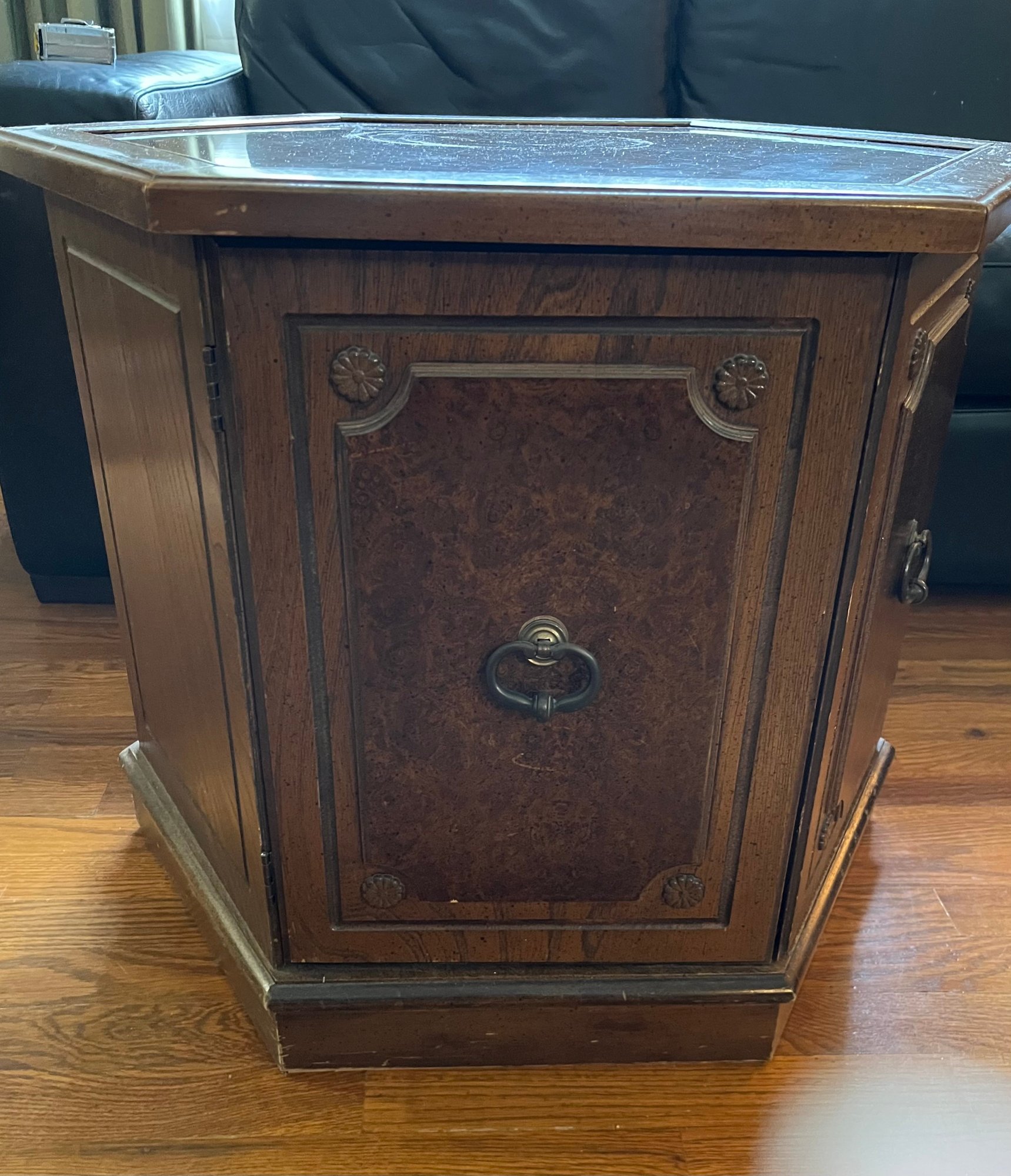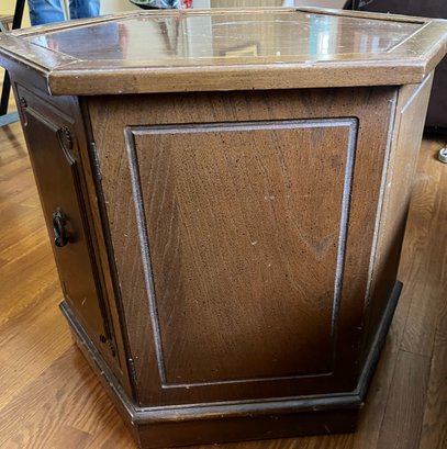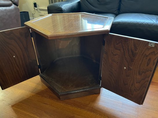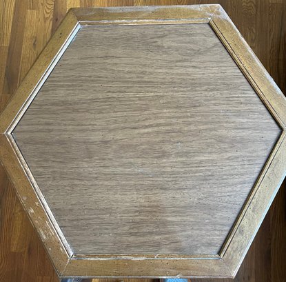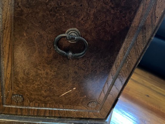 A Mid-century Hexagonal Burl Wood Veneer Side Table With Ring Pulls