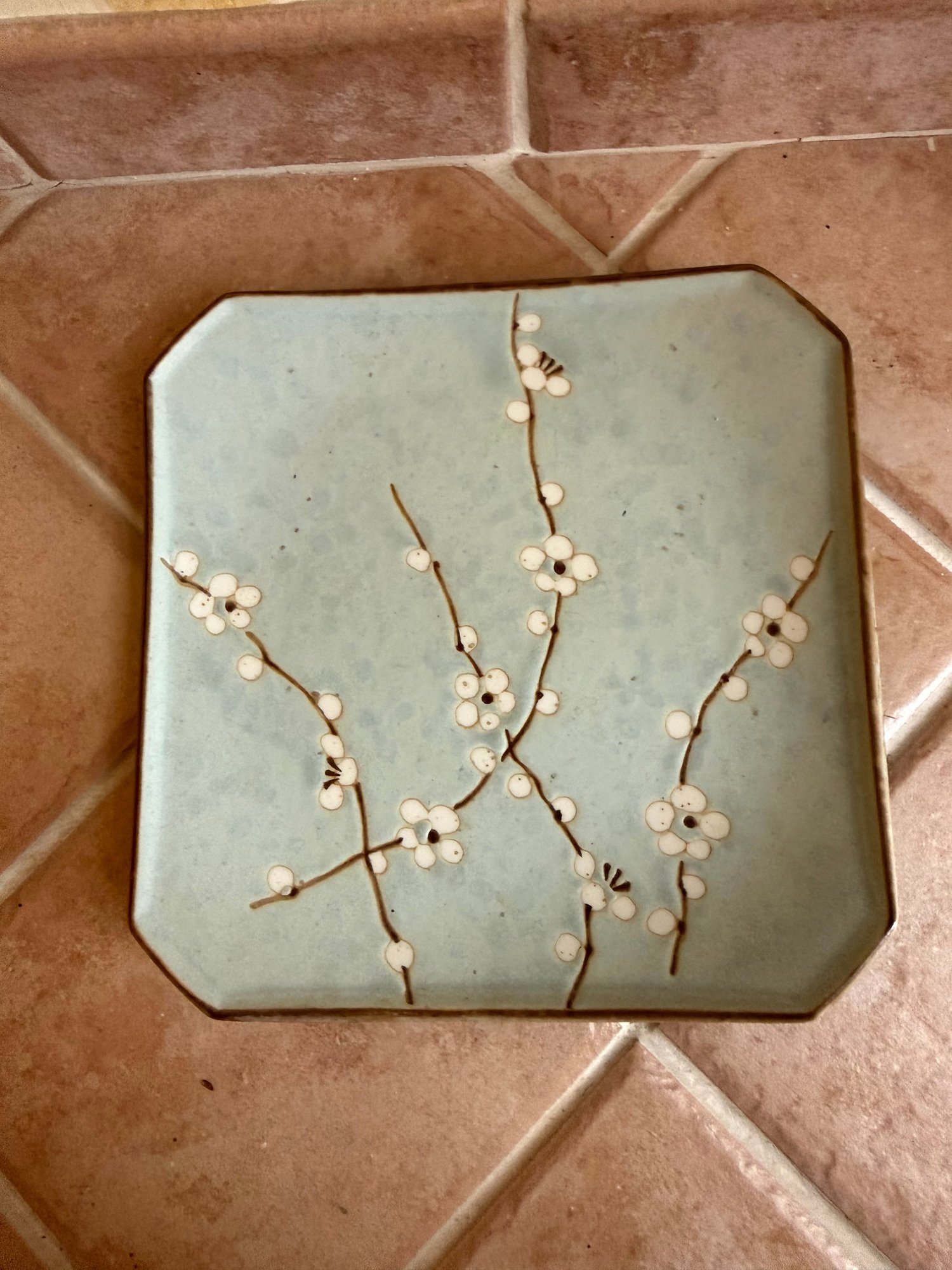 A Modern Japanese Ceramic Plate With A Matte Glaze And Cherry Blossom Design