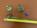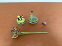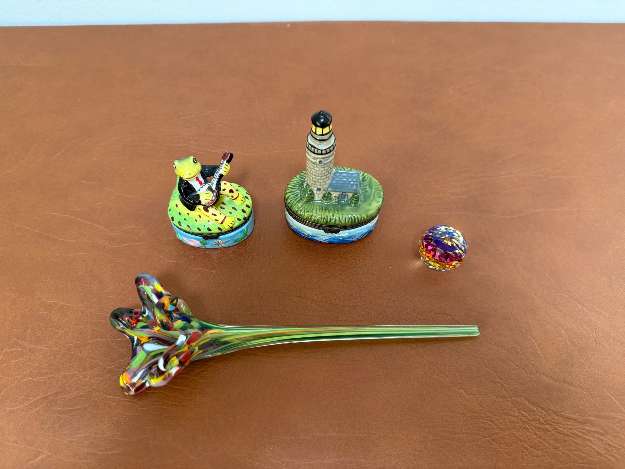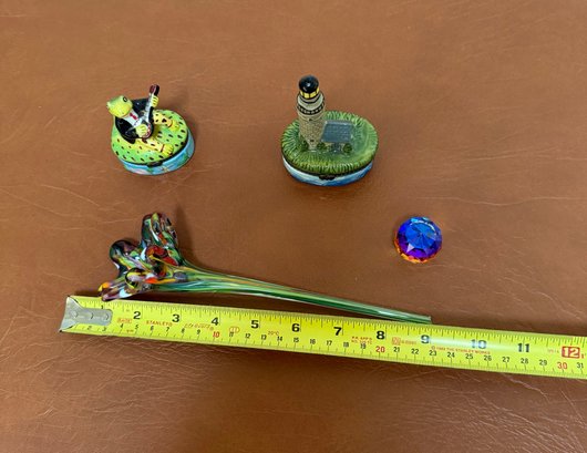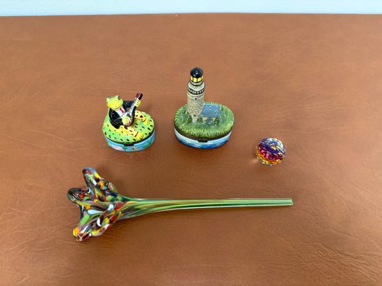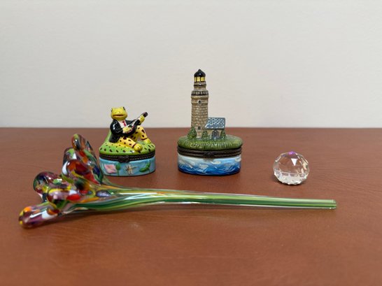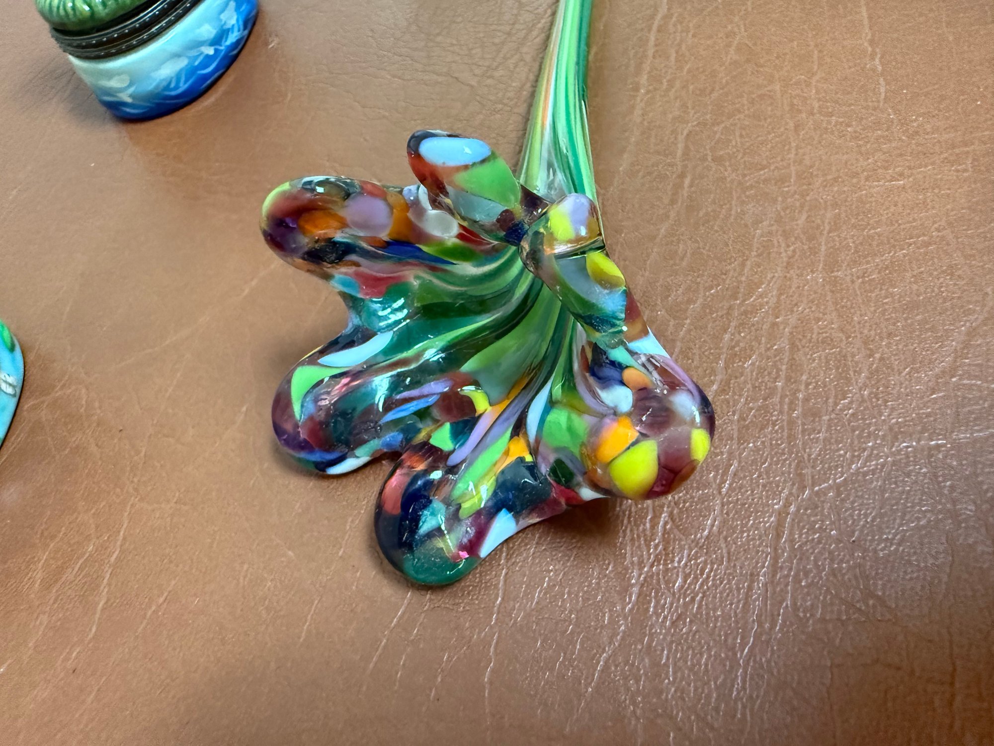 A Multi-colored Blown Art Glass Flower With A Long Stem, Trinket Boxes And Glass Small Sphere