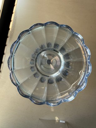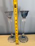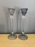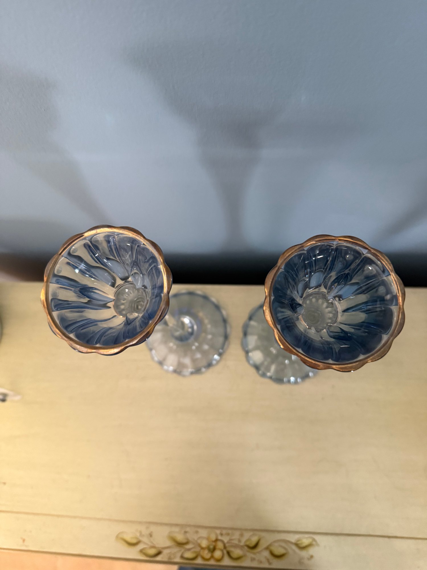 Pair Of Iridescent Blue Glass Candlesticks With Gold Rims