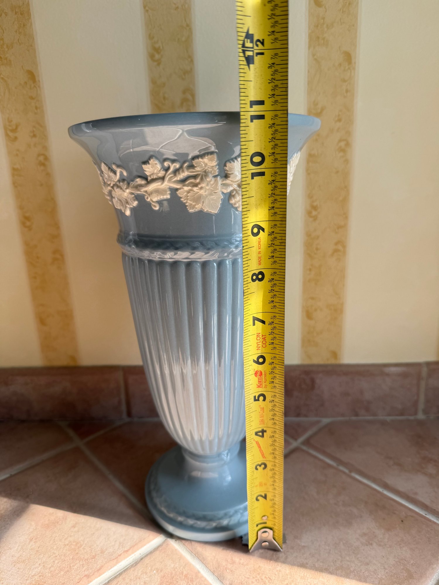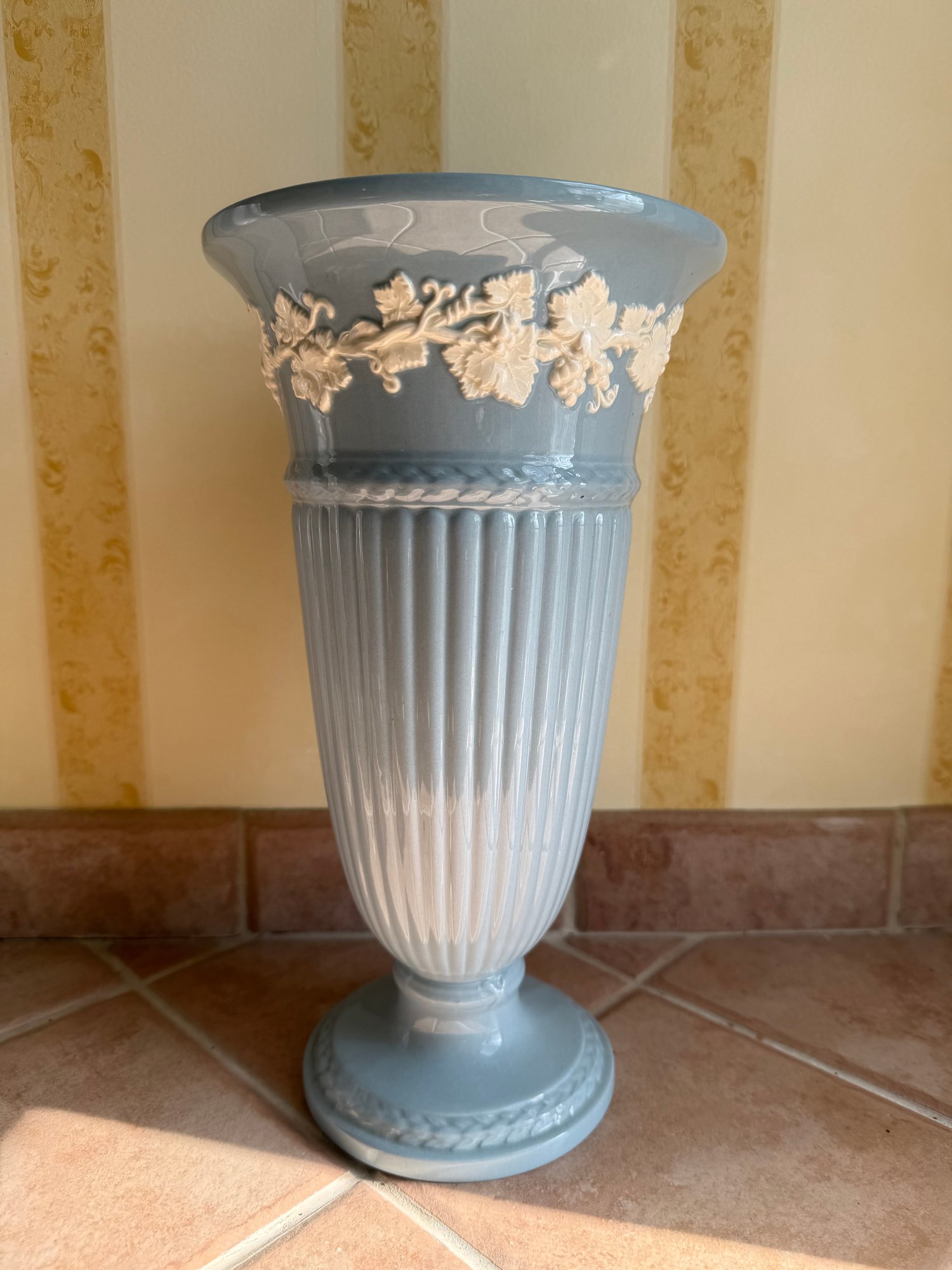 Pale Blue Wedgwood Queen's Ware Vase With White Grapevine Relief