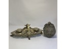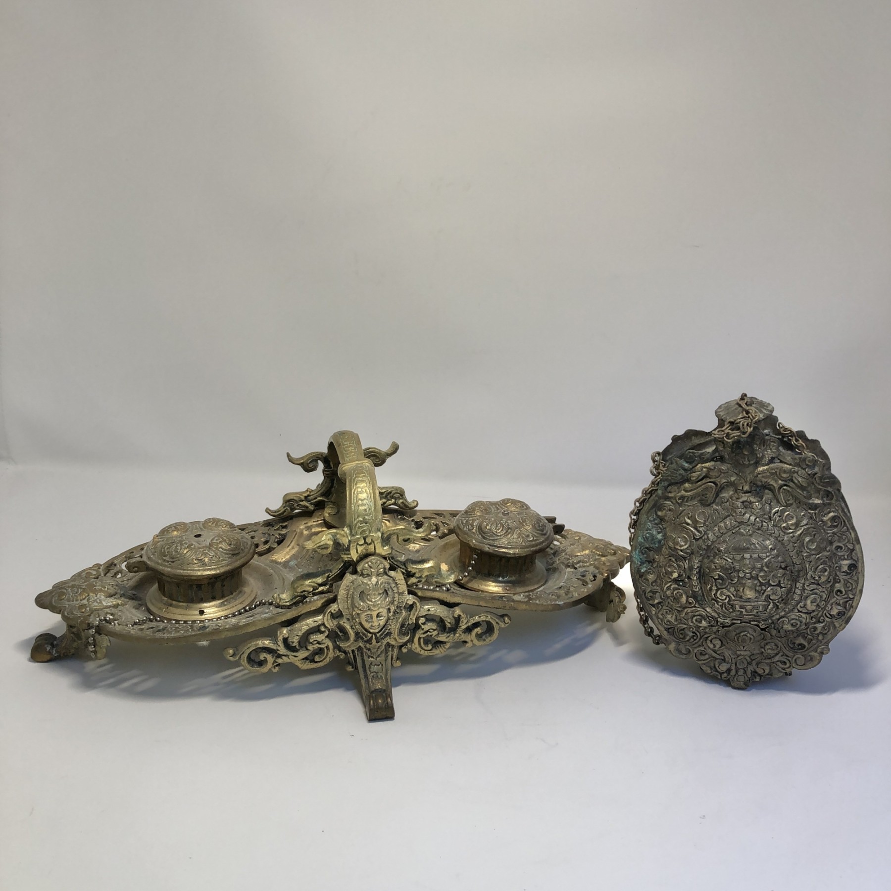 Notes: 18th Century Balkan Russian Powder Hask Repousse is in good condition for age of item. Ink well legs need tightening and chains are not fully attached.