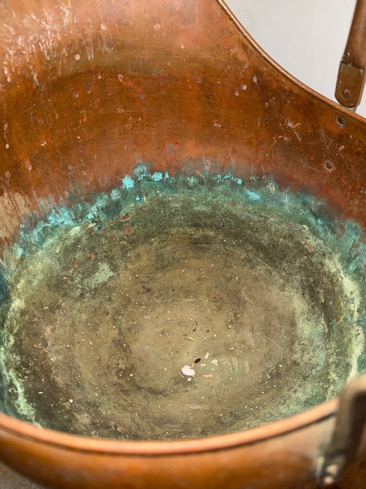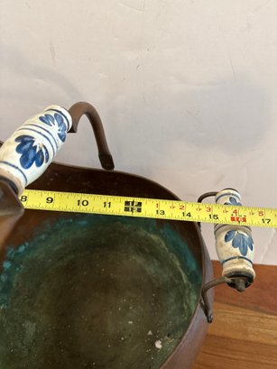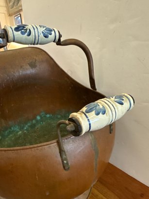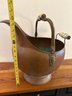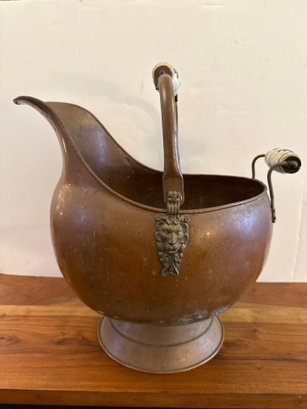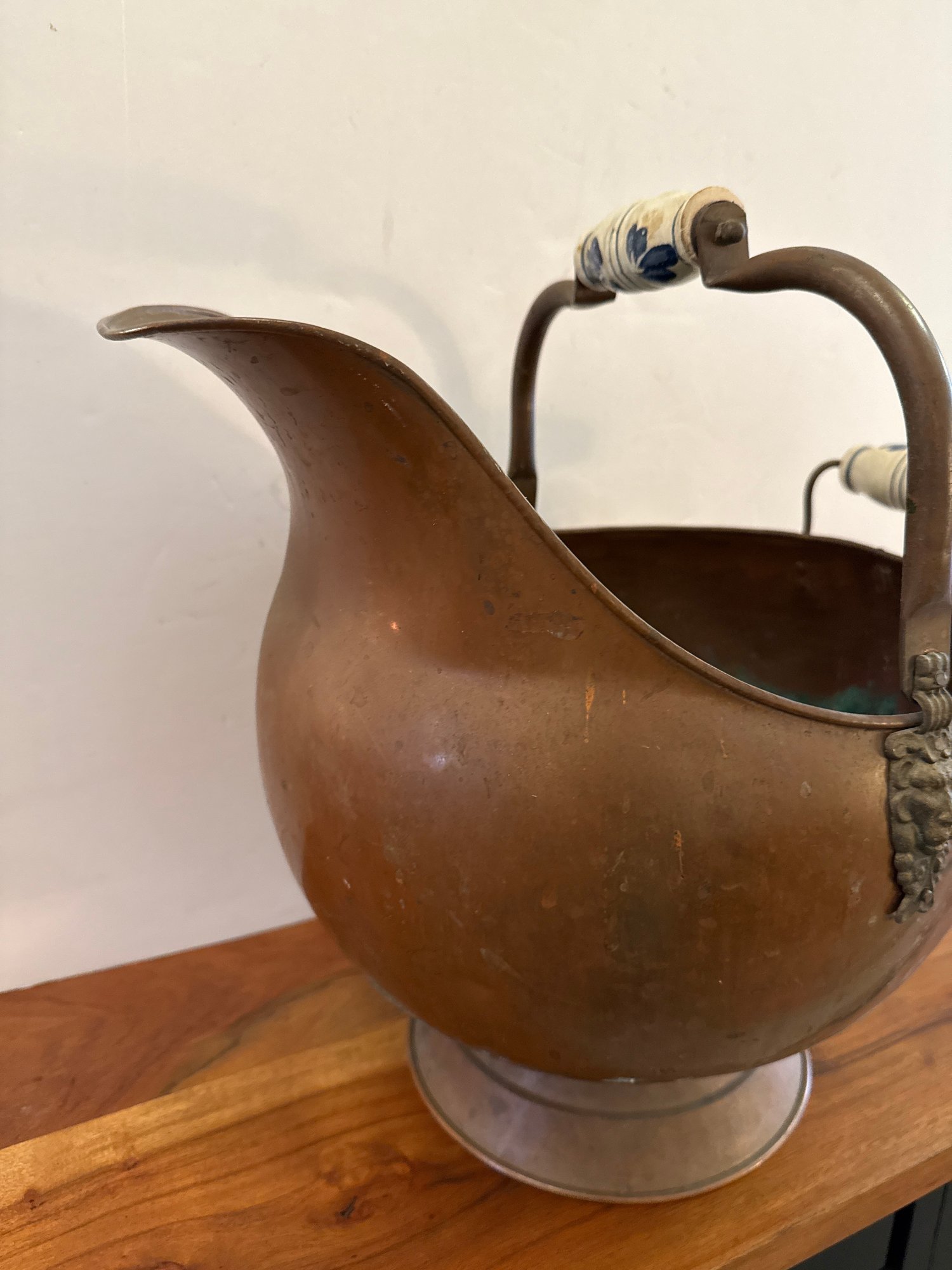Antique Copper Coal Scuttle With Porcelain Handles And Brass Lion's Head