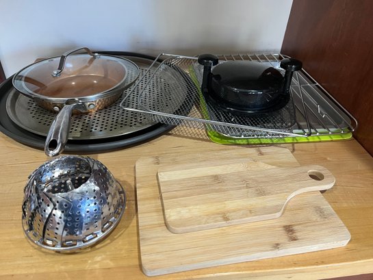 Assorted Kitchen Items Baking Trays, Steamer, Cutting Boards, Cooper Skillet, Lid, And Chicken Shredder