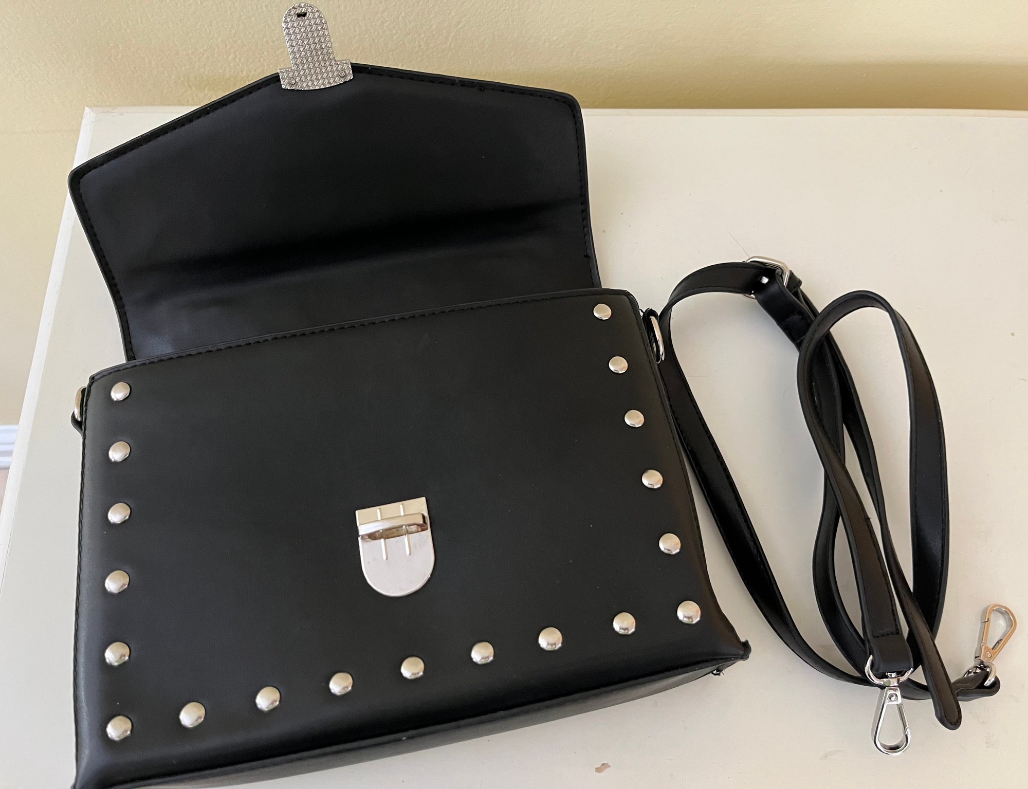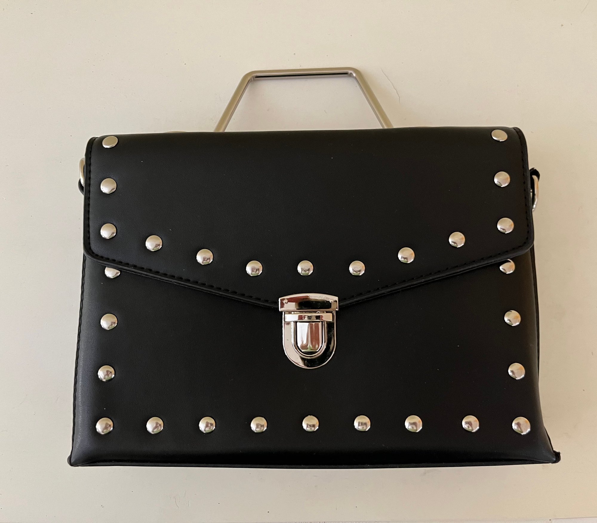 Black Leather Crossbody Bag Features Stud Detailing And Silver Hardware