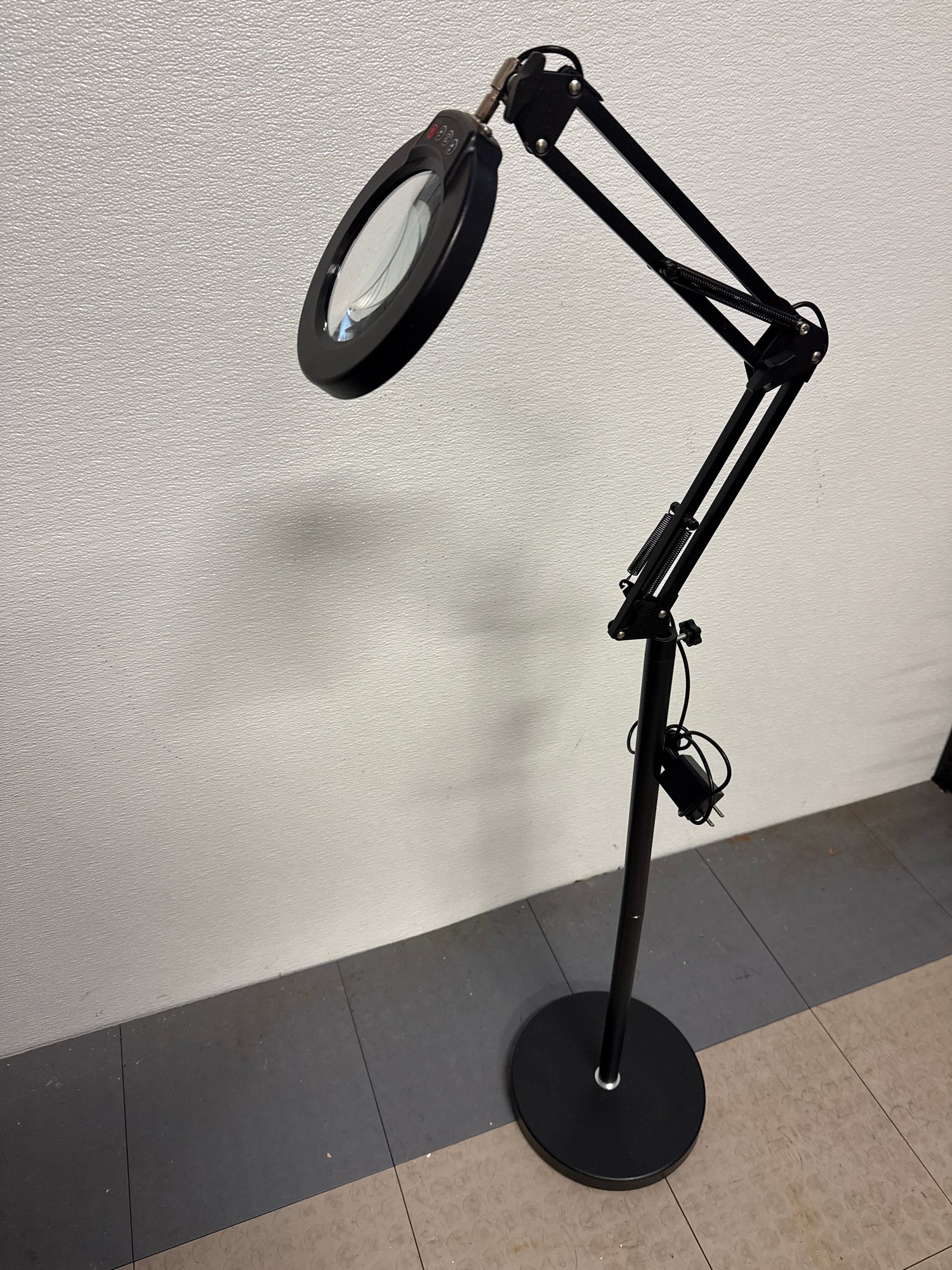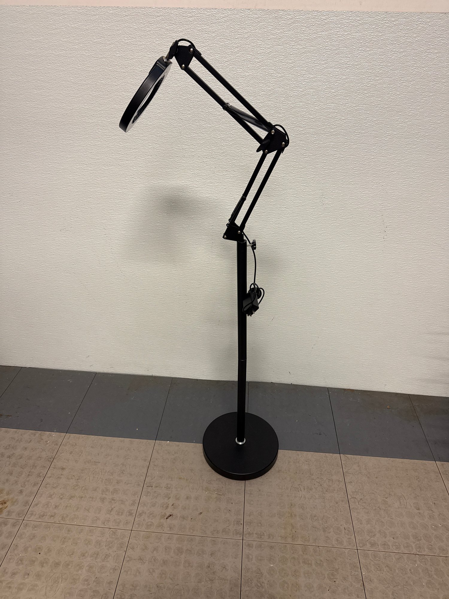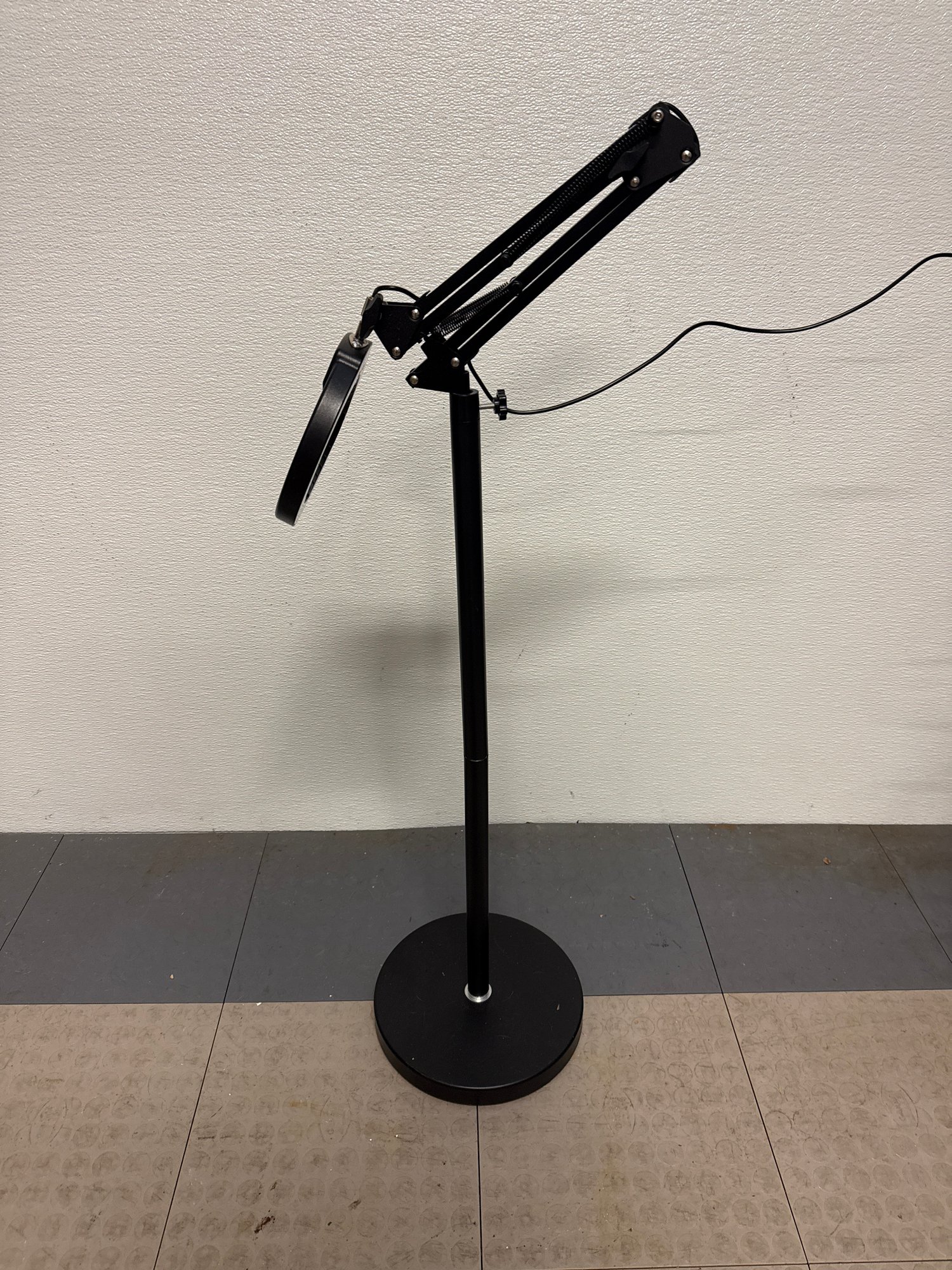 Black LED Magnifying Lamp With A Floor Stand And An Adjustable Swing Arm