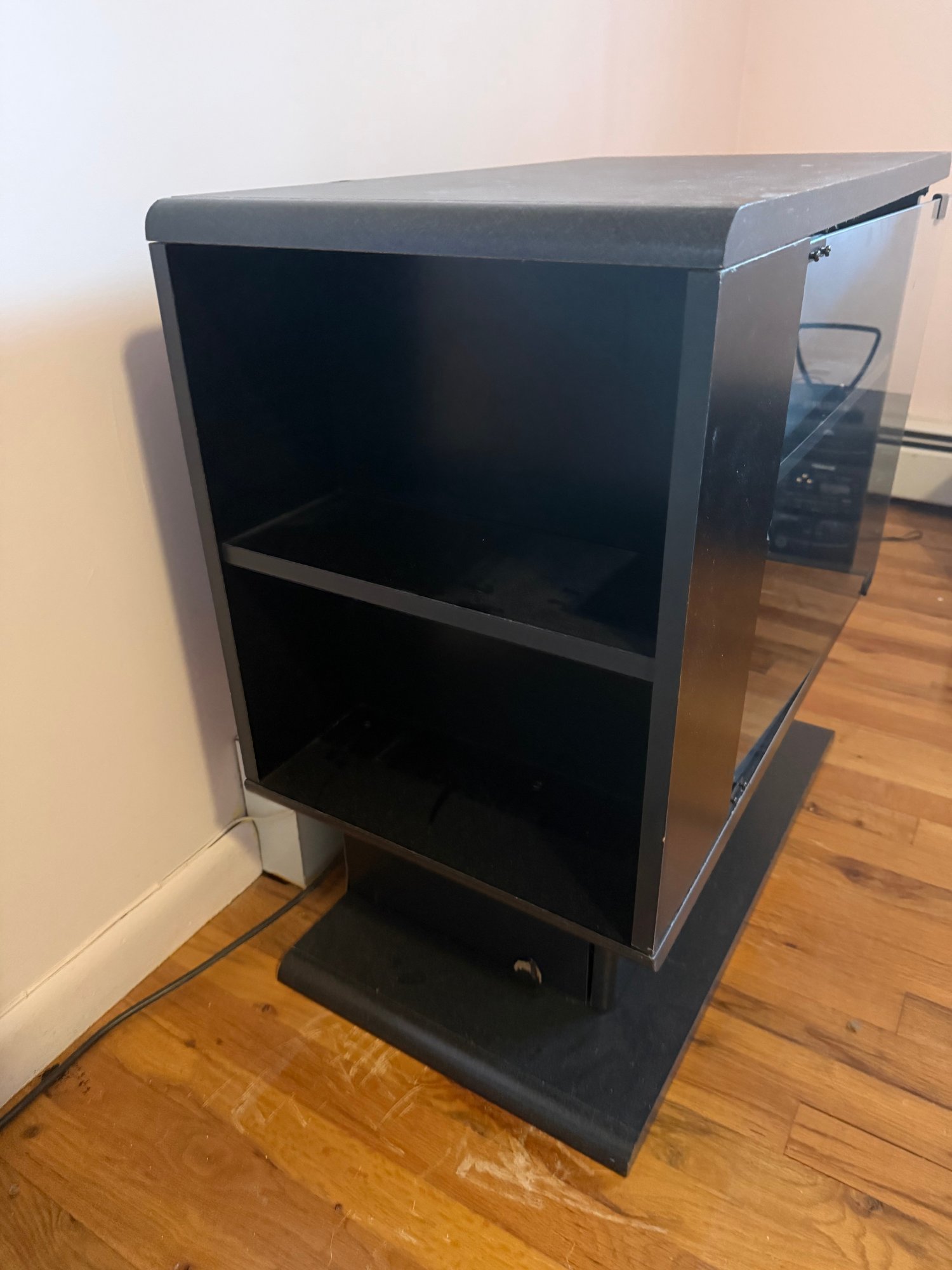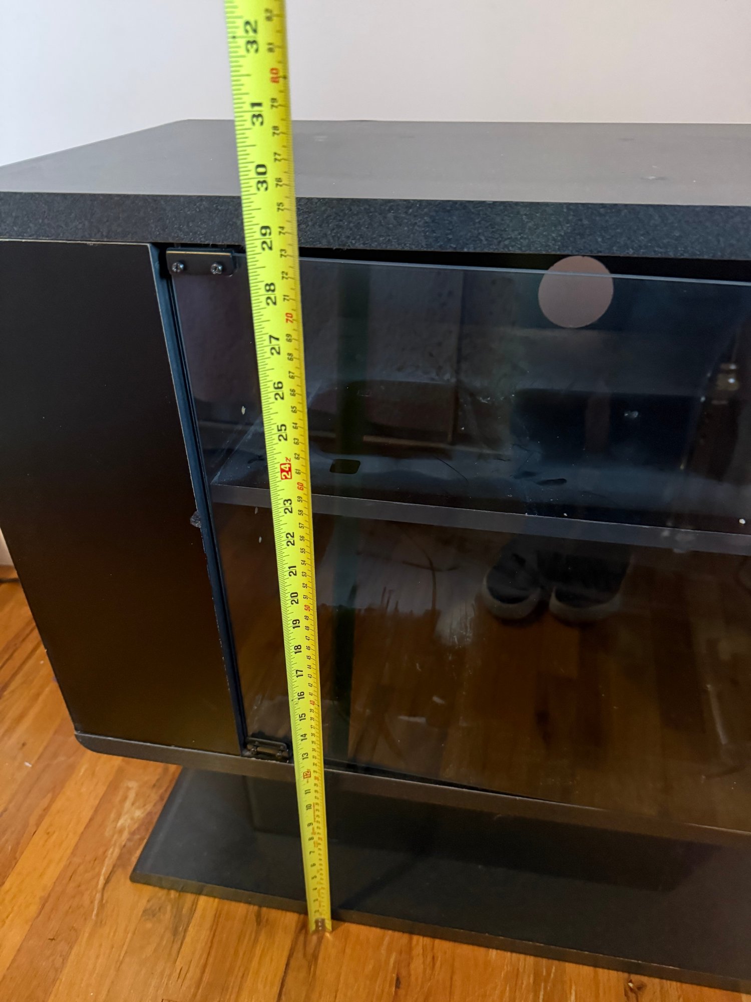 Black Media Stand Featuring Glass Door And An Inner Shelf