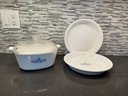 Blue Flower Corning Ware: Lidded Casserole Dish, And 2 Pie Plates