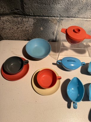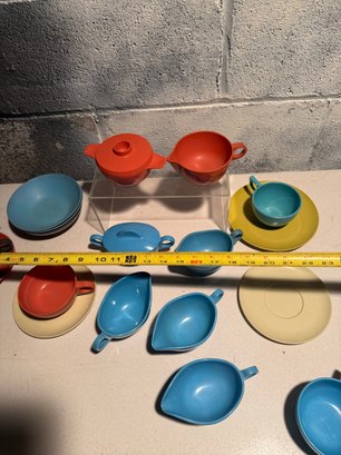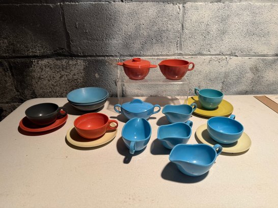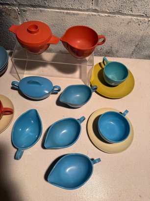 Capac, And Durawear Melmac Mix Of Cups, Saucers, Plates, Bowls Creamer And Sugar