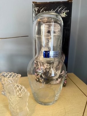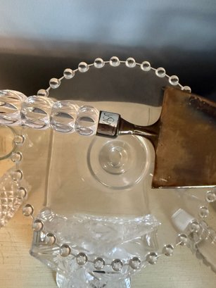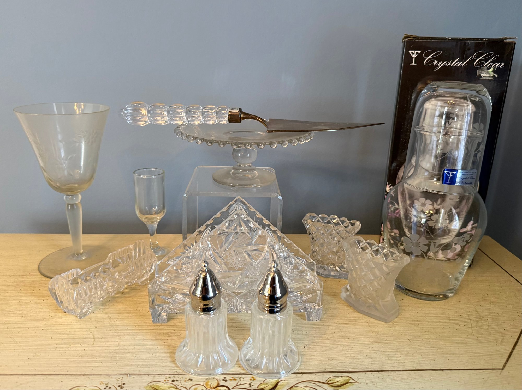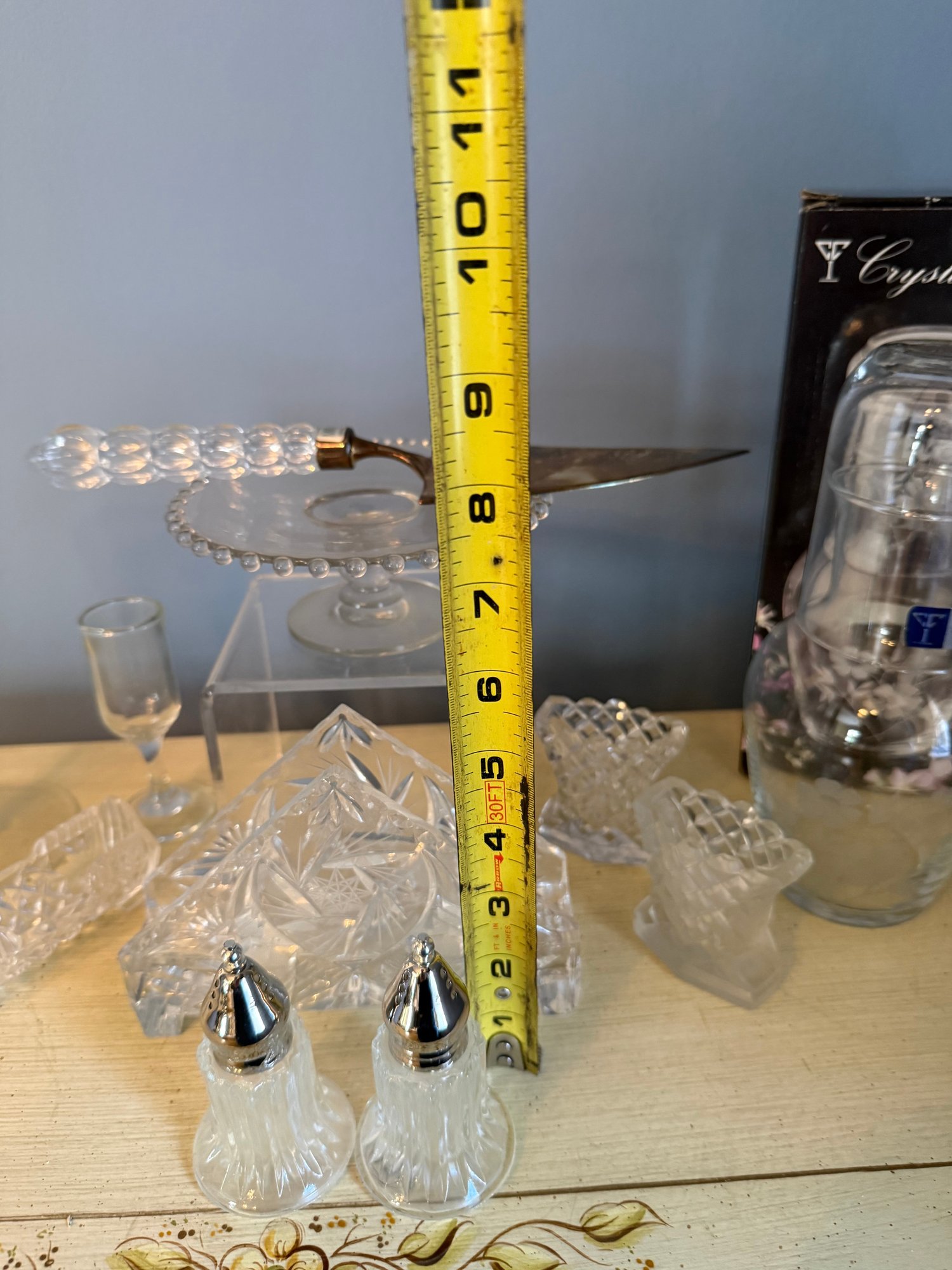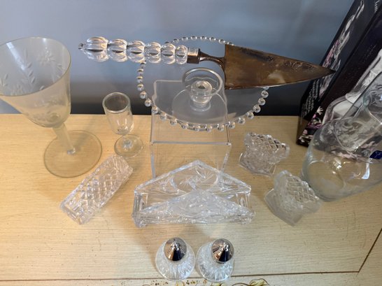 Cut Glass Lot: Salt/pepper Shakers, Napkin Holder, Side Table Water Pitcher, Cupcake Holder, Pie Cutter & More