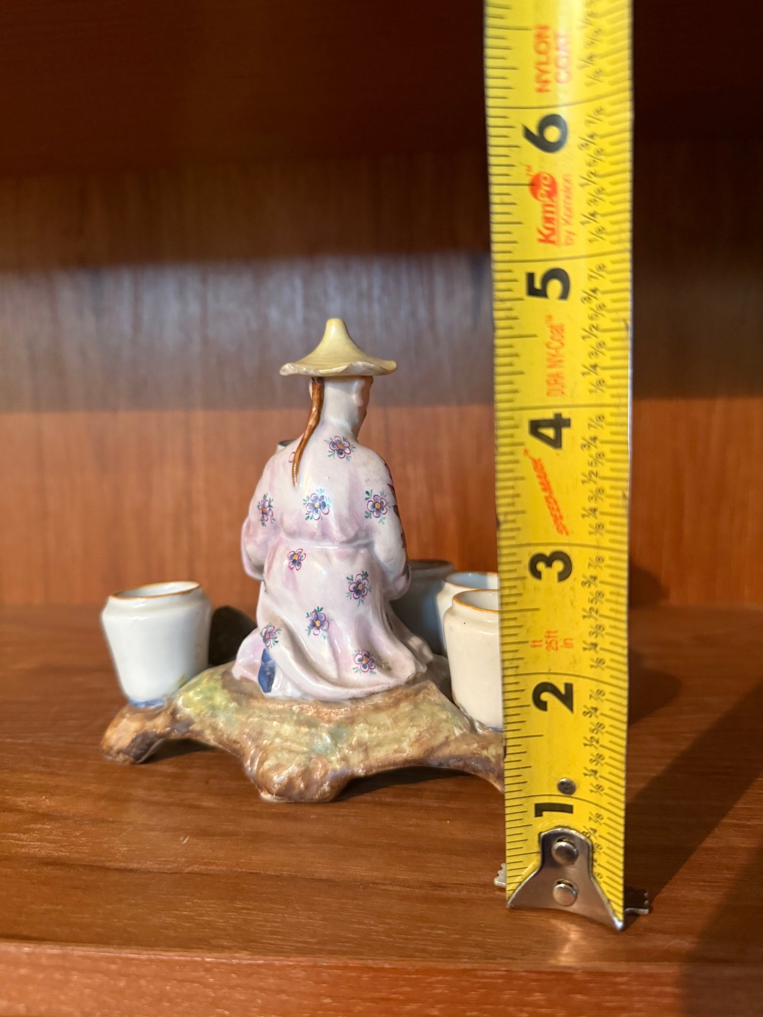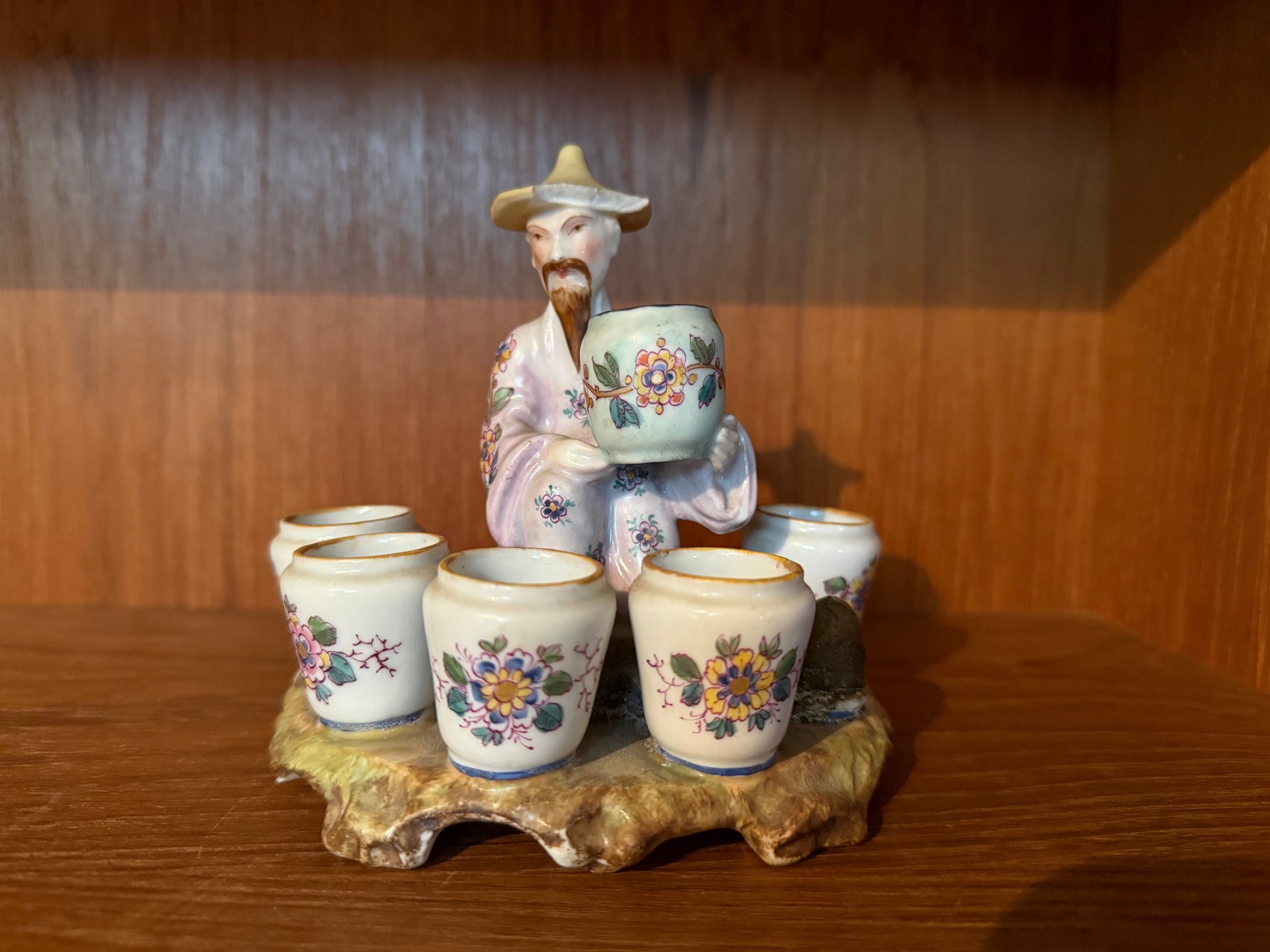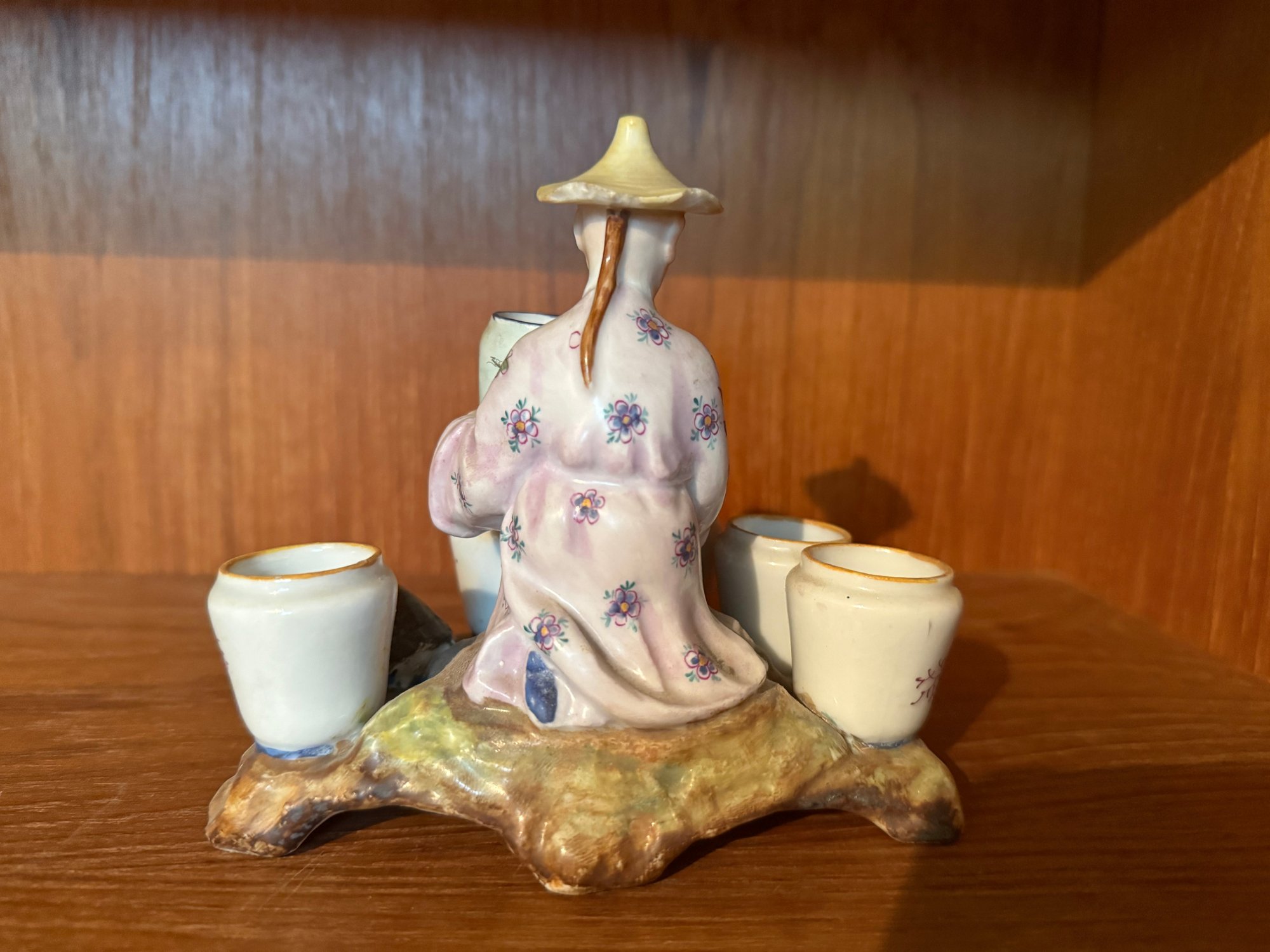 Decorative Porcelain Set Of An Asian Man With Six Floral-painted Cups