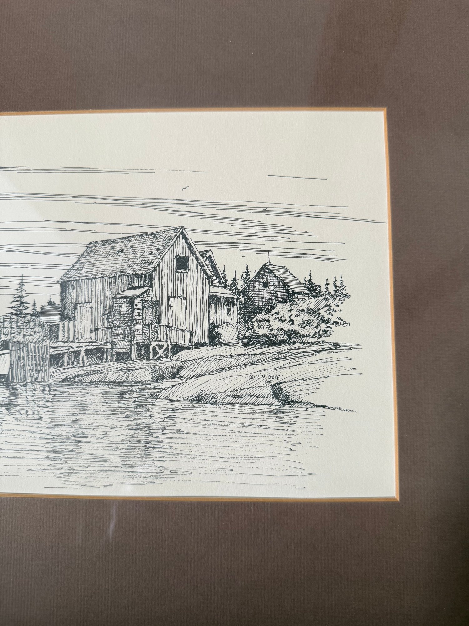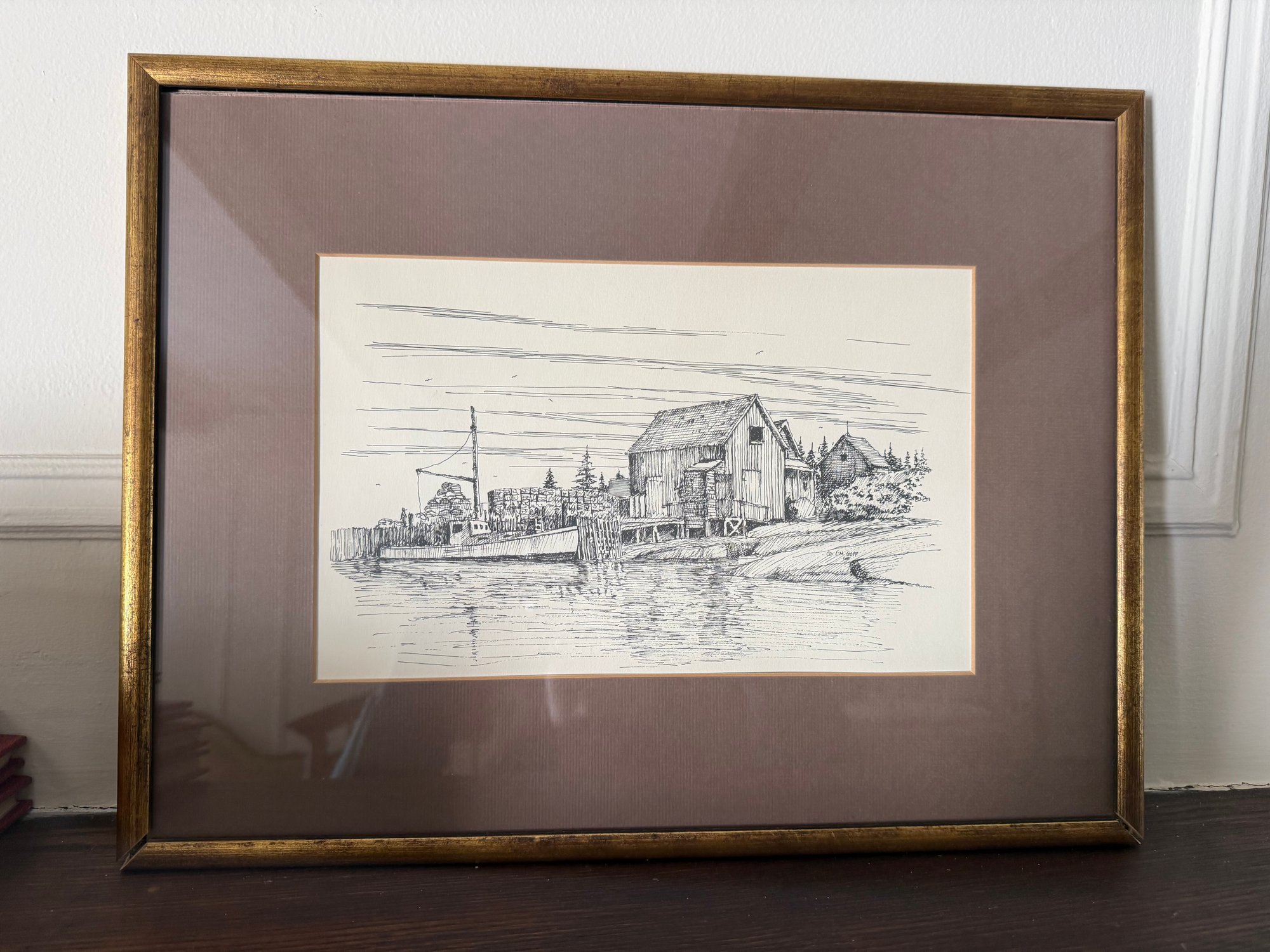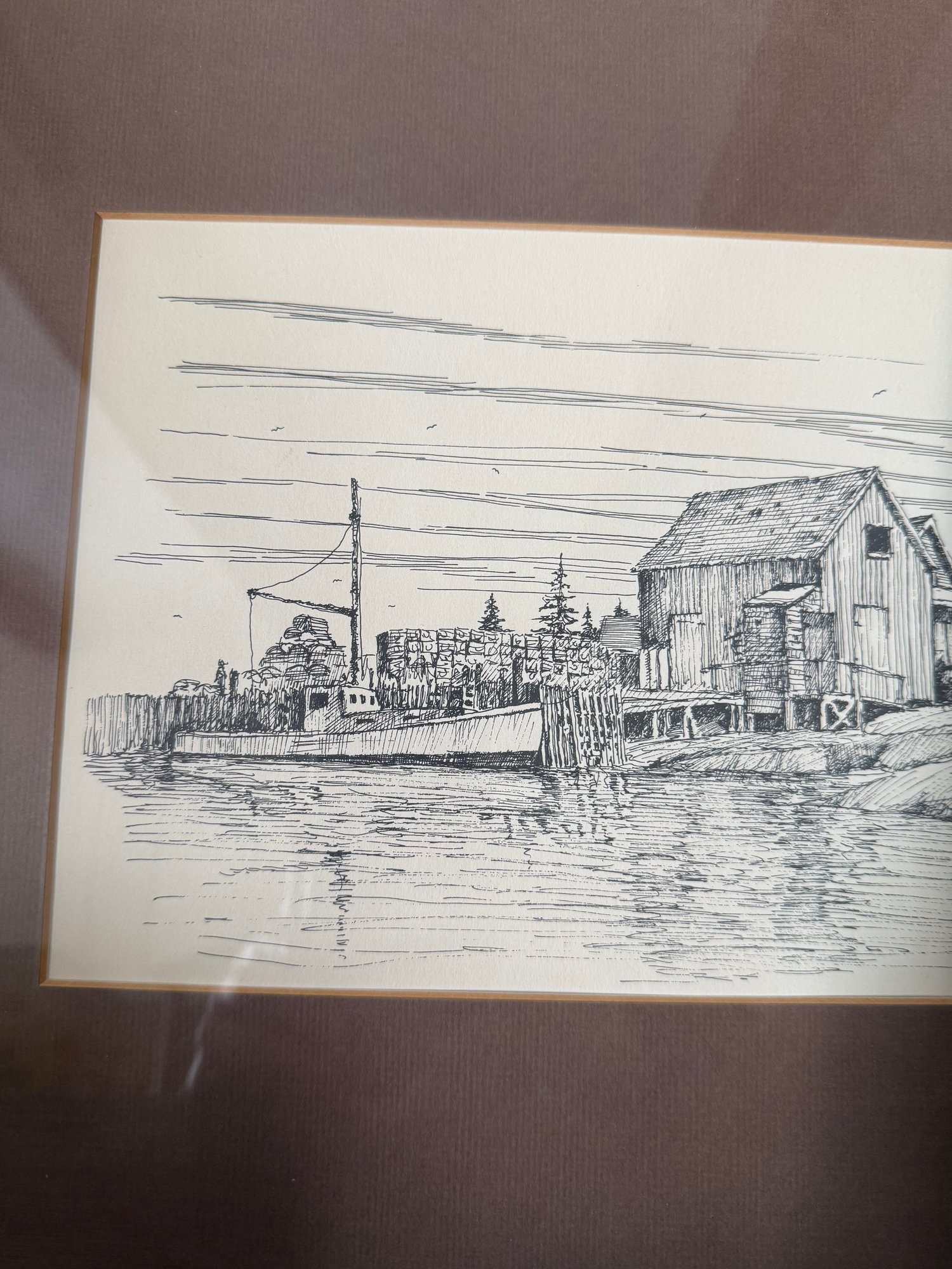 Pen And Ink Drawing Of A New England Harbor Scene