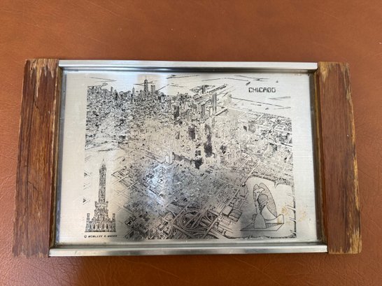 Etched Metal Tray Depicting Chicago Skyline By K. Mager, 1975