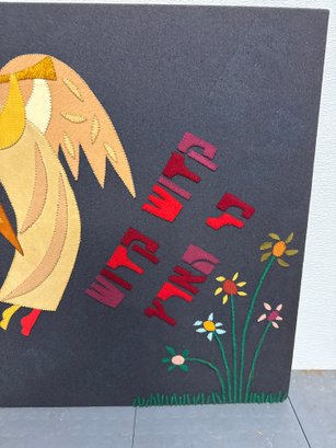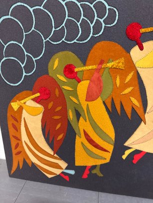 Folk Art Fabric Depicting Angels Playing Trumpets With Hebrew Text.