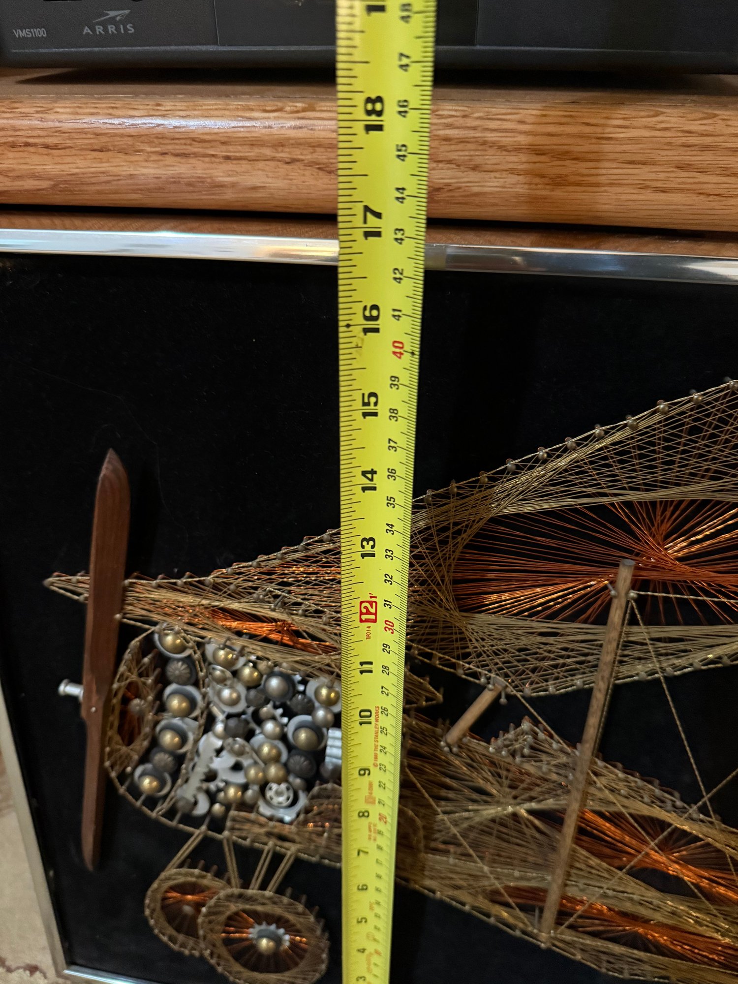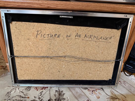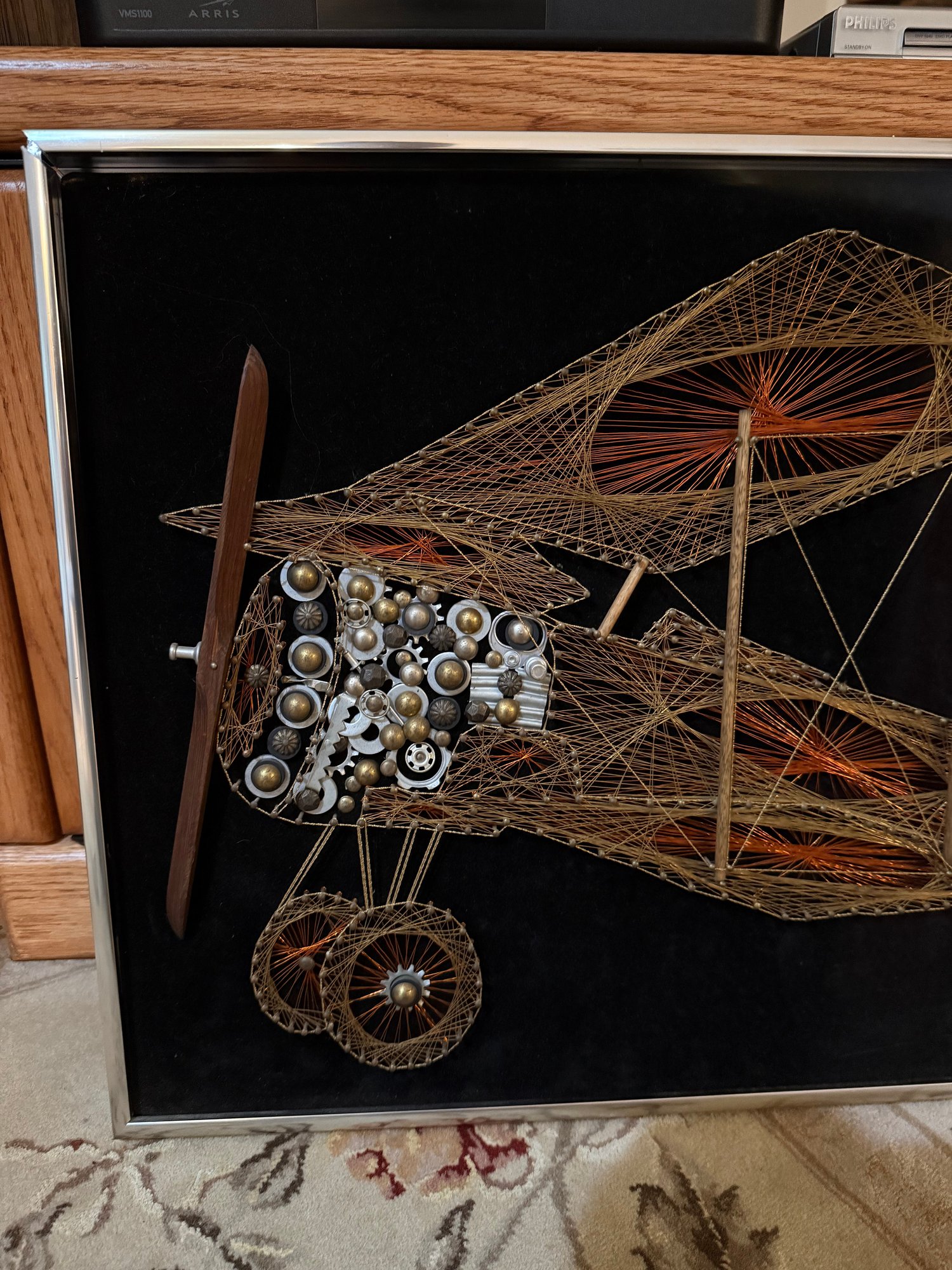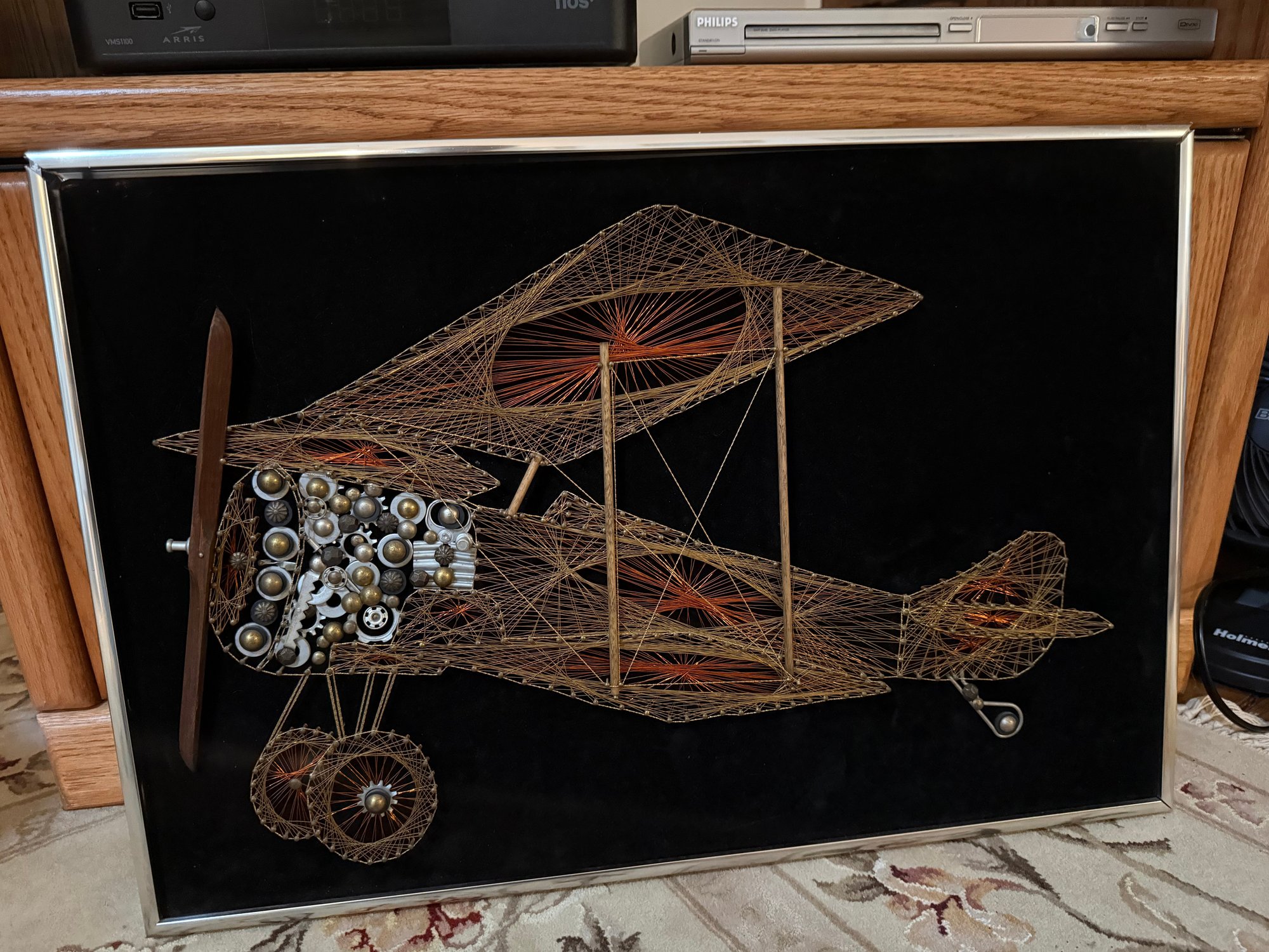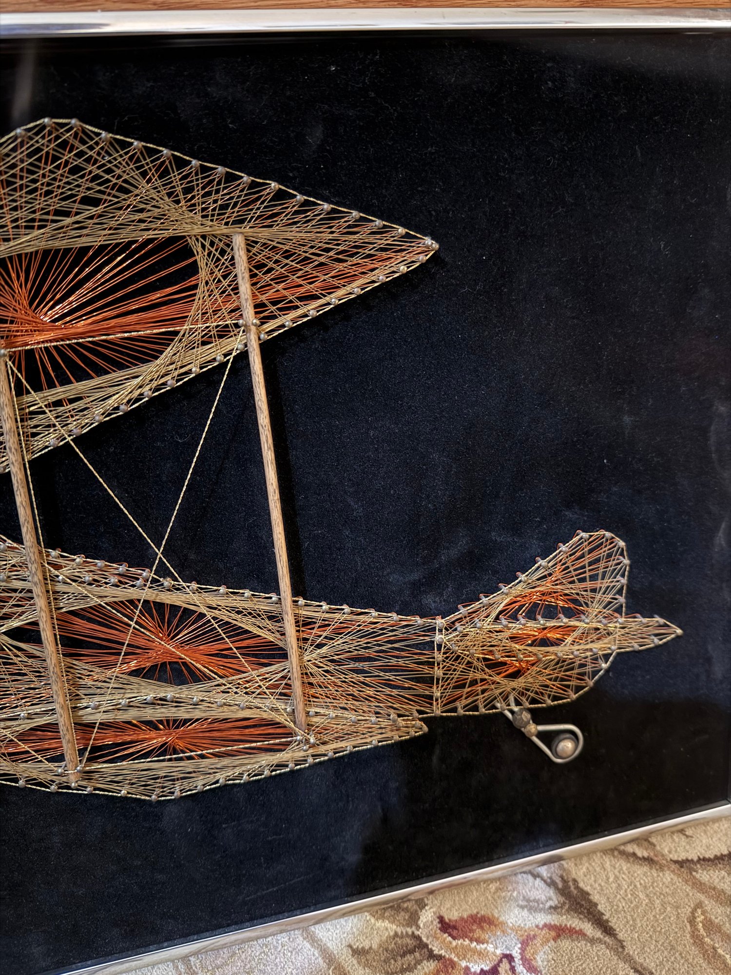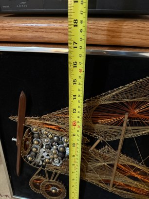 Framed Mid Century String Art Biplane With Mixed Media Elements On Black Velvet.