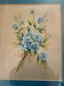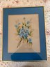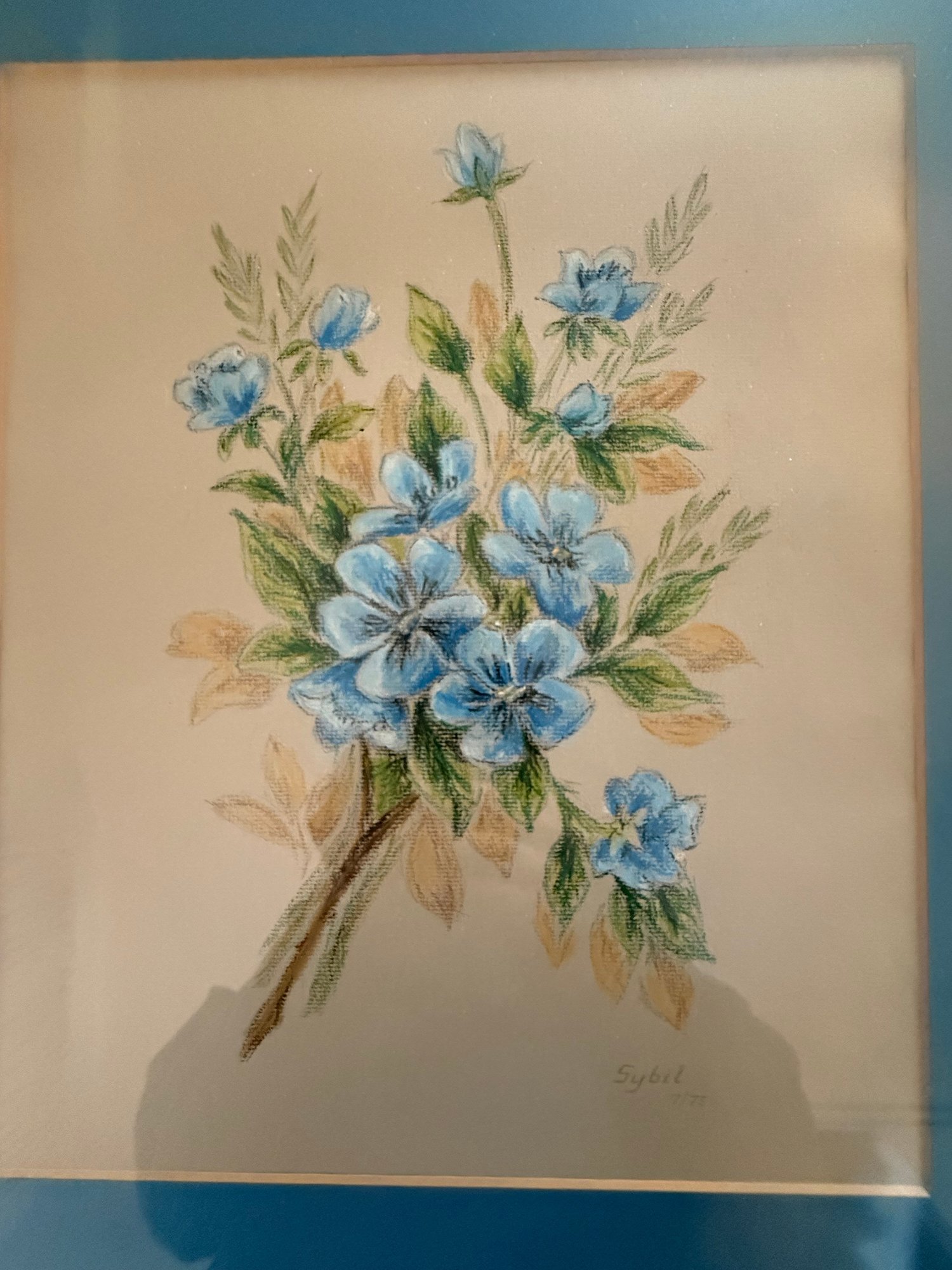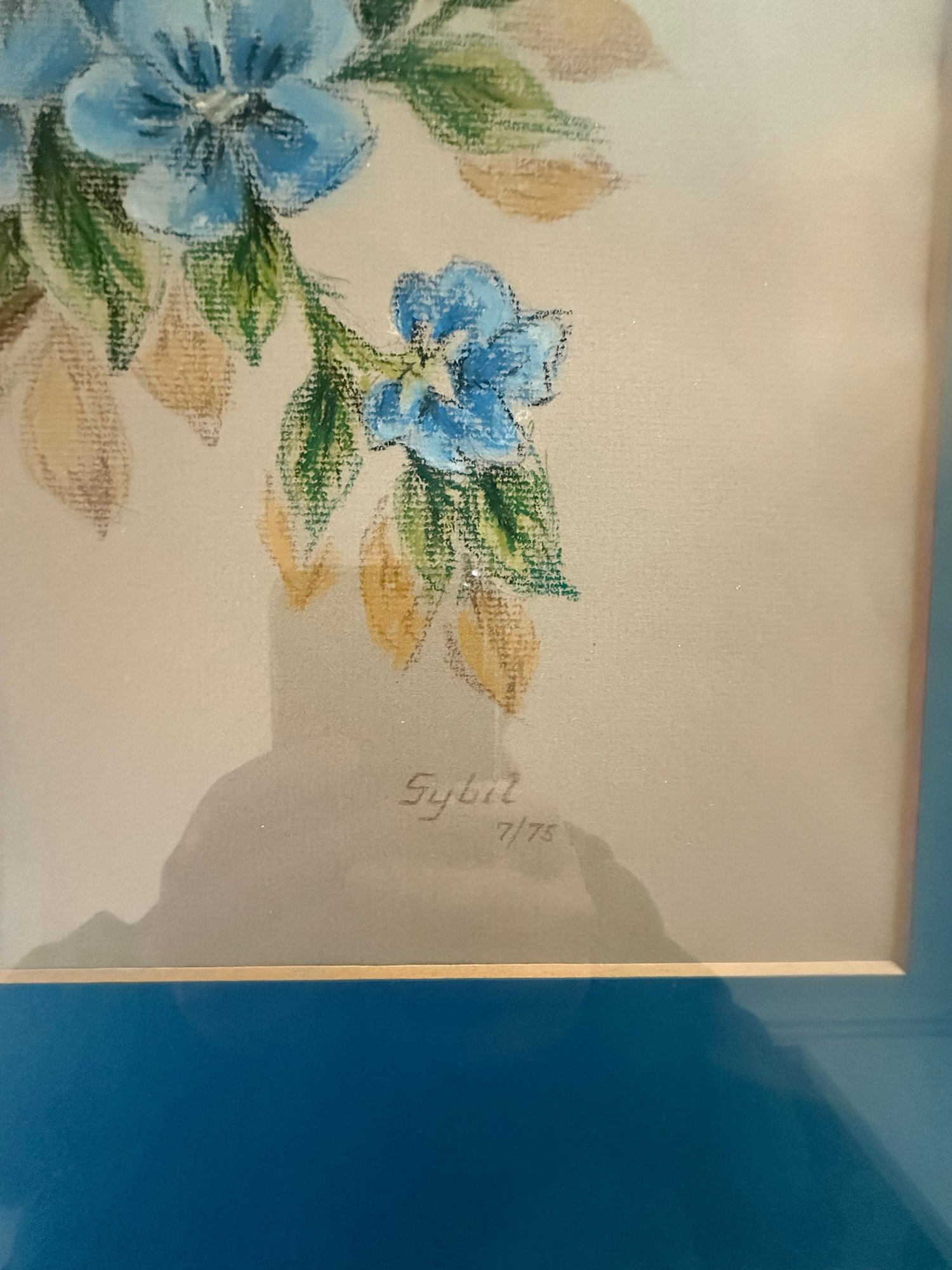 Framed Pastel Drawing Of Blue Flowers Signed Sybil, Dated 1975