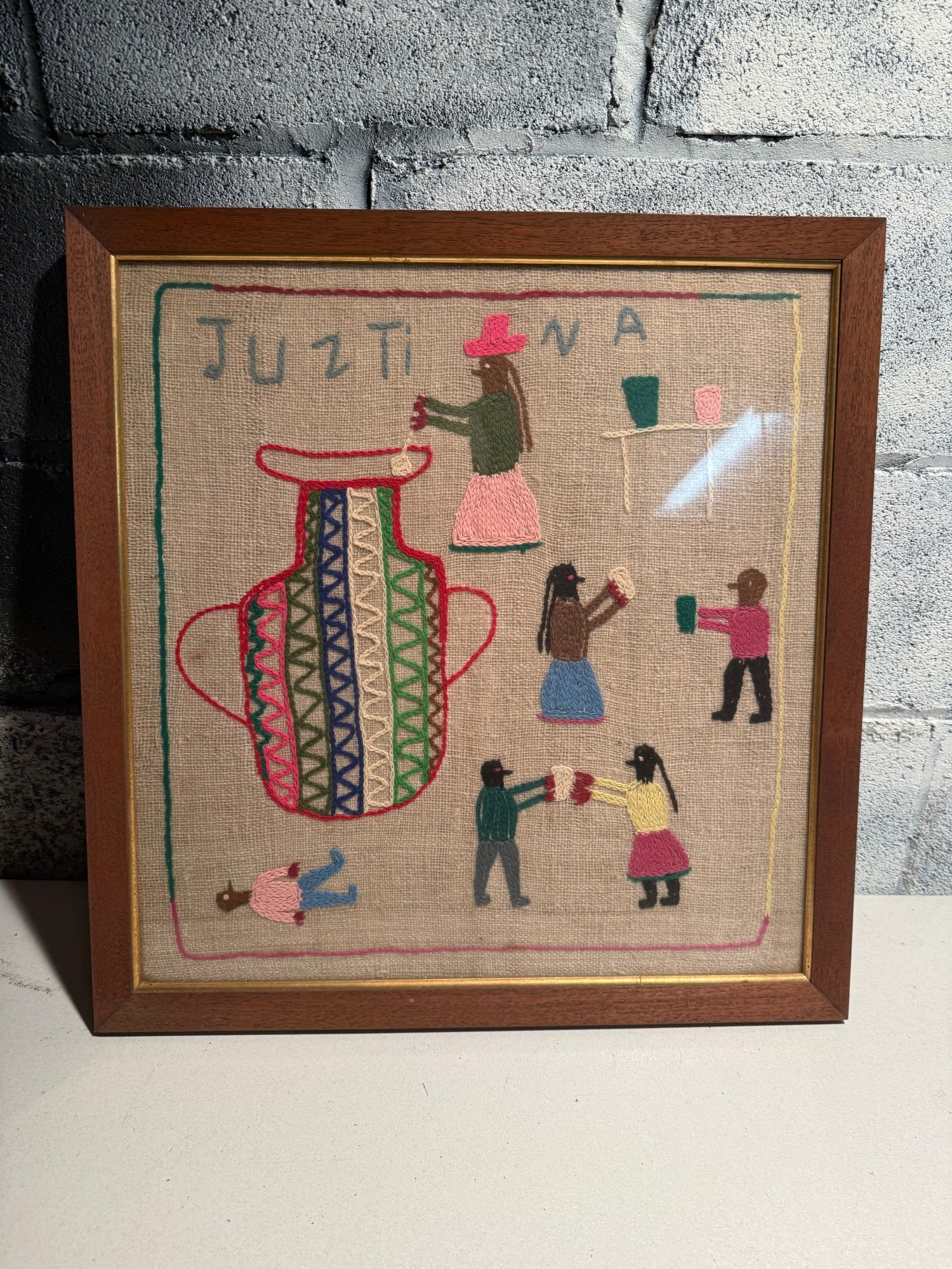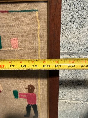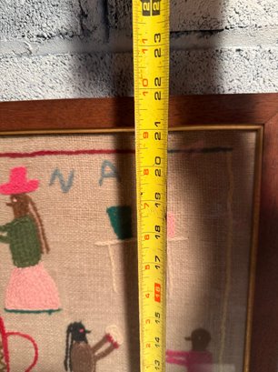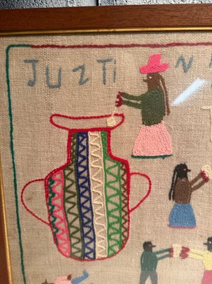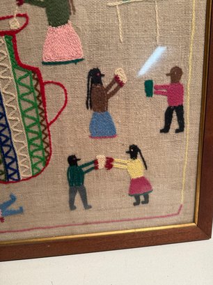 Framed Peruvian Folk Art Embroidery Depicting Figures And A Vase