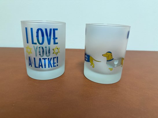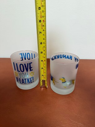 Frosted Glasses With Hanukkah And Latke-themed Graphics
