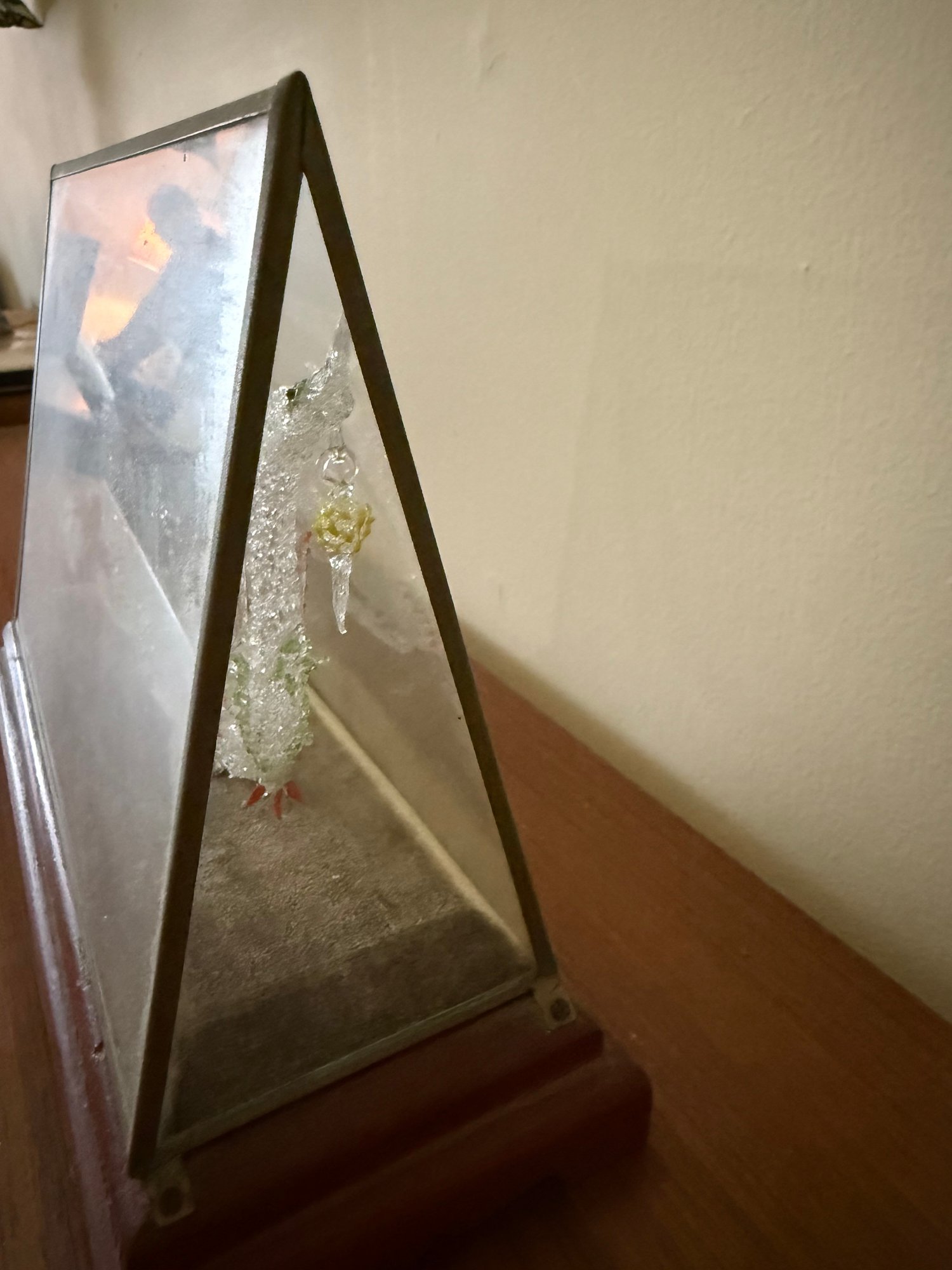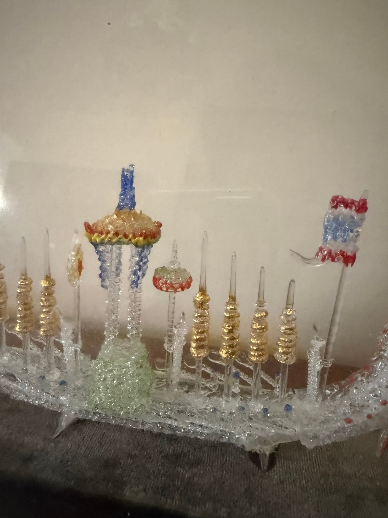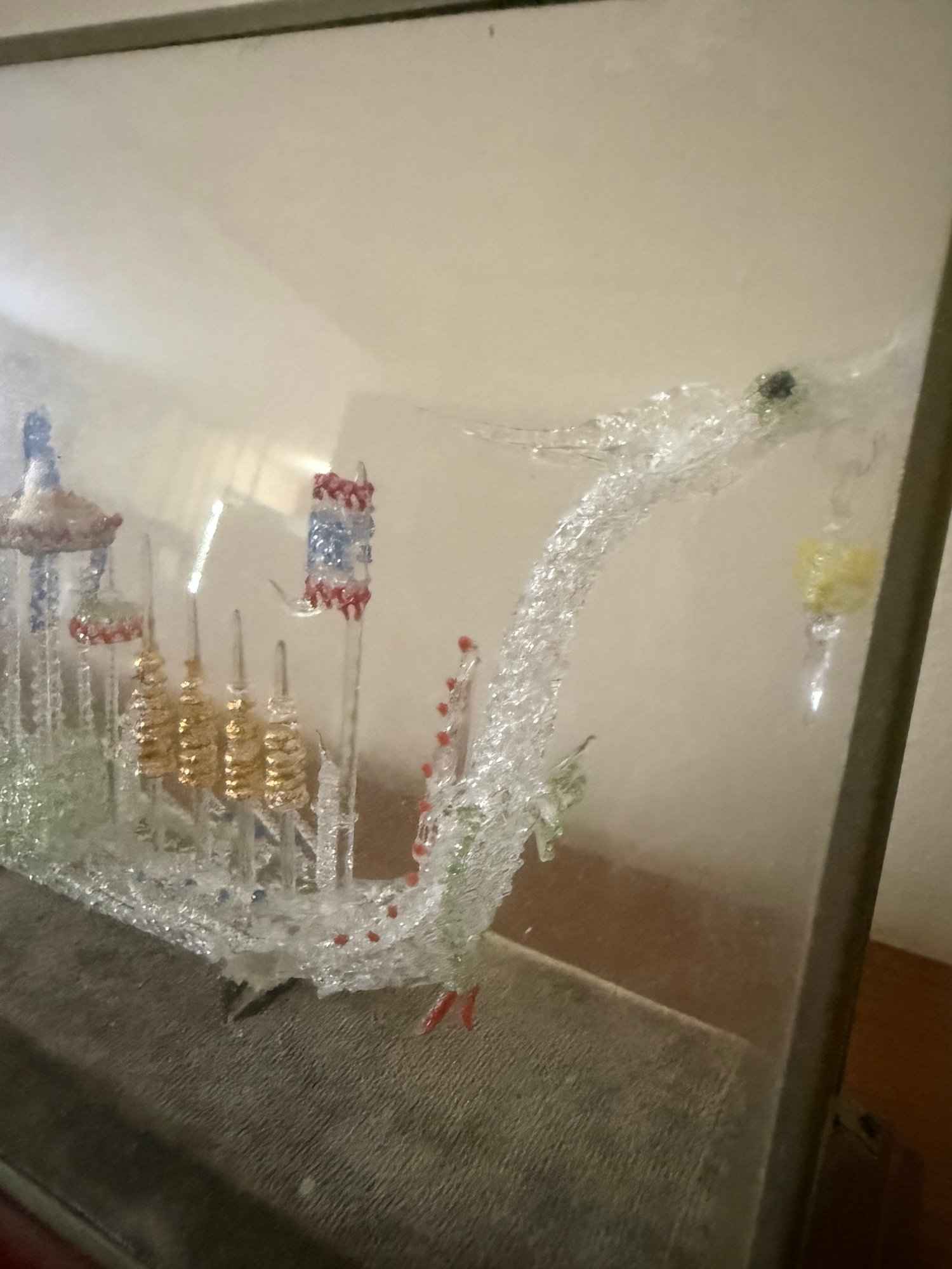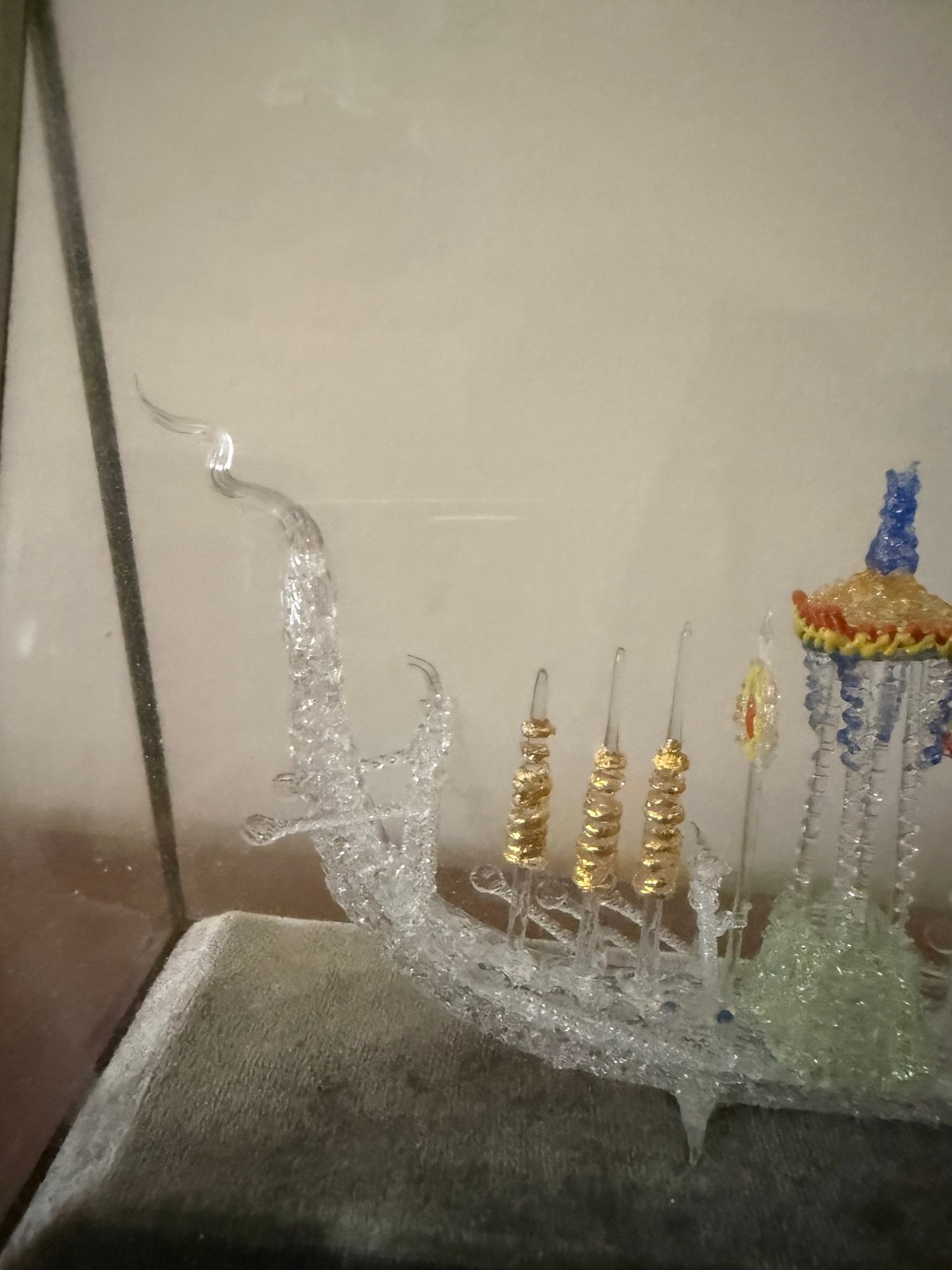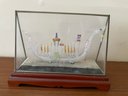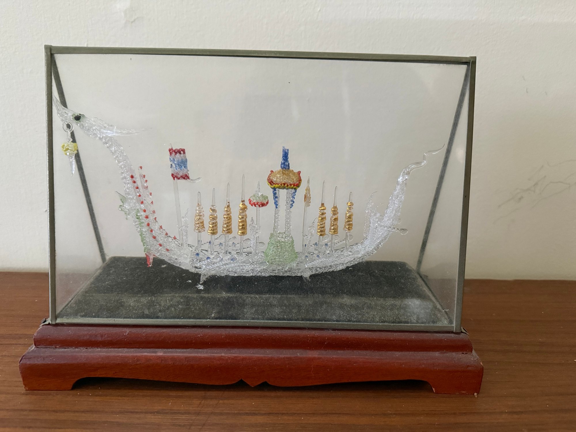 Hand Blown Glass Dragon Boat Glass Case Thailand 1950s Oars Flag Spires Lantern
