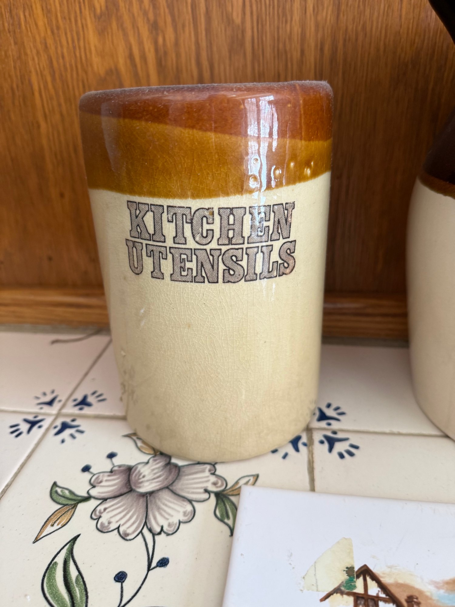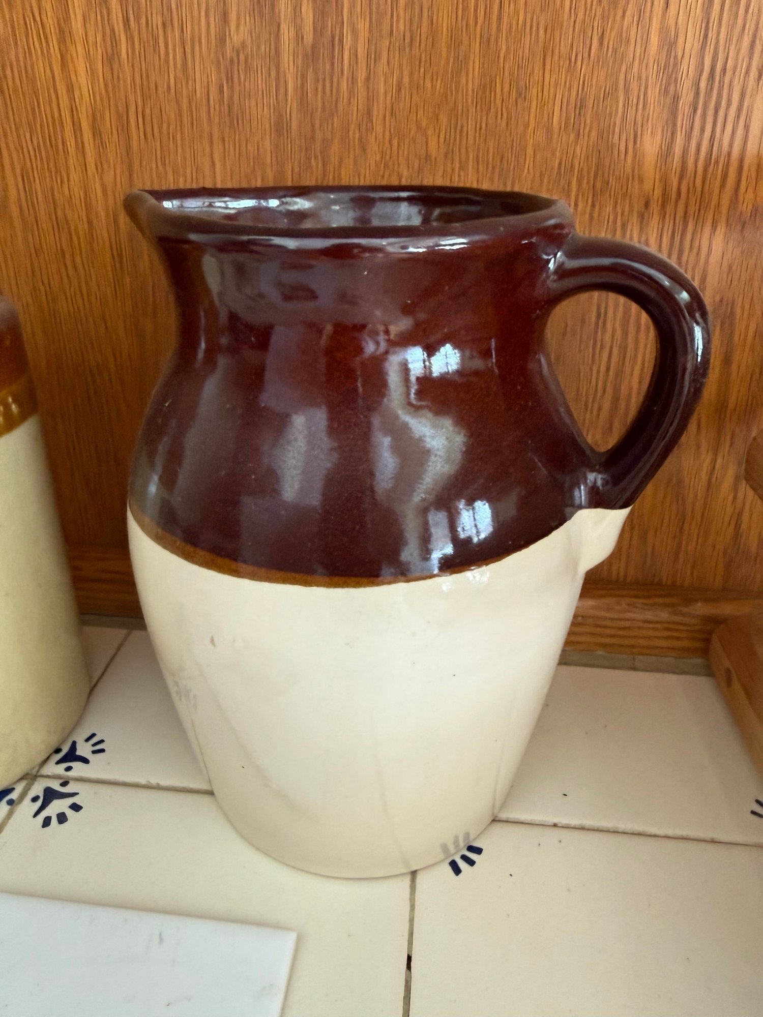Kitchen Utensils" Holder, A Two-tone Brown And Cream Pitcher & Old Coach House York Trivet
