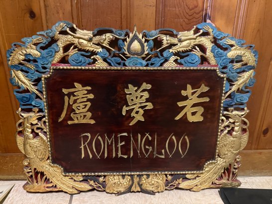 Gilded Wood Carved Panel With Dragons, Phoenixes, And Chinese Characters