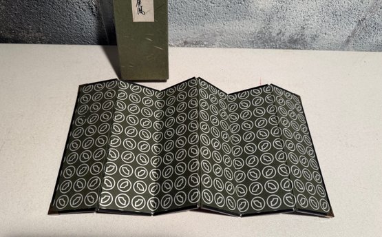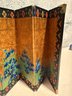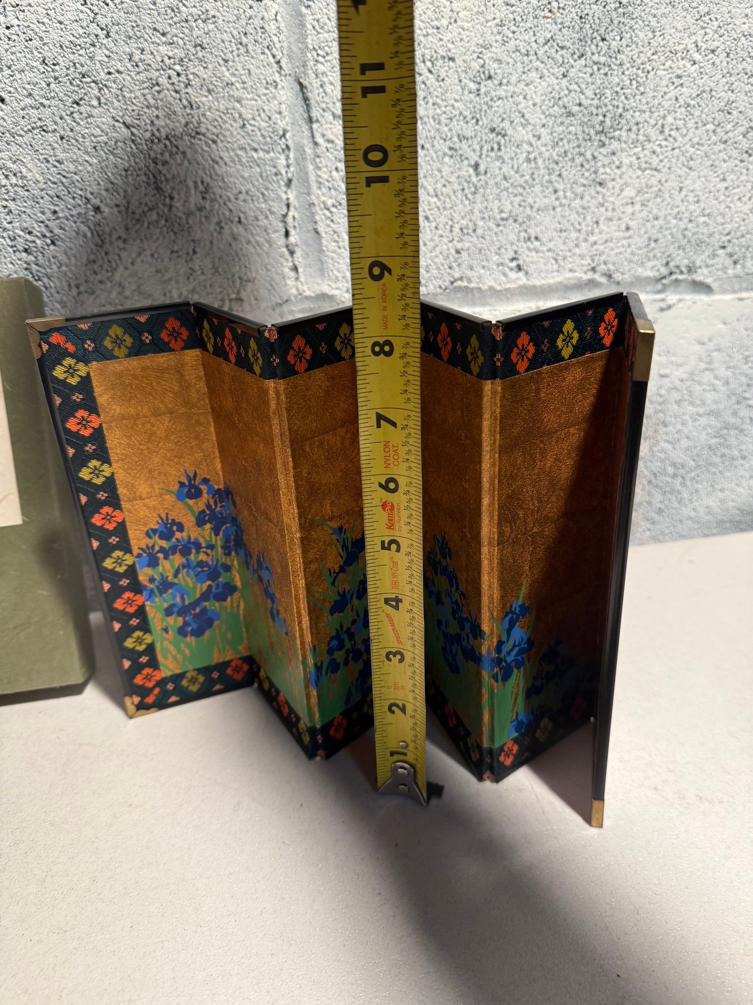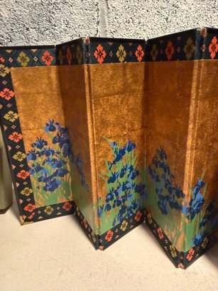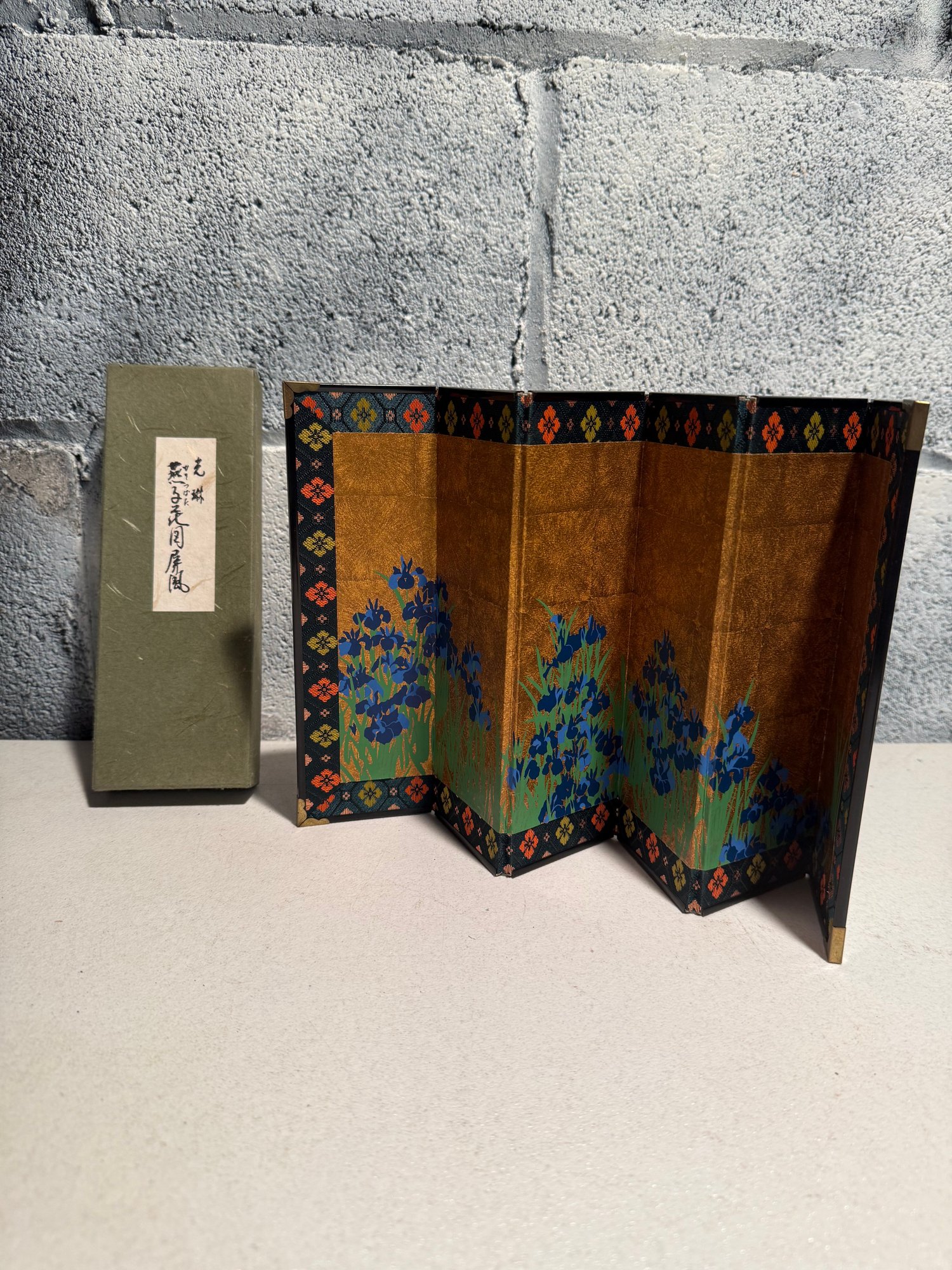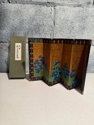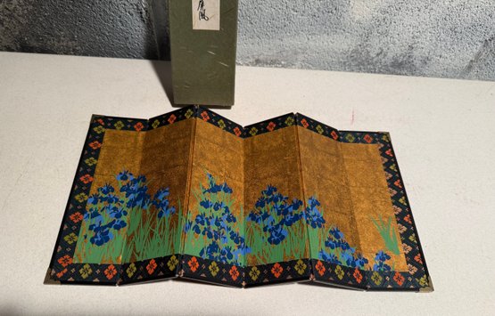 Miniature Japanese Folding Screen With Blue Irises On A Gold Background